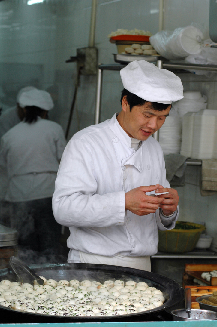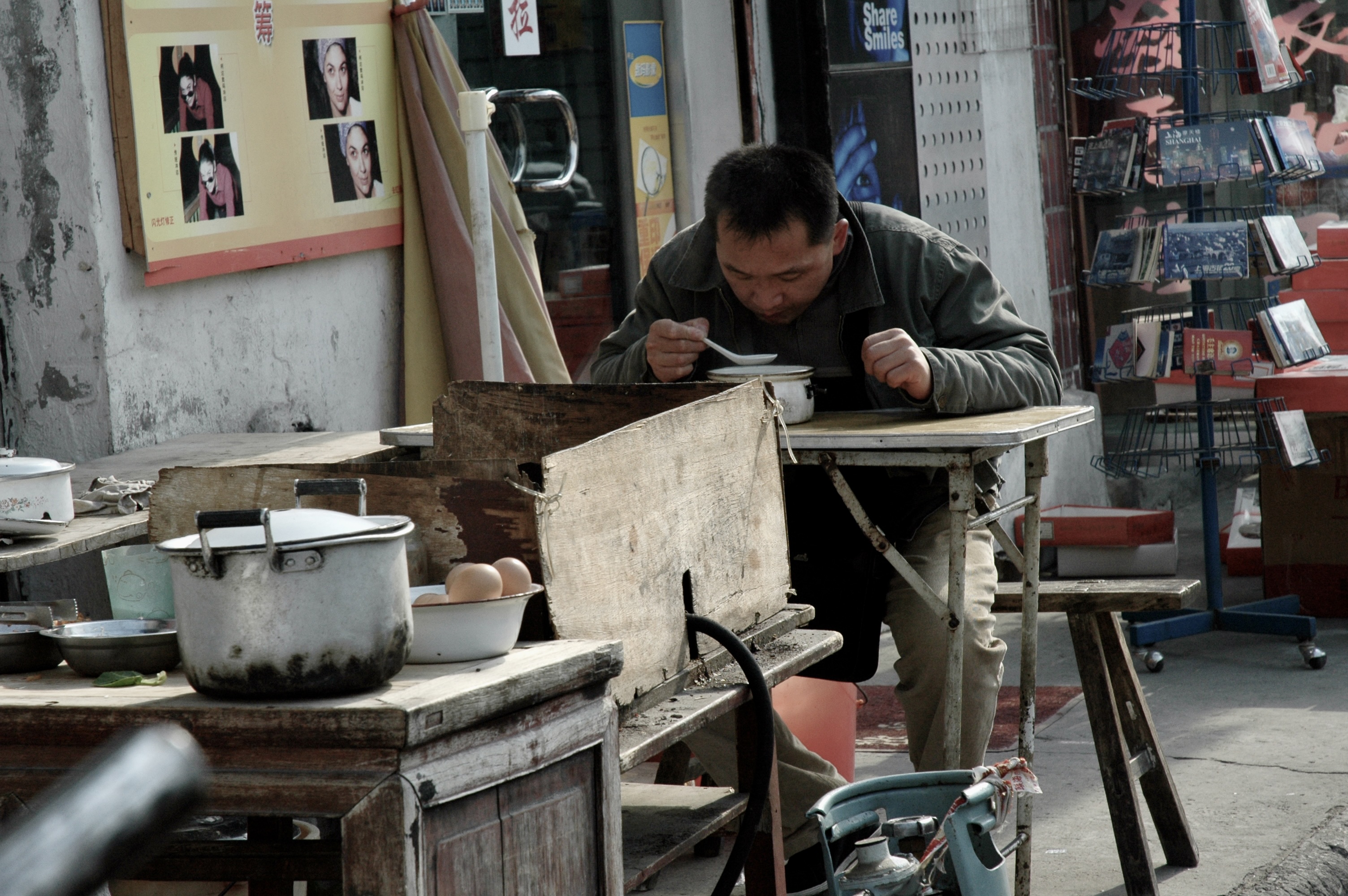 Anyway, at about 3:00 we realized we forgot to have lunch, despite the fact that there’s food all around.. little stalls, vendors cooking on the streets, and also restaurants and cafes… So, we stopped in a fairly local restaurant.. that was still serving lunch.. We were the only ones eating at that hour… No one spoke any English, but they seated us and then hurriedly found a rather ragged hand made translation of the menu… Took us a while to figure out the deal.. but it was one of those Mongolian style places where there is a big copper pot on the table.. You select from a small range of soup stocks… (we picked the yin and yang version — 1/2 very spicy (and they mean it) and the other half medium… (The copper pot is actually two parts… so you get the two stocks… then you select from a wide array of vegetables (not really sure what the selections might have been, since we picked green and green– and beef, and noodles, etc.).. It all comes in separate bowls and you cook it in the stock… They also come over with a cart carrying about 30 bowls of different spices and sauces… It was great, huge, and the spicy stock had about 100 red chilies… The little meal turned into an unexpected gem… The two waitresses who tried desperately to help us fish out all the red chilies so that we wouldn’t accidentally eat them… tried desperately to converse.. but we had no Chinese to offer and they had no English to offer..