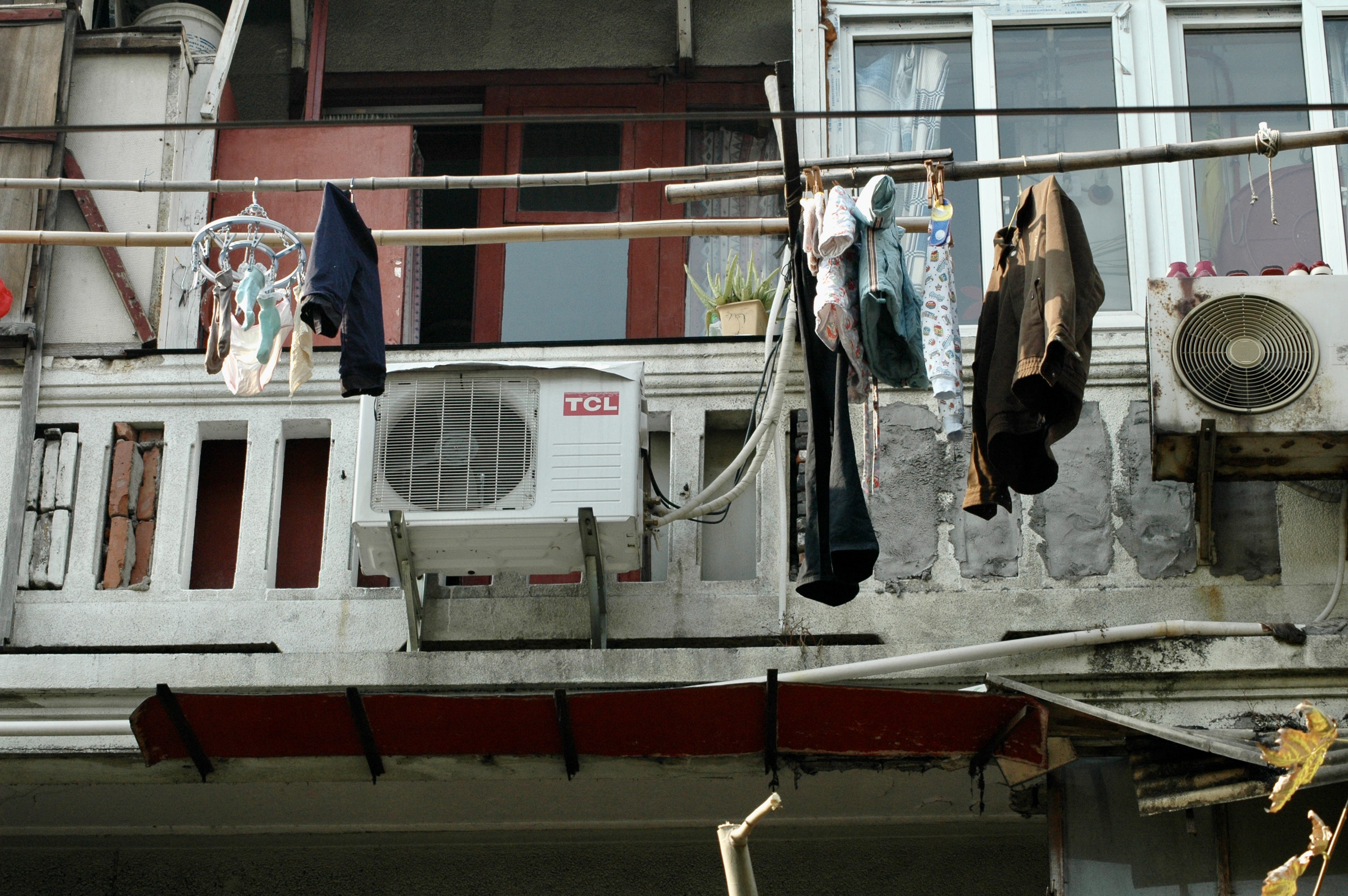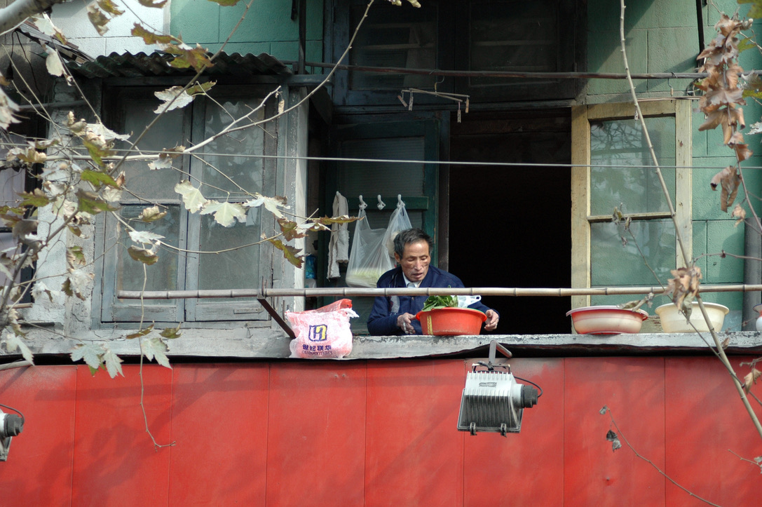 Today, we changed hotels… so we are in another part of town.. (and we have Internet access in the room). We walked along the Bund (the river edge) and then into different neighborhoods… hopping in and out of taxis (which are very very cheap) so that we could see very different areas of town that are quite far from one another.. Tomorrow we’ll take random Metro stops… As in Singapore, regardless of what floor you live on, everyone uses very long bamboo poles (about 12 -18′ or so) that perch in holders (kind of like flag poles coming off window ledges) that cantilever out and laundry hangs out to dry.. all the time… It’s bizarre to see these poles coming out on the 30th floor with laundry flying around… Mike is worried about liability.. thinking it is pretty dangerous if the pole drops… In the lower residential buildings, laundry is often hanging on the electric lines that zig zag everywhere… into a dense maze… As a result the city is ablaze in laundry… And as you can see from so many photos, I’m really obsessed with this laundry deal.