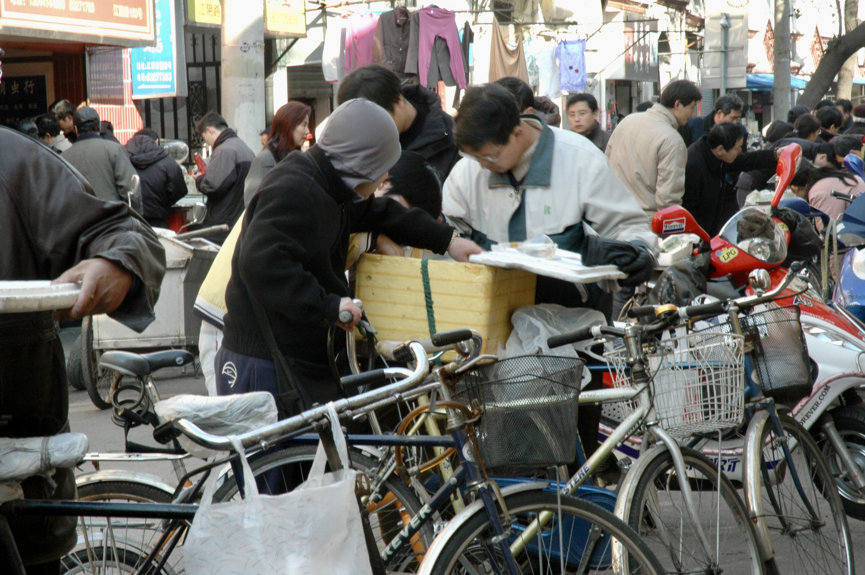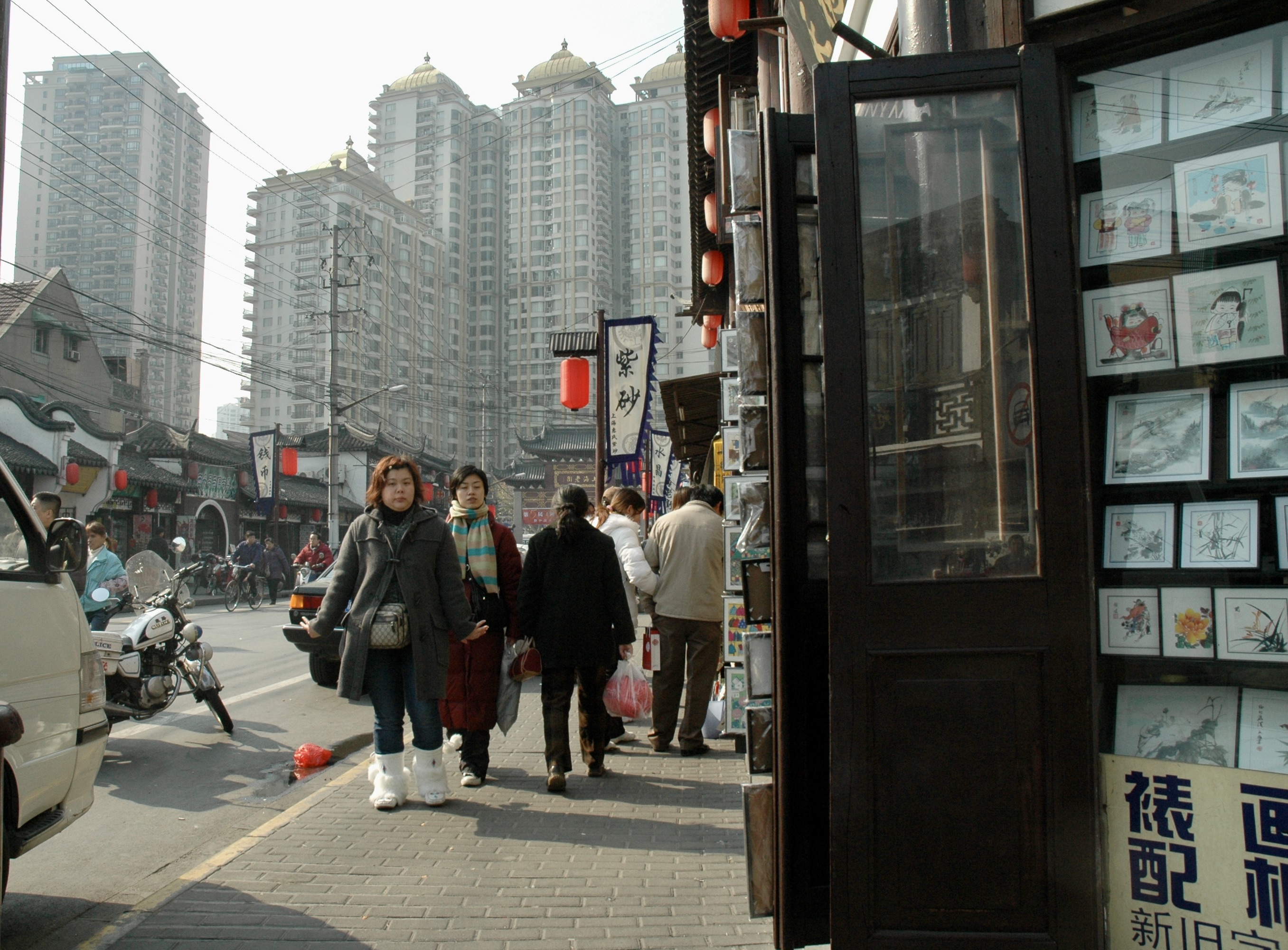 Having been museum-ed out from Day One… on Day Two (Monday) we set off for (and spent most of the day in) the old sections of the city.. meandering little narrow streets and markets and areas totally packed with small vendors… These parts of Shanghai were very reminiscent of much of Southeast Asia — Cambodia, Thailand, Laos, Vietnam, — and also totally different (and yet a stone’s throw) from the high rises and huge shopping centers of the “new Shanghai”… And while buses serve these areas, the main mode of transportation (and clearly the best way to get around) is by bike and motor scooter. It’s truly amazing that everyone seems to maneuver easily and accident-free (or at least from what we could see)… We eventually stopped at a little second floor tea house for some green tea (quite a ritual, even though we were not going for the ceremony..) Very quaint old tea house, with the usual array of birds in cages (like you see all over Asia)… including very loud parrots and mynah birds.. They were all squawking loudly, so we’re assuming they are bird flu-free!