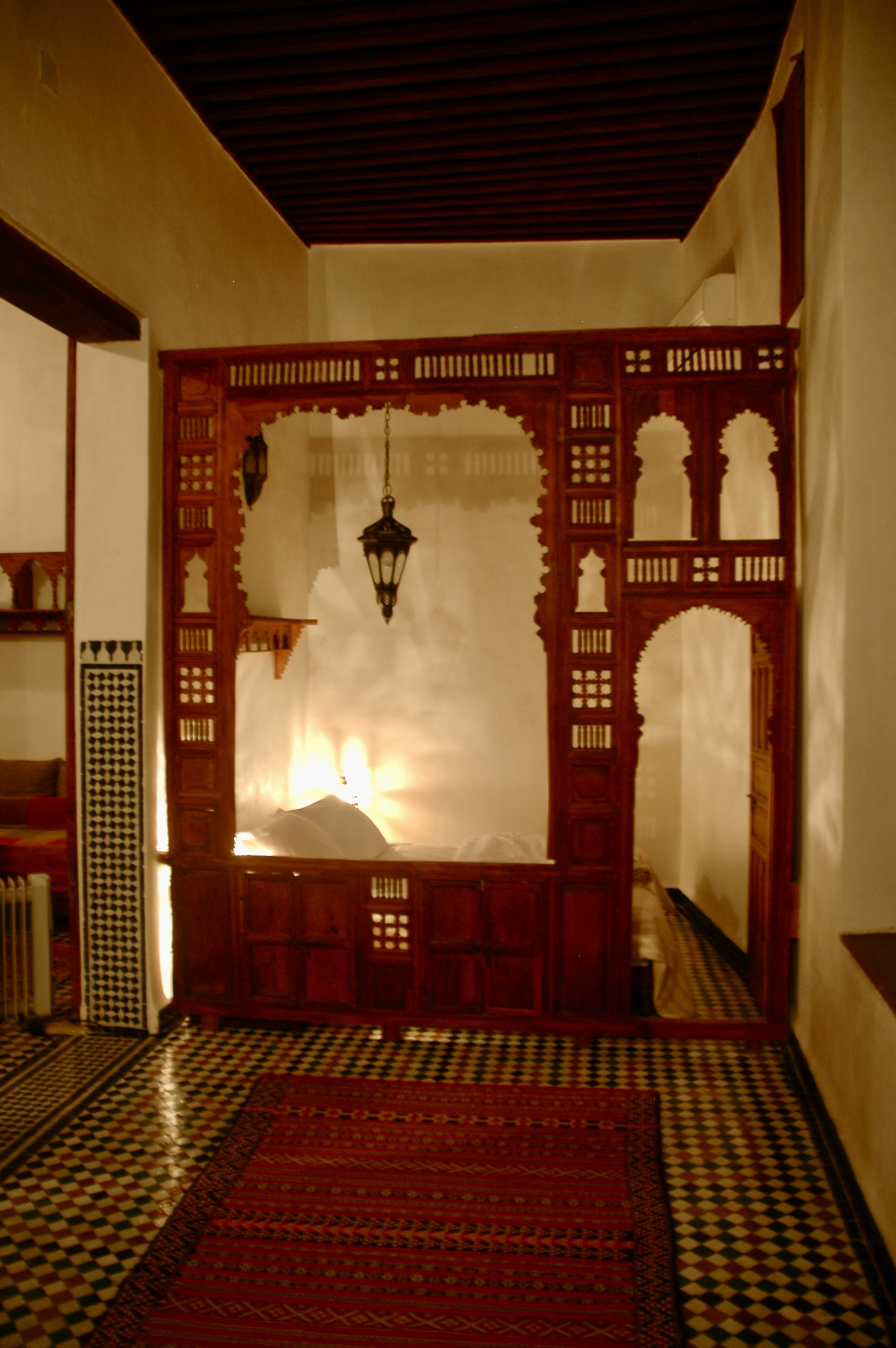 The medina is an unbelievable maze of more than 900 separate streets, mostly dead ends. It’s like walking through narrow caves. On normal days it’s buzzing with people and thousands of little shops, but because of the holiday (which goes on for 4 days and we are now finishing day 3) most shops were closed, making the experience surrealistic. The medina dates back to medieval days – the oldest in Morocco. After meandering for a bit, we started to ask people to direct us down these winding, narrow, sometimes paved alleys. I must say I was beginning to have my doubts. But alas, we were taken to #14 Sbba Lyouta and behind this very large, heavy wooden, carved door, we were escorted into a little paradise.