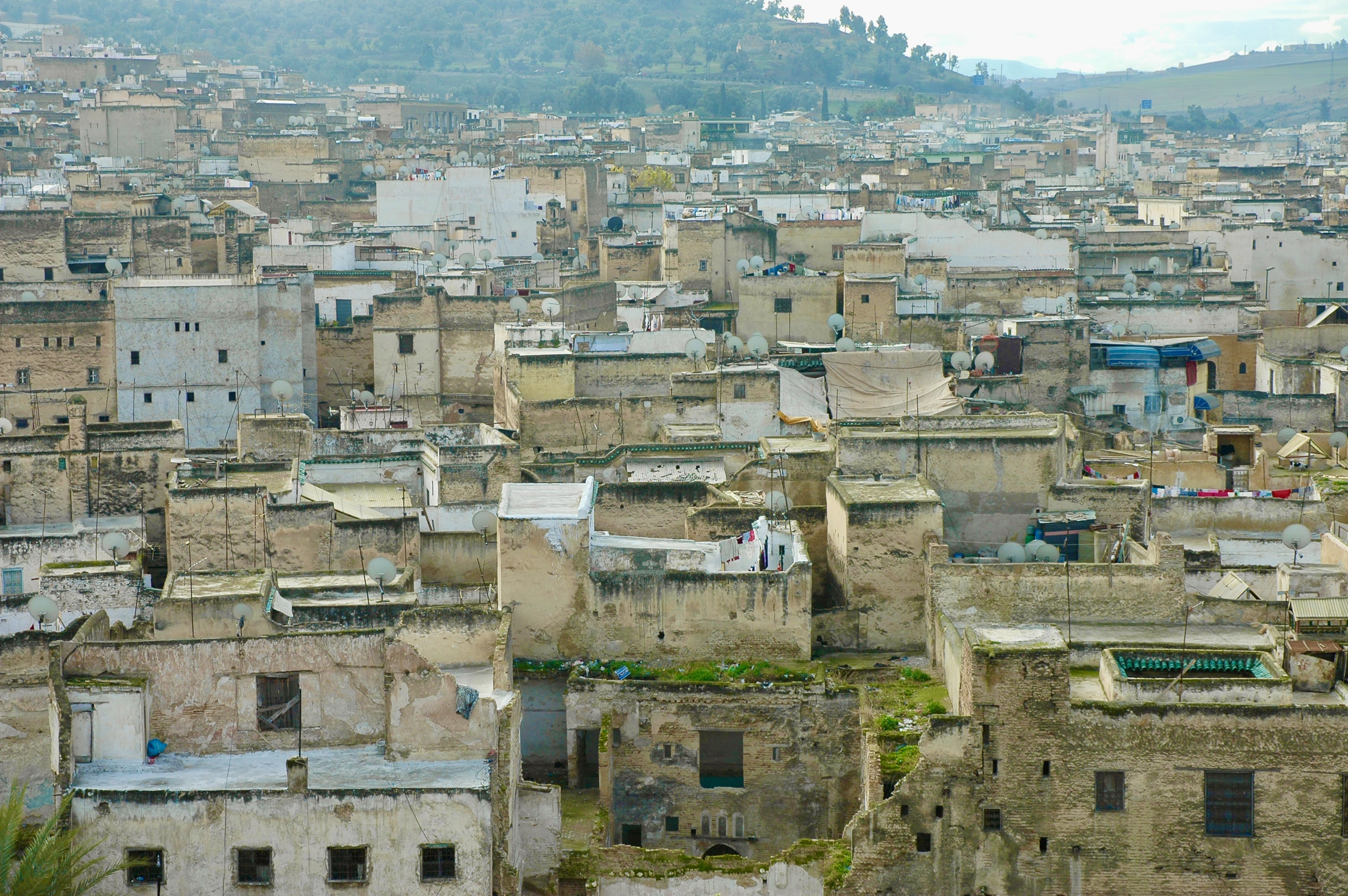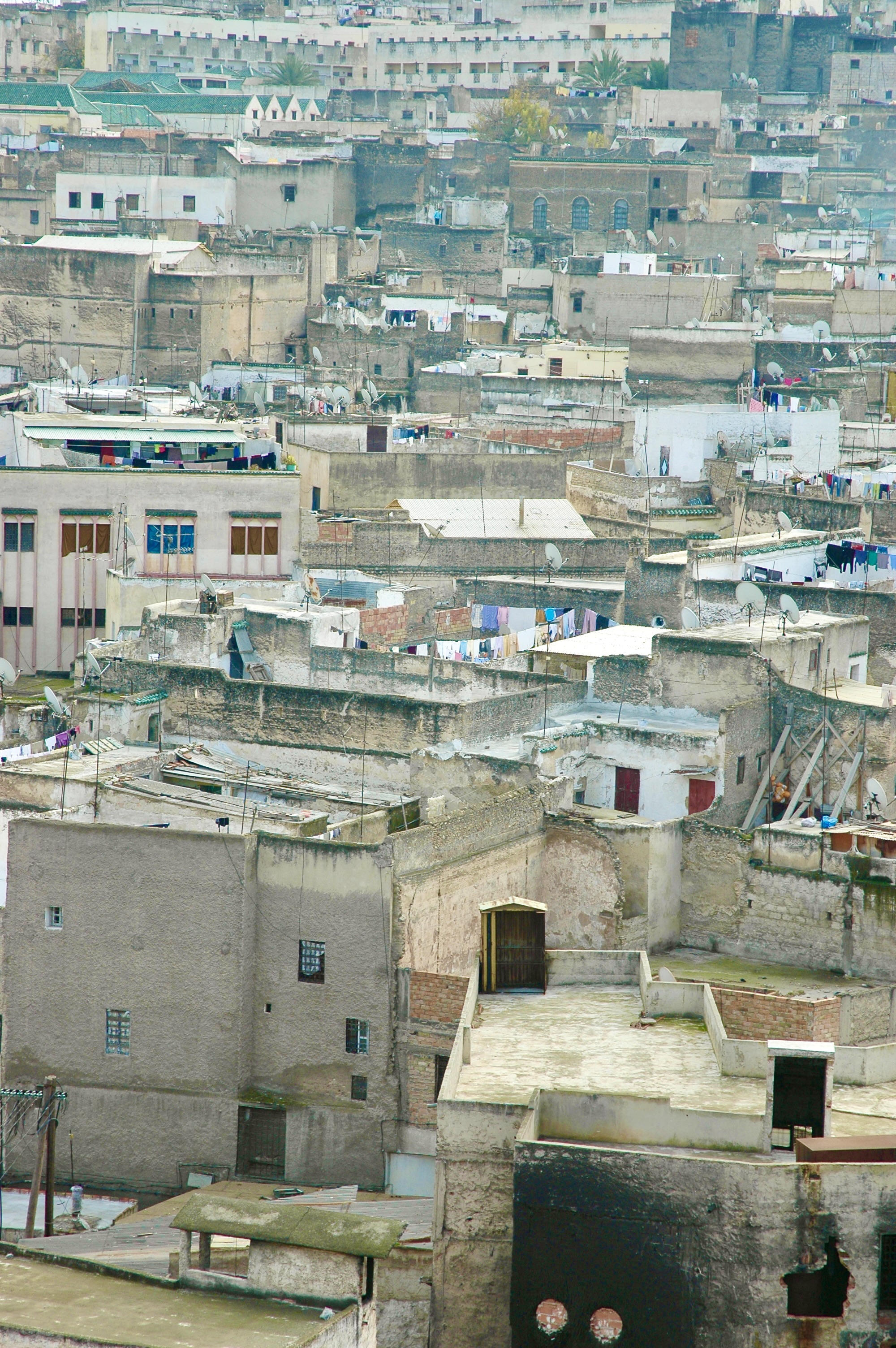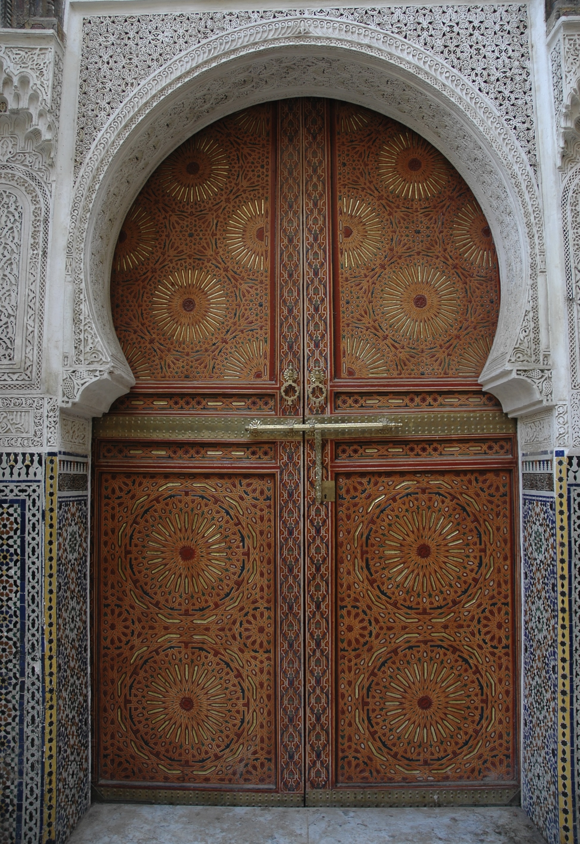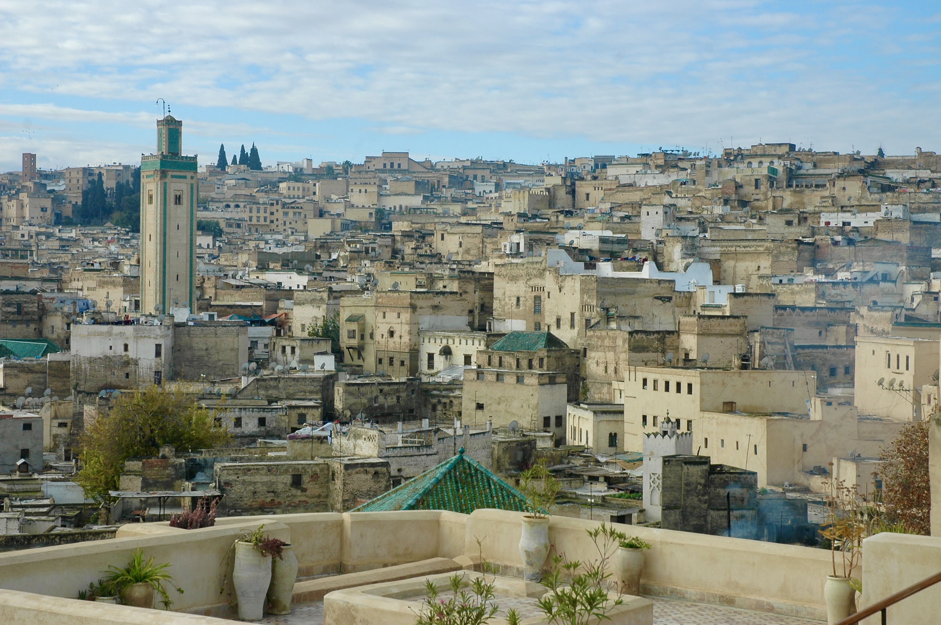 Well in the pouring rain of Rabat, we made it out of the medina, dragging our bags (wheeling where possible) to the petit taxi (they are all blue) to the train station. Spent a few hours on the train with an interesting Saudi pilot who had gone to Temple University in Philly – we heard his view of American politics and the American / Saudi connections, as well as his analysis of 9-11. Also got hustled by one guy who was supposedly working for the Moroccan Travel Agency telling us he could get us a great guide for Fes (where we were headed).. and that the recommended guide had taken Hillary Clinton and Bono around town! He then proceeded to call the guide – Mohammud (naturally!) – and had Mike talk with him. Mike told Mohammed that his wife makes all the plans.. so then Mohammed wanted to talk with me. I said we weren’t the “guide-type” and suggested he give us his number and that we’d call him if we were interested. (The old ‘don’t call us, we’ll call you routine’ – seemed to work.)