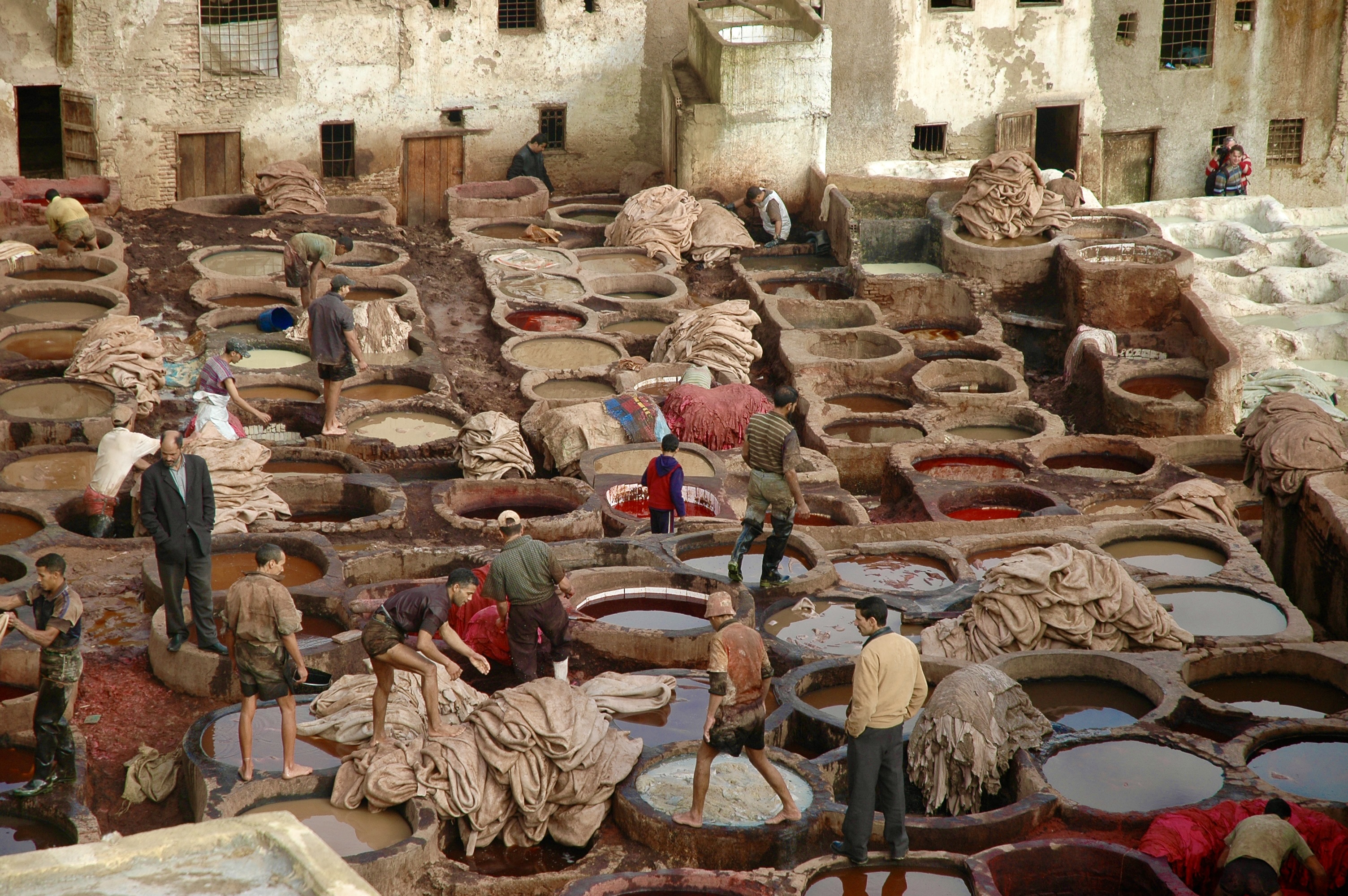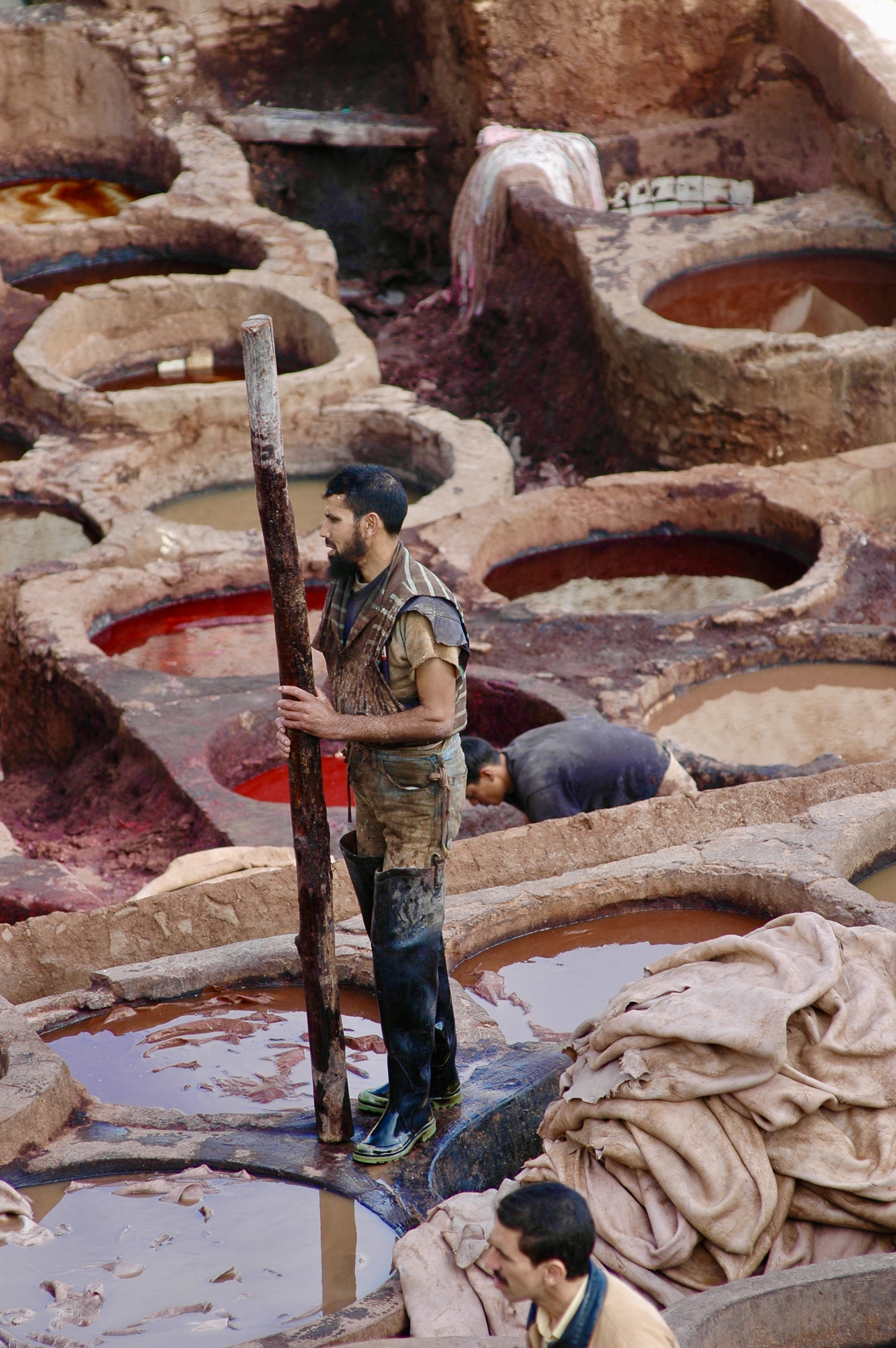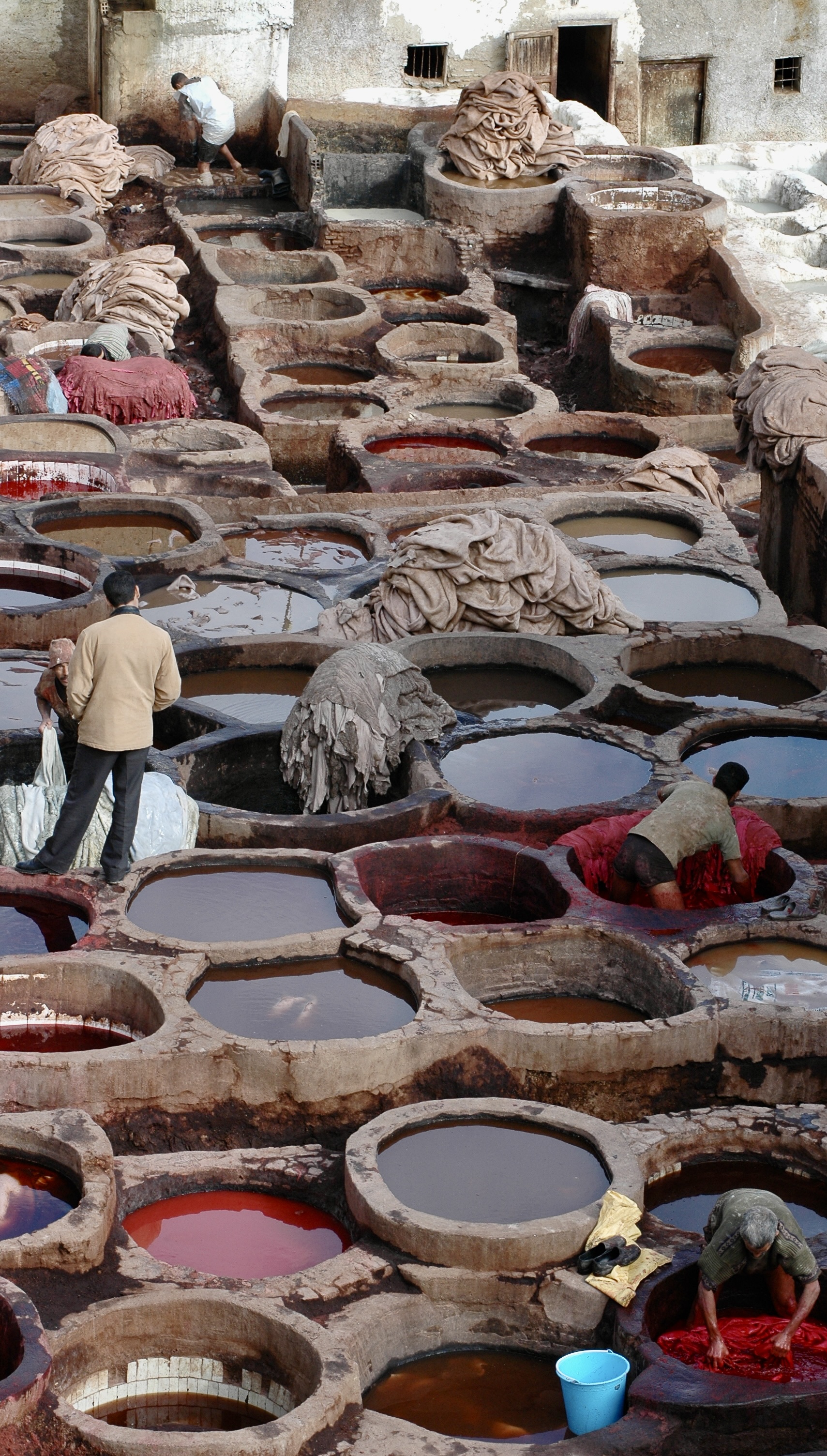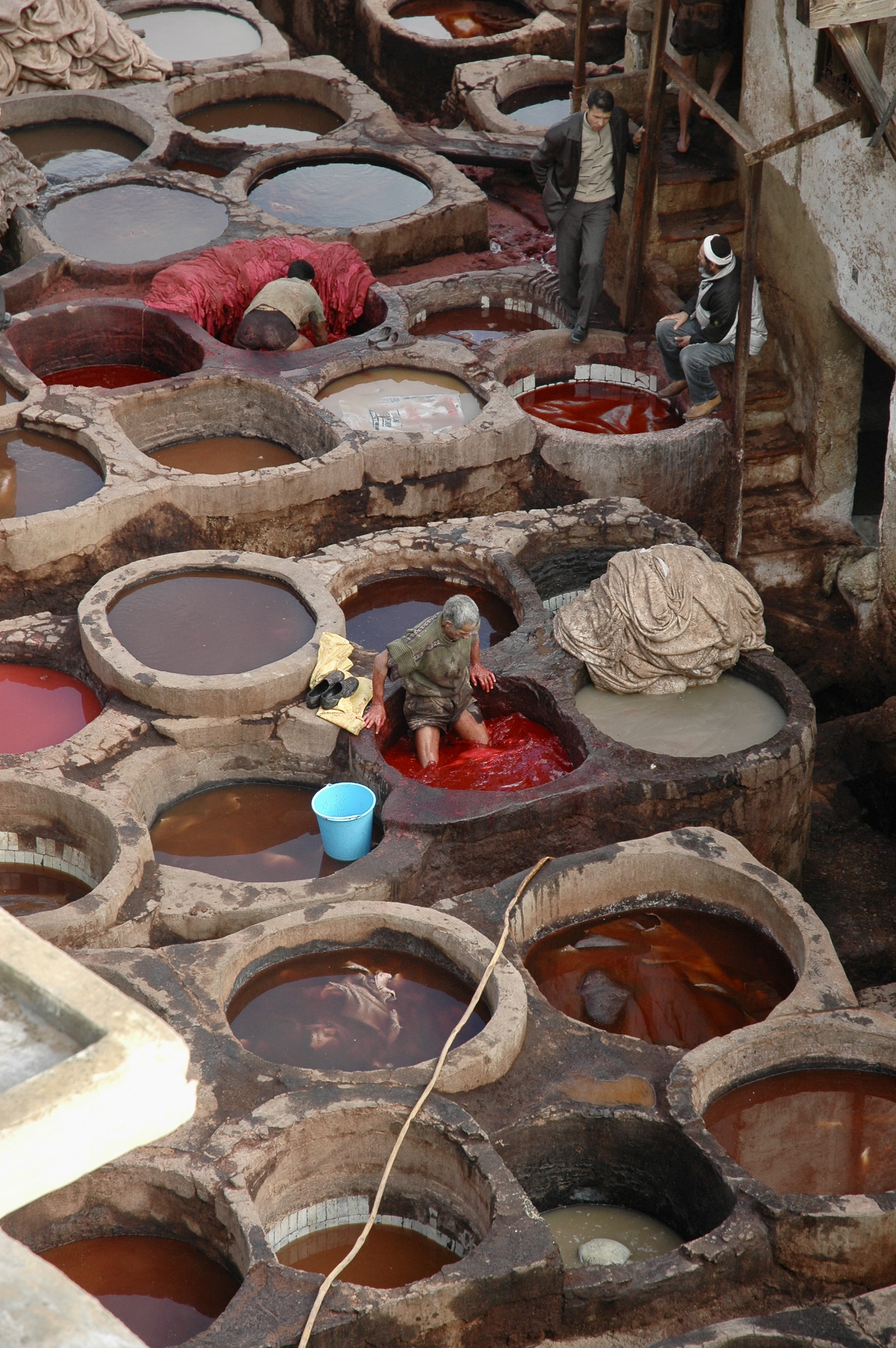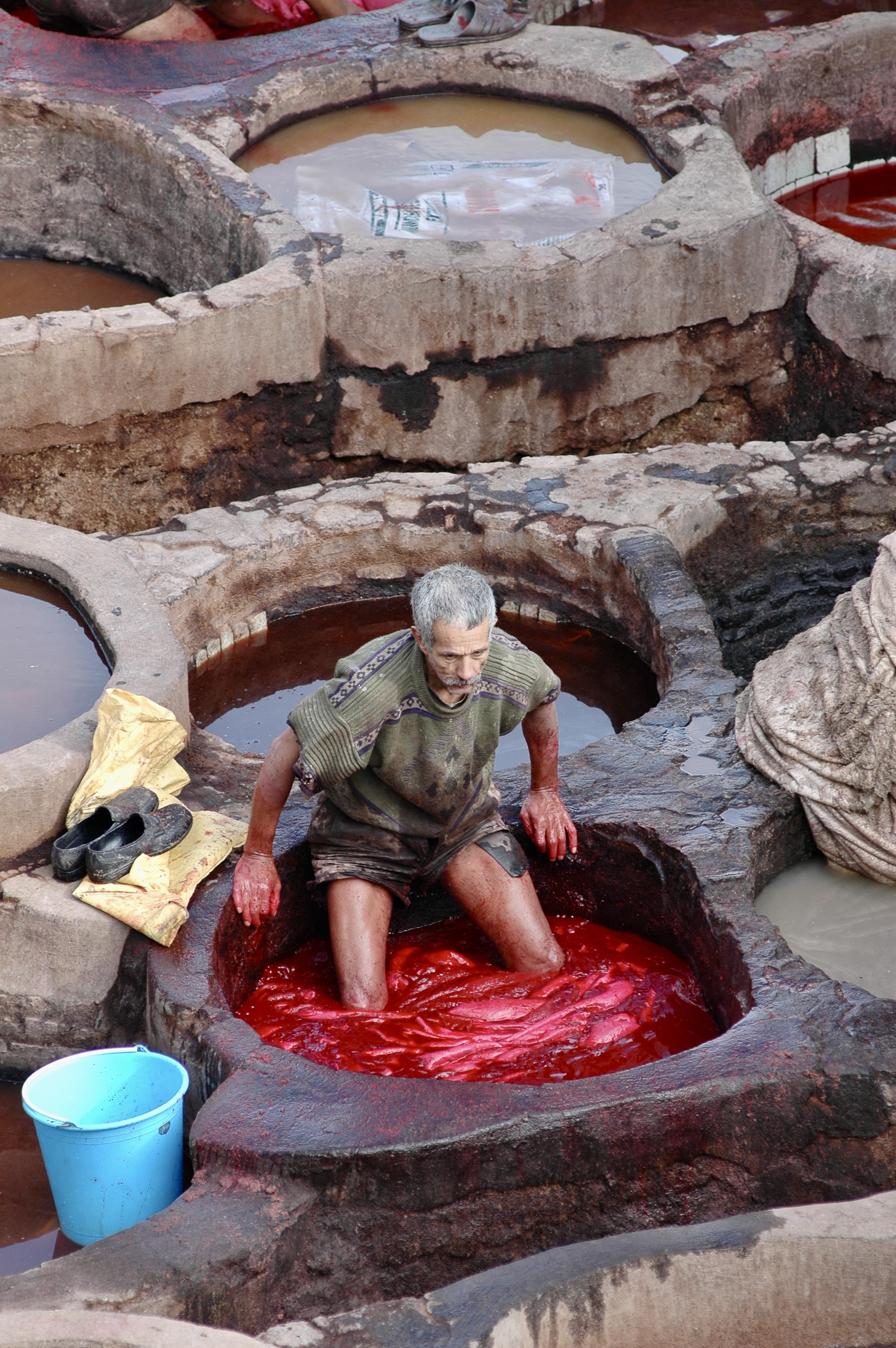 The sun came out today and we set out for the tanneries. An unbelievable sight (and stench). Apparently the skins (goat, camel, sheep, cow) are brought into the tanneries and after some kind of curing” process, the dying begins. There are about 50 vats that are knee-deep. The workers stand in these vats with the dyes (all natural sources) and step on the hides and pound them and swirl them around to get the dye infused in the hide. Each worker is in his own vat. The complete process includes the removal of hair and flesh, soaking, drying, and rinsing before dying… The dying vats have been in use for centuries. The steps include saline, lime, pigeon droppings, and then the natural dyes which include saffron, mint, poppies, etc. According to some studies we read, the tannery workers’ health is better than other workers and that there are theories that the foul-smelling liquids might contain some curative properties??? It’s quite a sight! (By the way they give you sprigs of mint as you enter the area, to cut the odor.)
