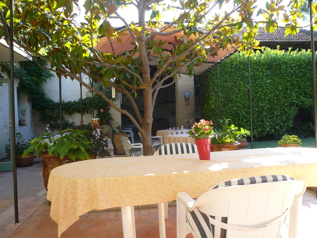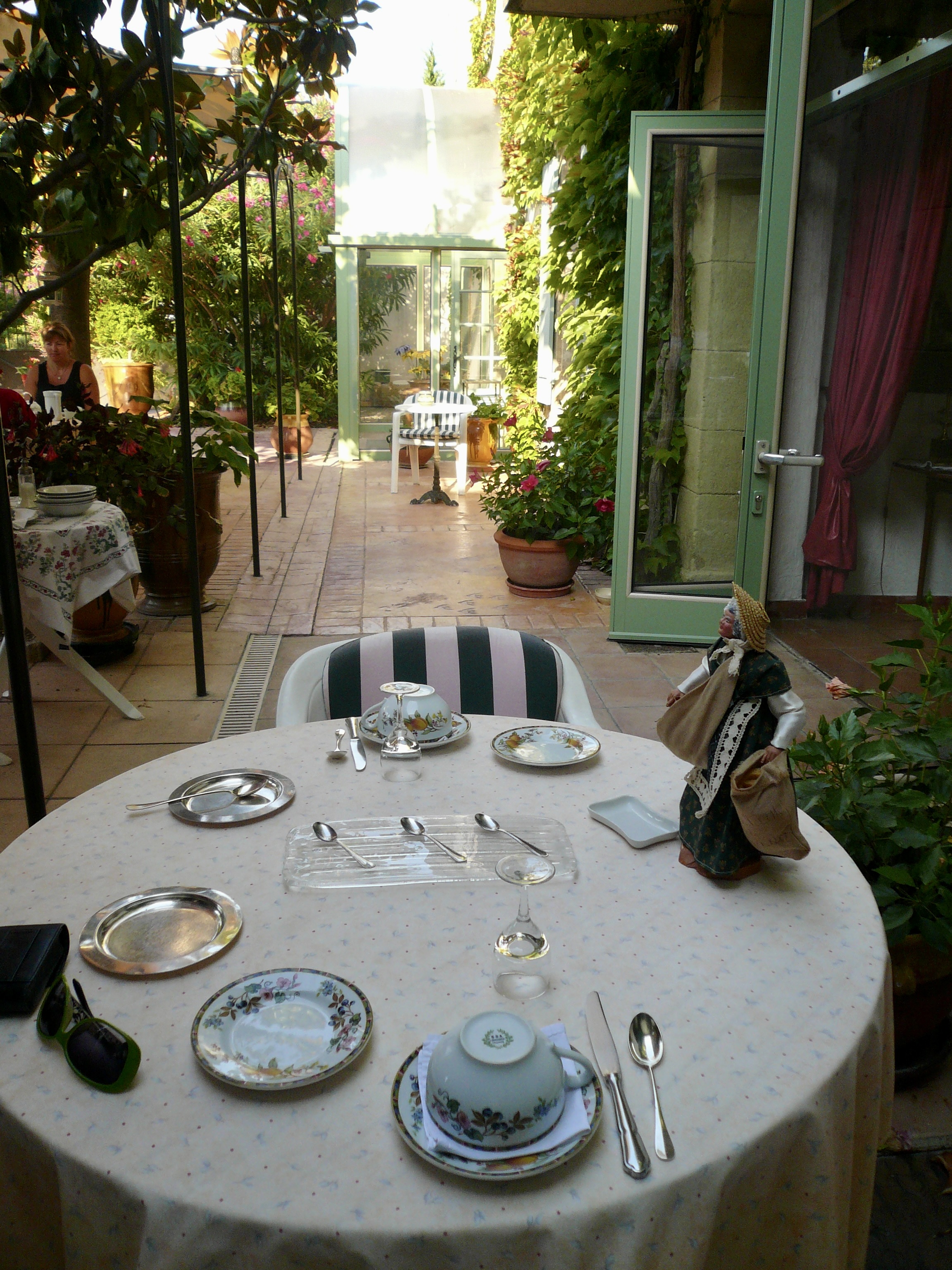 Our hotel is tiny — cute — and no one speaks any English, so we are getting by on my high school French. The rooms are fairly basic, but the setting is nice and we have breakfast each morning out on the patio…