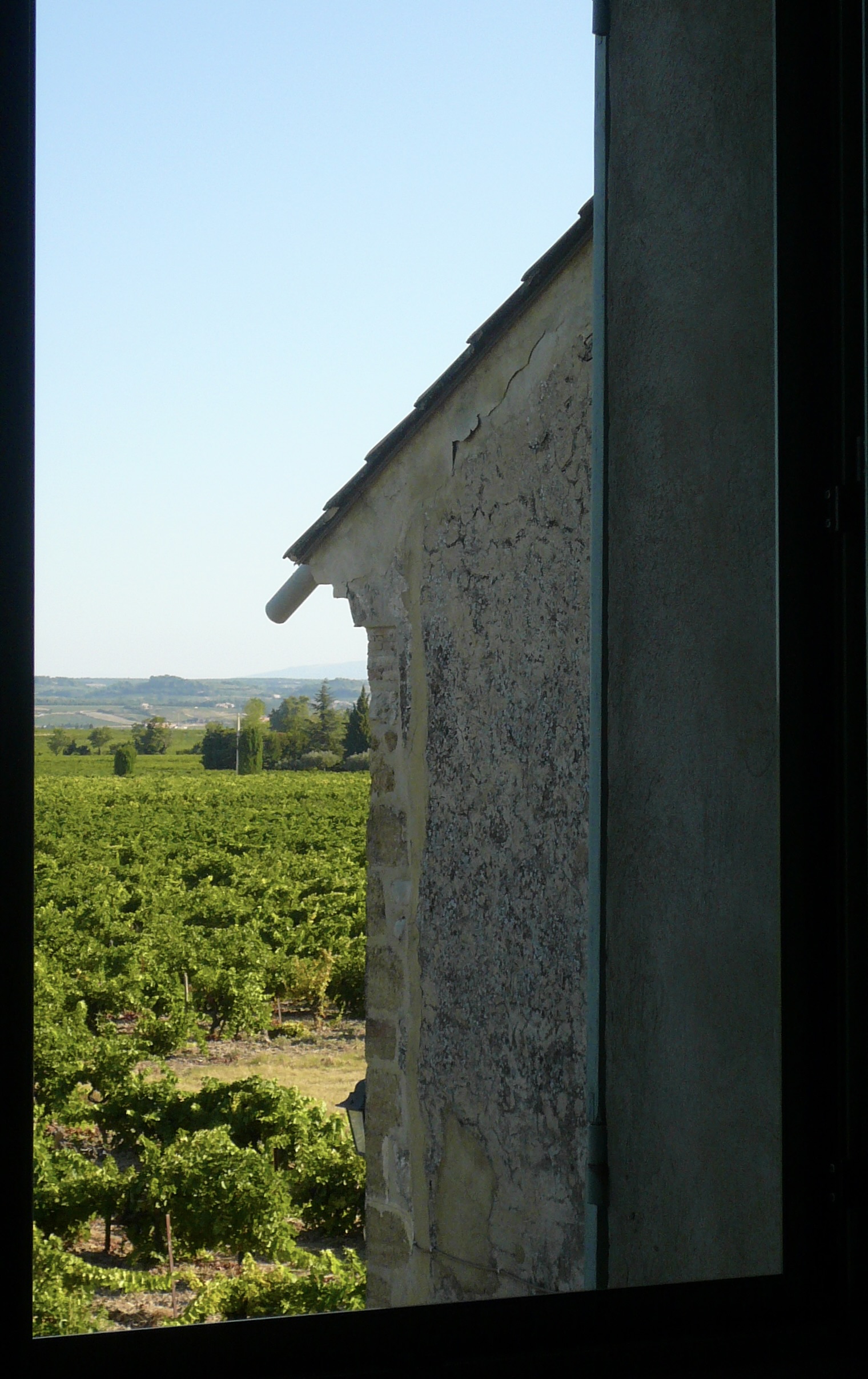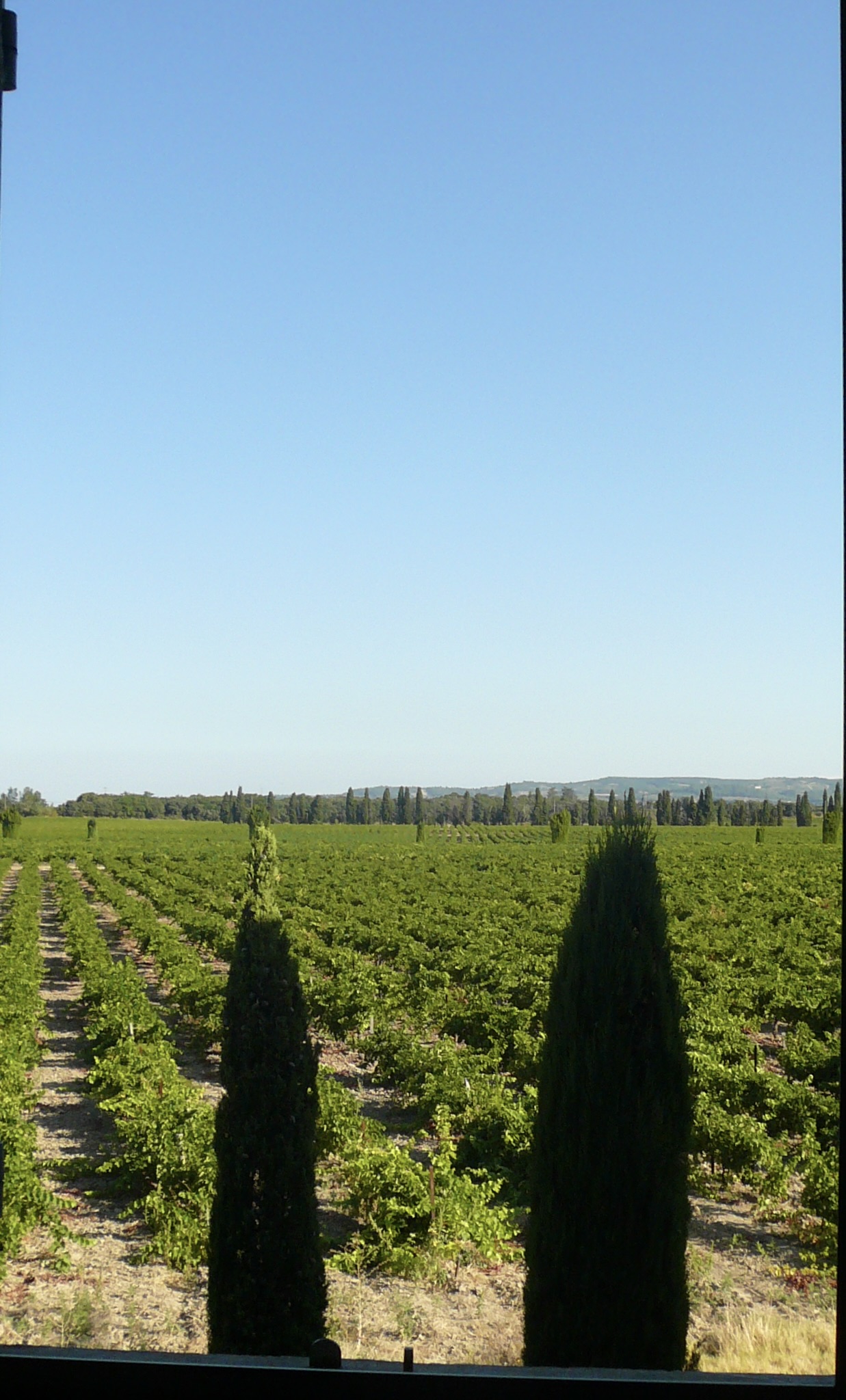 Anyway, flew to Marseilles, got the car and drove rather uneventfully to Violes where we are staying and then on (about 4 kilometers only) to Cairanne for dinner (rather late — fashionably European dining time at about 10 pm) with Mike’s brother and sister-in-law, at their house which is quite wonderful — situated in the medieval wall of the town — at the ring of the town circle at the top of the hill.. overlooking vineyards and beautiful French countryside..