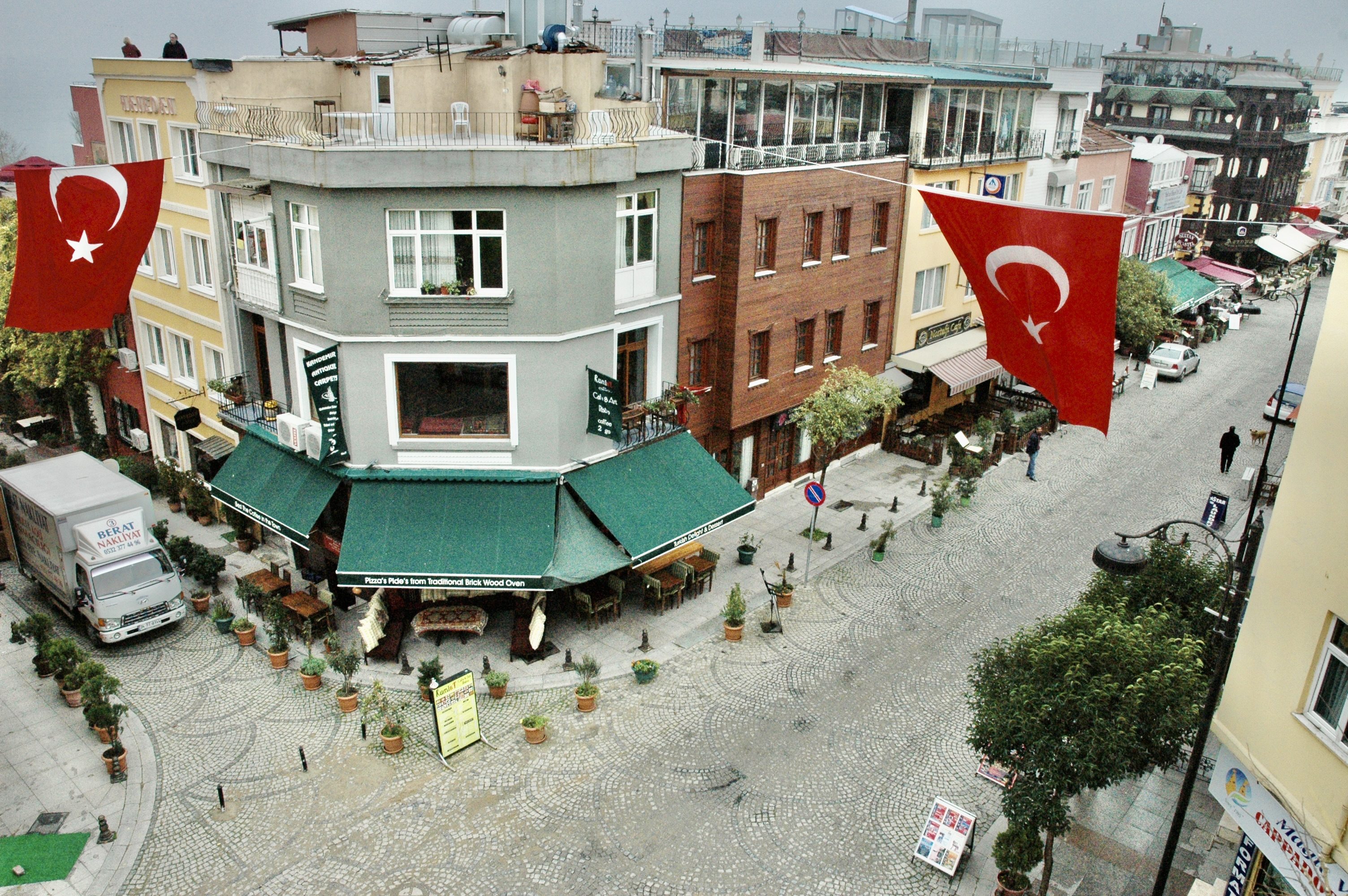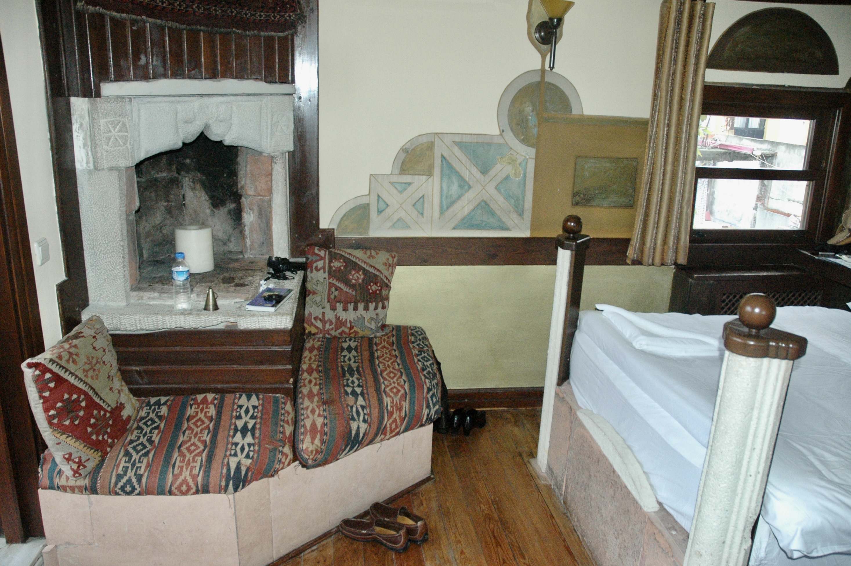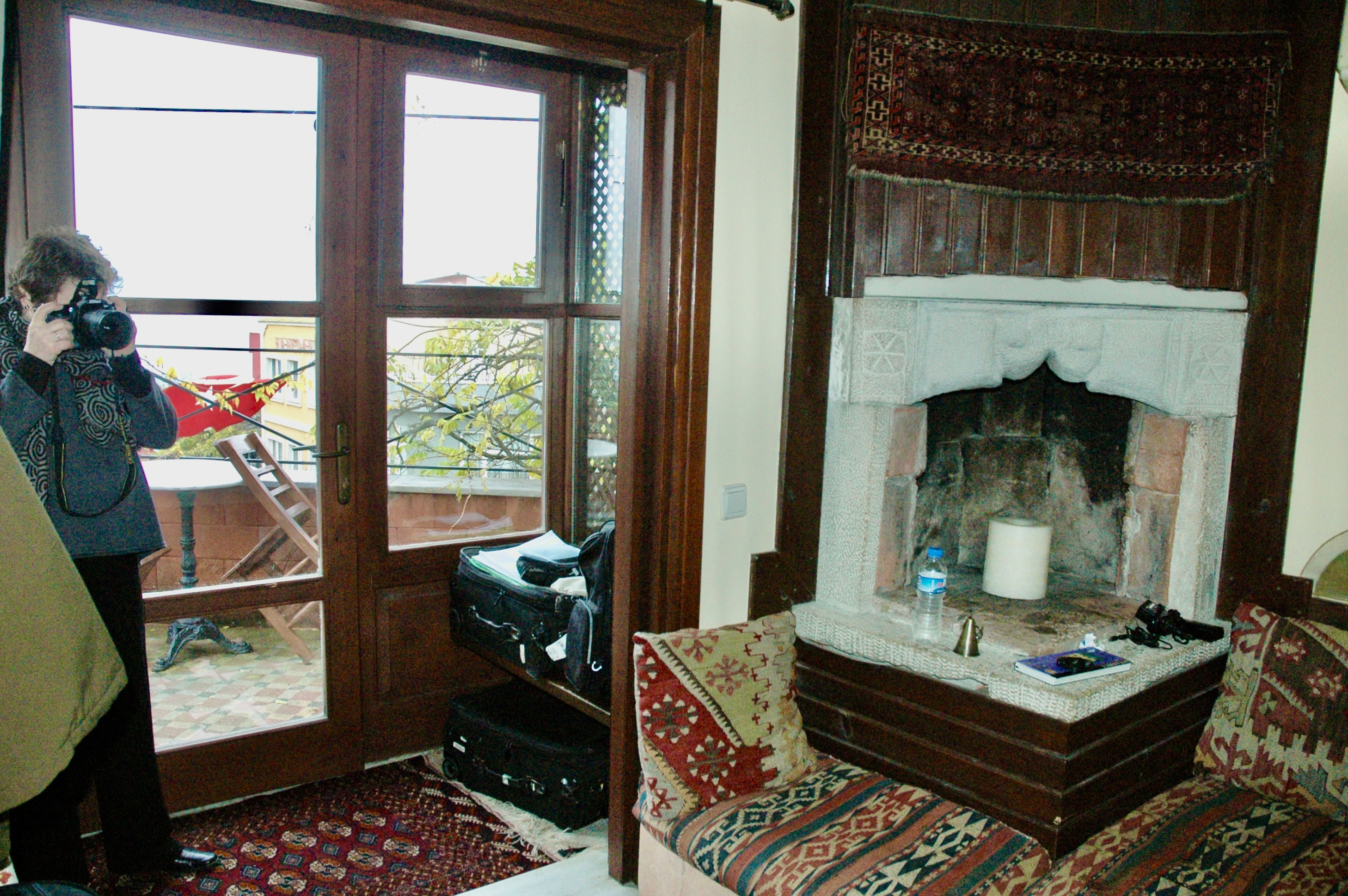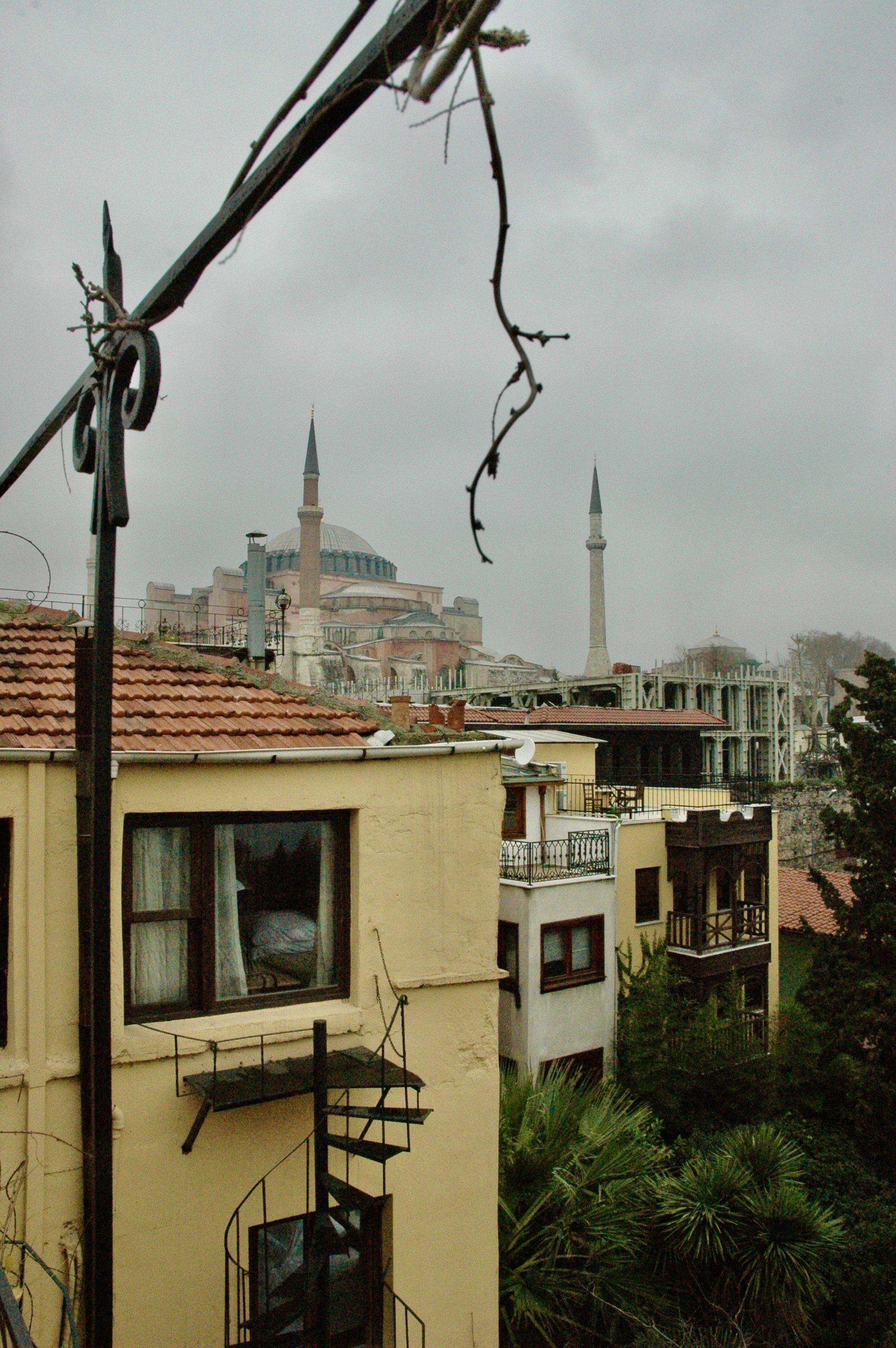 We arrived in Istanbul a bit exhausted having been up for about 40 hours and having put in the better part of Tuesday (Dec 15) as a work day at the office and heading to the airport for a 7 pm flight. Needless to say — what with the open house and a busy weekend, the previous days weren’t all that restful either. Anyway, we got to Heathrow without any problems and were prepared for a three-hour layover… but did not anticipate a nearly six-hour layover. We arrived in Istanbul at about midnight and decided to be wimps and take a taxi to the hotel (which is in the very old section of Istanbul – The Sultanmiet) -and the driver had trouble finding it. The hotel (Empress Zoe) is small — maybe 20 rooms at most, and quite delightful. We are on the top floor with a very sweet balcony that overlooks the life of the area. There are only two or three rooms per floor and five floors. Being on the top floor has advantages (like the balcony) and disadvantages — no elevator and only a very narrow and steep spiral staircase as access. Glad that the staff carried the bags up.. not really sure how they did it (and don’t think I’d even dare try it.) After doing a rather meager job of unpacking we fell asleep.