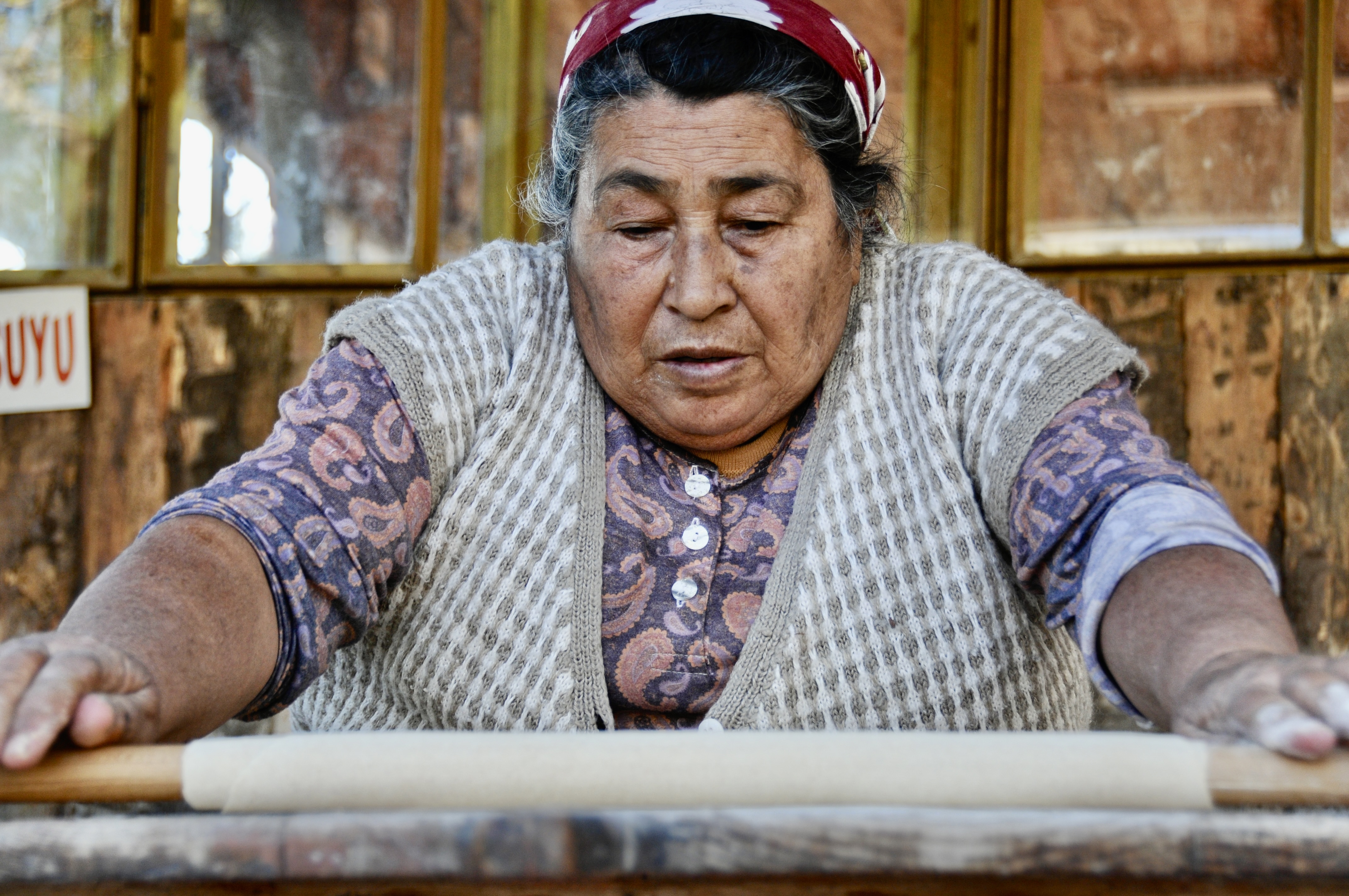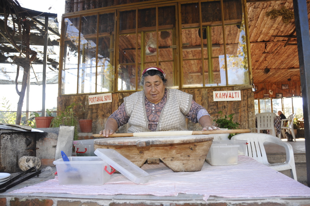 We walked through the site from one bay to the next.. and then headed out to Chimera and Olimpos. En route, we stopped at a tiny little roadside, family-owned “café”… a sort of wooden platform with about 5 tables totally open. No menu, only one dish is served (Turkish pancakes) and two kinds of juices that are constantly being squeezed fresh (pomegranate and orange). Mom sat on the floor cross-legged and rolled the pancakes – one at a time; son pressed the oranges and pomegranates; daughter-in-law filled the pancakes with just a little spinach and feta and rolled them up — kind of like a very thin quesadilla. The setting was wonderful — for those of you from California, think Nepenthe before they started getting totally yuppie and charging $20 for a hamburger.