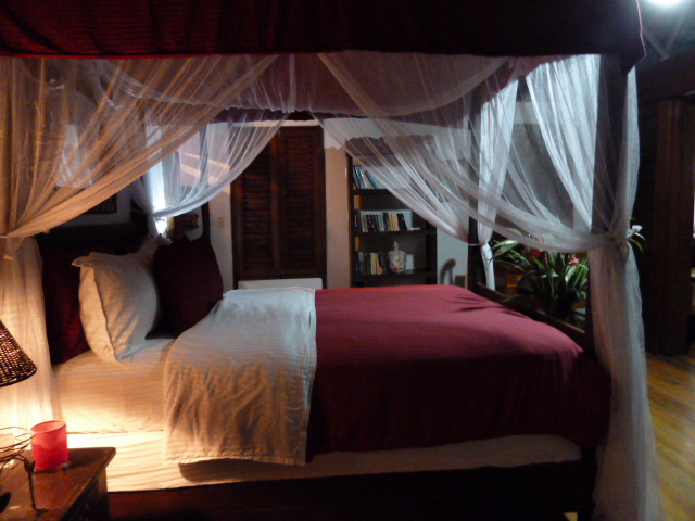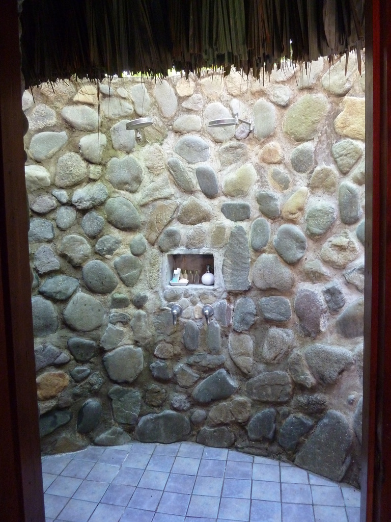 We are in the most luxurious jungle lodge imaginable. Nine cottages connected by stone paths on more than 90 acres. Our cottage is about 800 sq feet.. We have a little loft above our bedroom; a screened in patio with mango wood couch and chairs, a giant bathroom with stone tub, and a huge outdoor shower, surrounded by palms. From the patio we can see the waterfalls (there are several on the property).