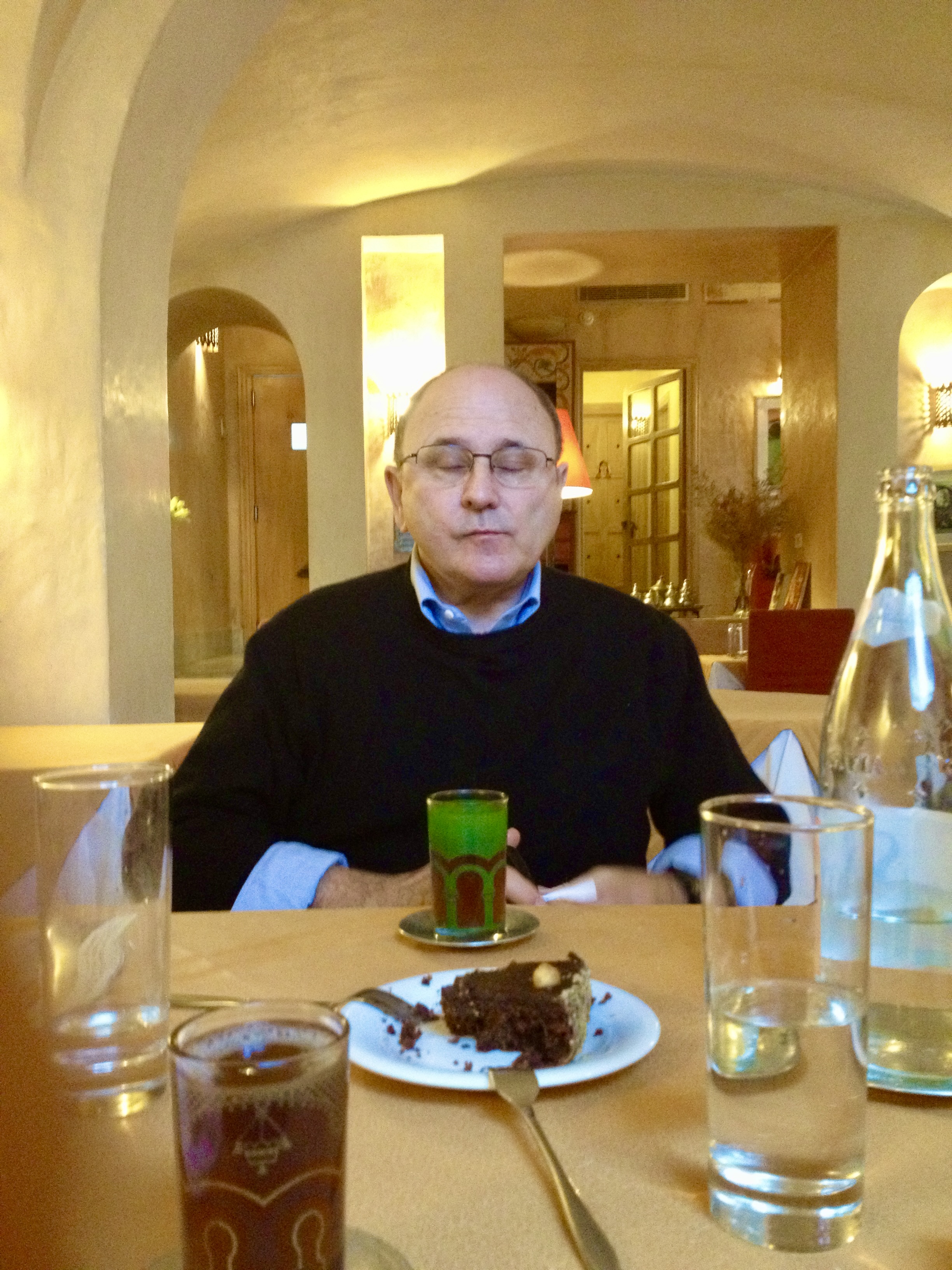Appetizer was some kind of tagine, but not at all like Moroccan ones..It had egg and lamb and vegetables all rolled up with some thin crust and I suppose cooked in a tagine.. then we had couscous with giant stuffed squid.. followed by what we would call tagine(?) of sweet lamb with apricots, raisins, dates, and leeks.. But they didn’t call it a tagine and it wasn’t served in a tagine. Dessert was some kind of cream smothered in cardamon powder.. They called it “black pine”… and of course the obligatory mint tea which is always refreshing and a great topper for the meal…