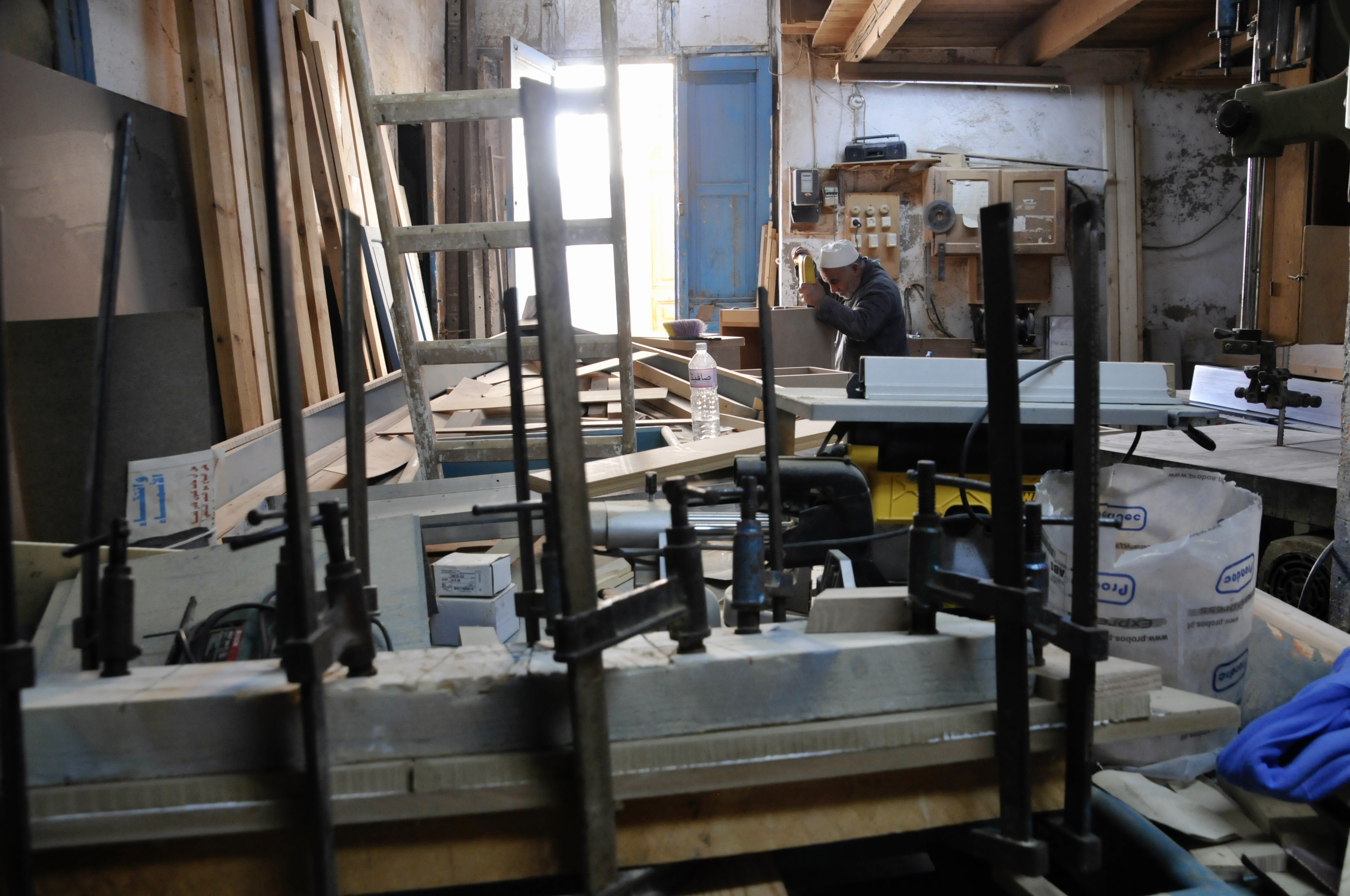 Anyway, we took a leisurely stroll through the neighborhoods again, stumbling onto all sorts of interesting workshops and life situations. Found two guys who make boats (real ones, not toy size).. building them in a tiny two-room workshop that is just big enough to hold the boat (the boat is big enough for about 6 people fishing) and for them to walk around it as they work. To get the boat out of the workshop they need to turn it on its side and then somehow figure out all the maneuvers to get it partially into the street and back up and twist it and go forward and back many times since the distance from the door of their workshop to the wall of the building across the way is not as long as the boat… at least that is what we can figure out. Struck up very long conversation in my non-French with the boat builders who were incredibly friendly and very anxious to talk with us.. So they are avid fishermen.. and they have caught one giant fish that was 50 kilos… And he gets his hooks from Germany where the steel is better and the hooks are larger than what you can get in Tunisia (very important information)… We also heard the story of the “fish that got away”… the one that was 90 kilos… but the story was interesting since the guy lost half of his finger.. the fish bit it off.. They had to get him to shore and to a taxi to a hospital and then a very good professor of medicine at the university/ a surgeon/ operated… It’s true, and he is missing one part of a finger. A very sweet guy… with many grandchildren — all of whom we saw pictures of on his cell phone. In the same teeny workshop he also seems to find room to produce some furniture which I think is the bread and butter work and the boat building is the passion.