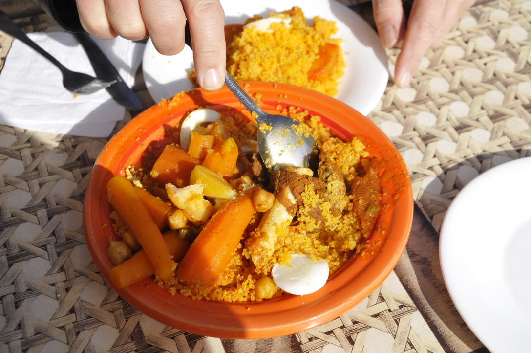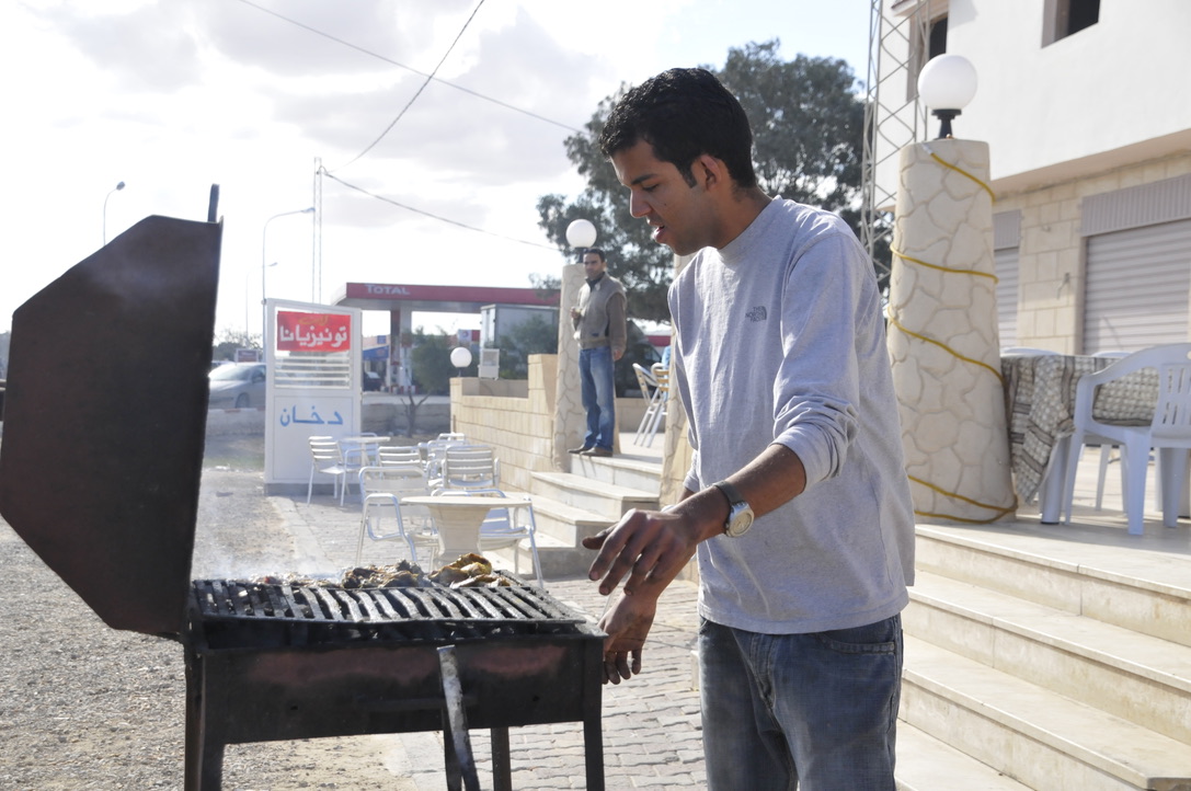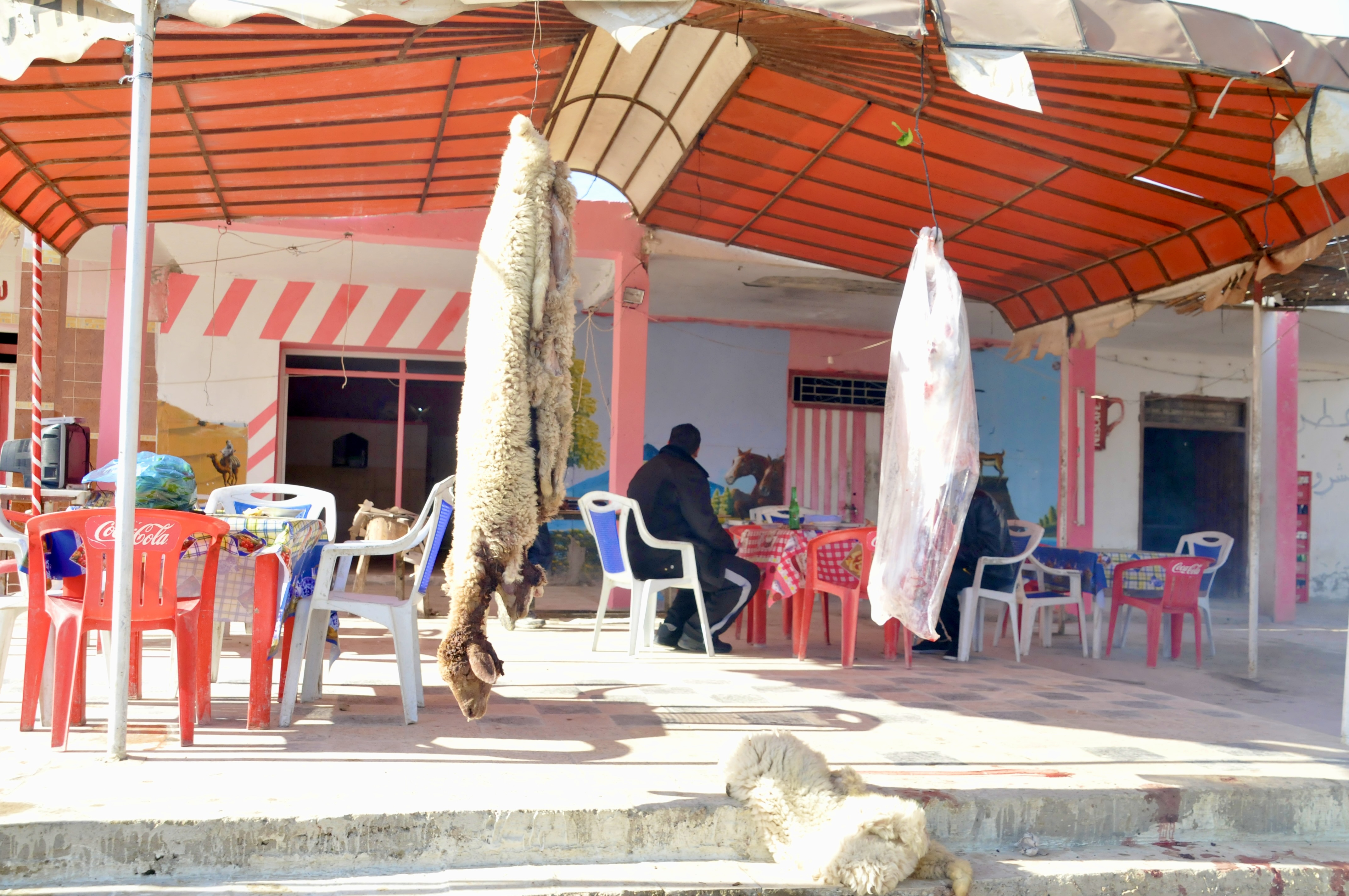 It’s pretty clear that this area was originally under water. Now it’s flat, scrubby brush, and lined periodically with very small complexes of stands selling assorted goods, including food. About an hour into the drive, we decided to stop for “lunch” at one of the roadside stands that we are now quite comfortable with. Seemed as if they were making some kind of kabobs on a barbecue. Sat at one of the plastic covered tables and ordered the chicken and also a cous cous. Chicken turned out to be an entire bird (tasty, just too much food) and the cous cous was definitely a meal unto itself. Ate as much as we could, and headed back out to the road.