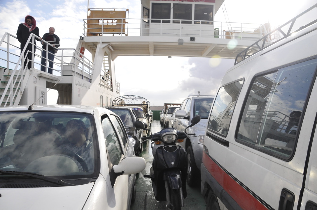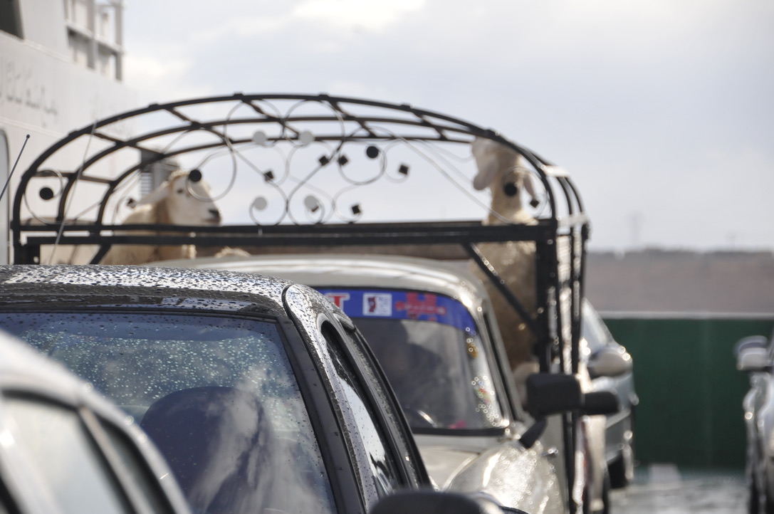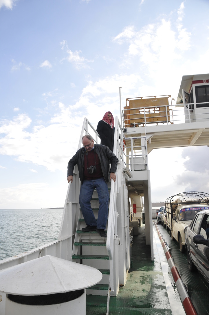 Since Djerba is an island, a ferry is a required part of the trip (For the two of us and our car it cost about 50 cents for the ferry.).. We shared the car deck of the little ferry with a few trucks that were transporting sheep to Djerba (perhaps to meet the same fate as all those hanging on the roadside..poor little sheep — don’t know what’s coming.). Very short ferry ride (would have been longer if we had found the right road and taken the right ferry)…