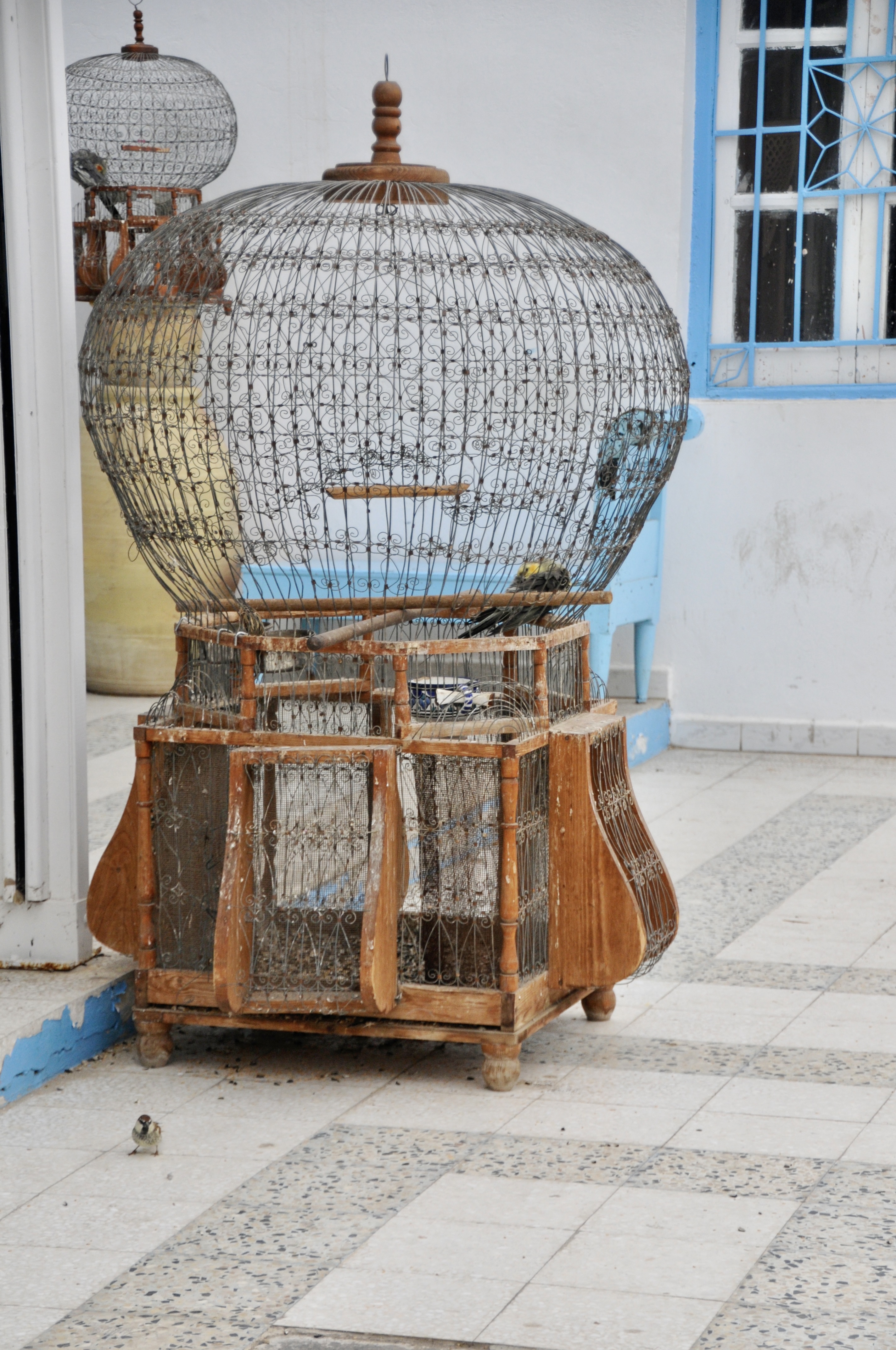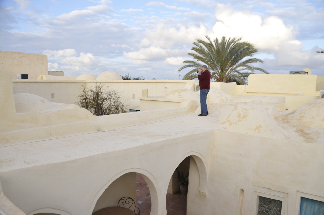 The island of Djerba is totally white stucco with blue trim.. consistent everywhere.. or 99.999% of everywhere. It’s a great image against the blue sky and the billowy white clouds. The topography is flat and low-lying; villages are all a few kilometers apart and each seems to have its own character. We drove to Midoun, walked the town, and had lunch in a tiny little cafe, where they had a terrace — actually it was their roof, which we accessed by climbing a ladder leaning against the wall. Once up on the roof, where there were three tables, the dividing line between the restaurant’s “zone” and the next building was a series of old doors lying horizontally.. not much barrier at the edge of the roof. We had some brochettes.. climbed the ladder down and found our way (miraculously) to the car.