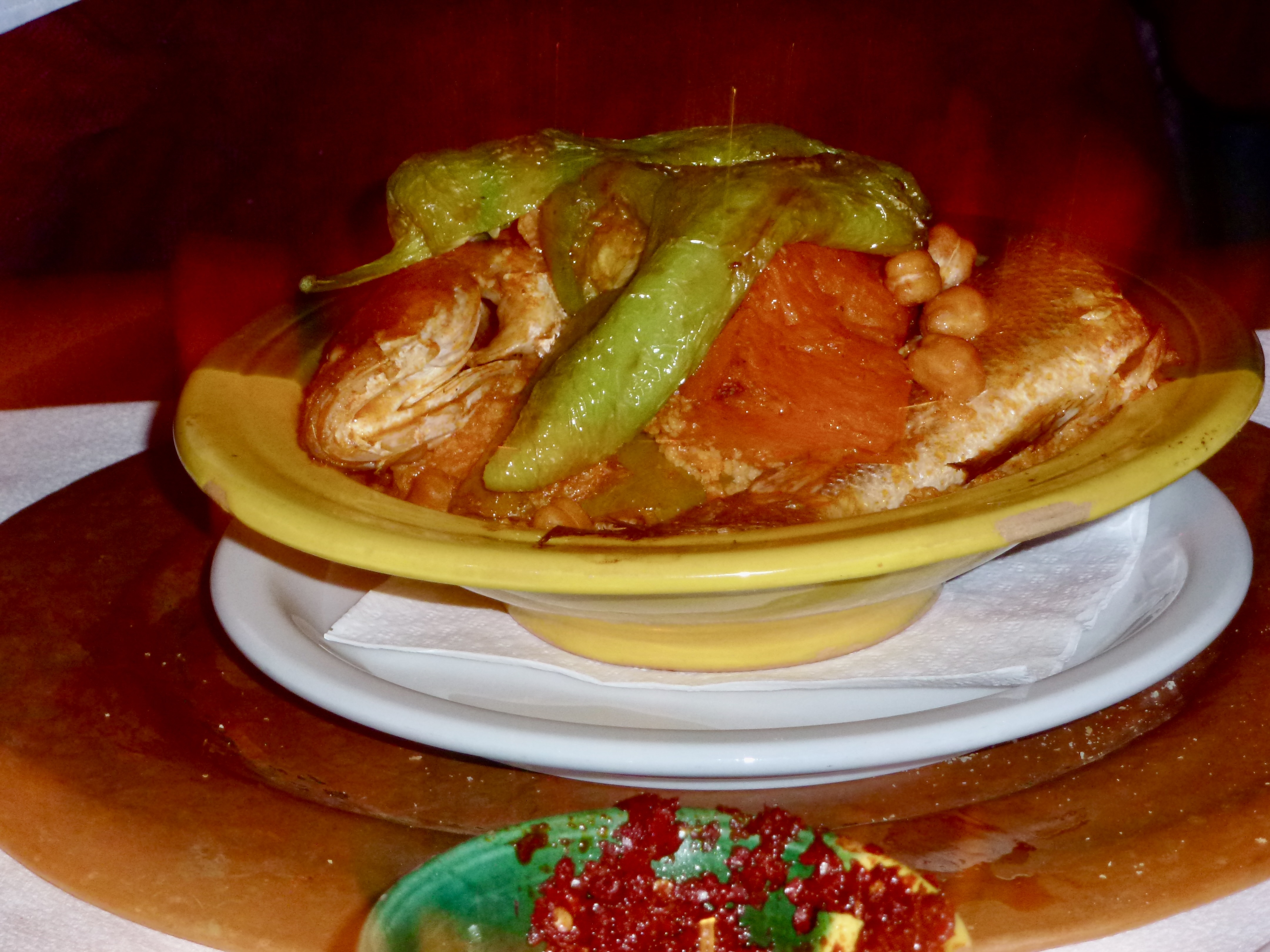 OK.. so now for the foodies — last night’s dinner in Dar Dhiafa did not disappoint (except for the strange cocktail that I ordered — comprised of Tunisian alcohol (a vodka type of drink) with a lot of fruits blended together.. Sort of like an alcoholic smoothie). Anyway — too rich, too sweet, and too thick for a cocktail. The dining room is small, charming, and elegant.. about 8 tables for 2-4 people at each table. Once we studied the menu and made our selections, we learned that the side of the menu we had been reviewing (with all the Dar specialties) require one day advance notice, so we ordered from the other side and made a quick decision to eat at the Dar again tonight to be able to order from the other side of the menu (a good decision since roaming around by car when it’s dark is difficult since streets are not labelled very well.) So we had an appetizer of small sizzling shrimps cooked in olive oil with tomatoes and onions and some spices (very good.. ).. and main courses of lamb noisettes grilled with fruit and stuffed with a tiny bit of cheese… and dorade – grilled and de-boned with vegetables. And a bottle of Tunisian red wine. Tunisian wine is quite good, not very strong.