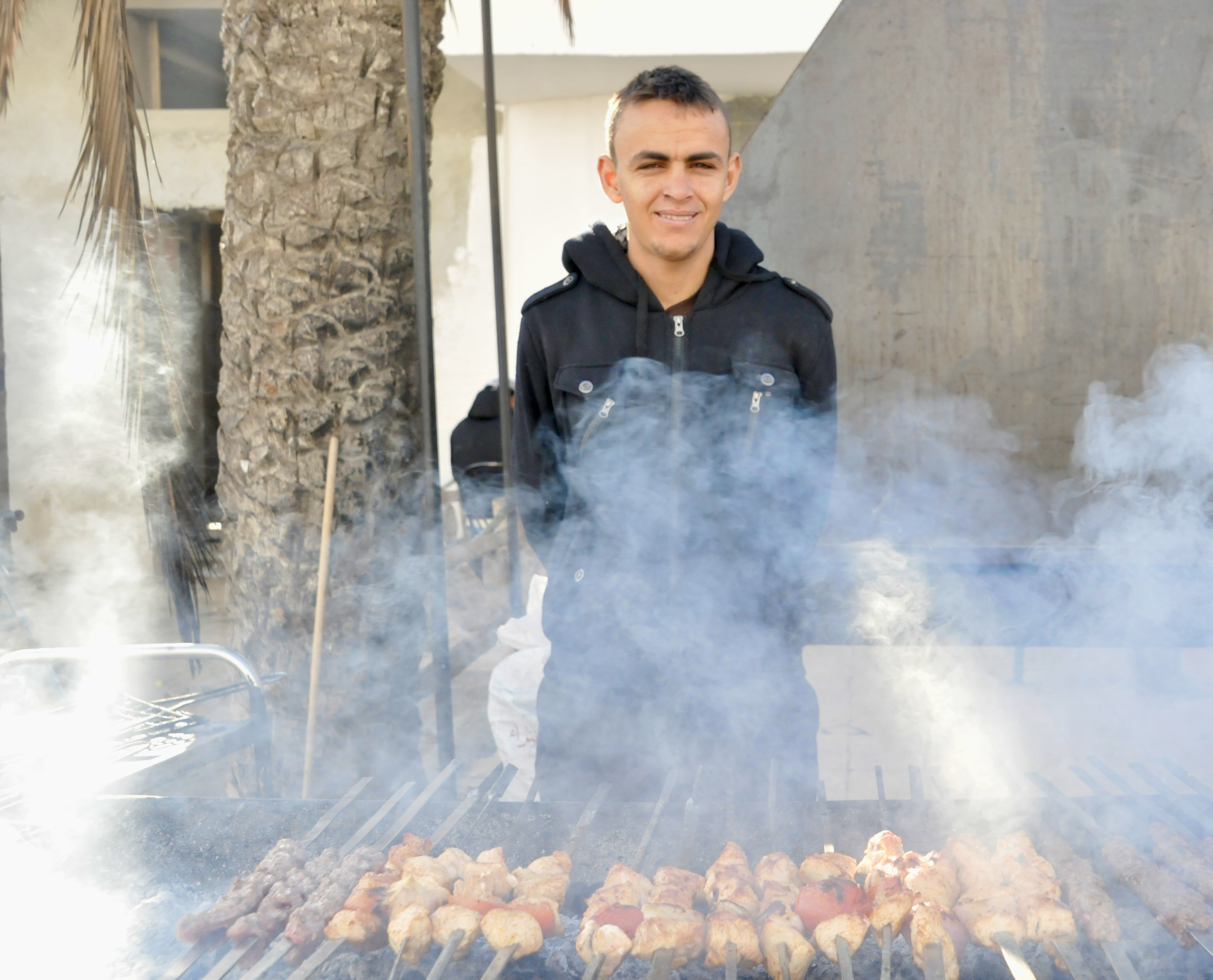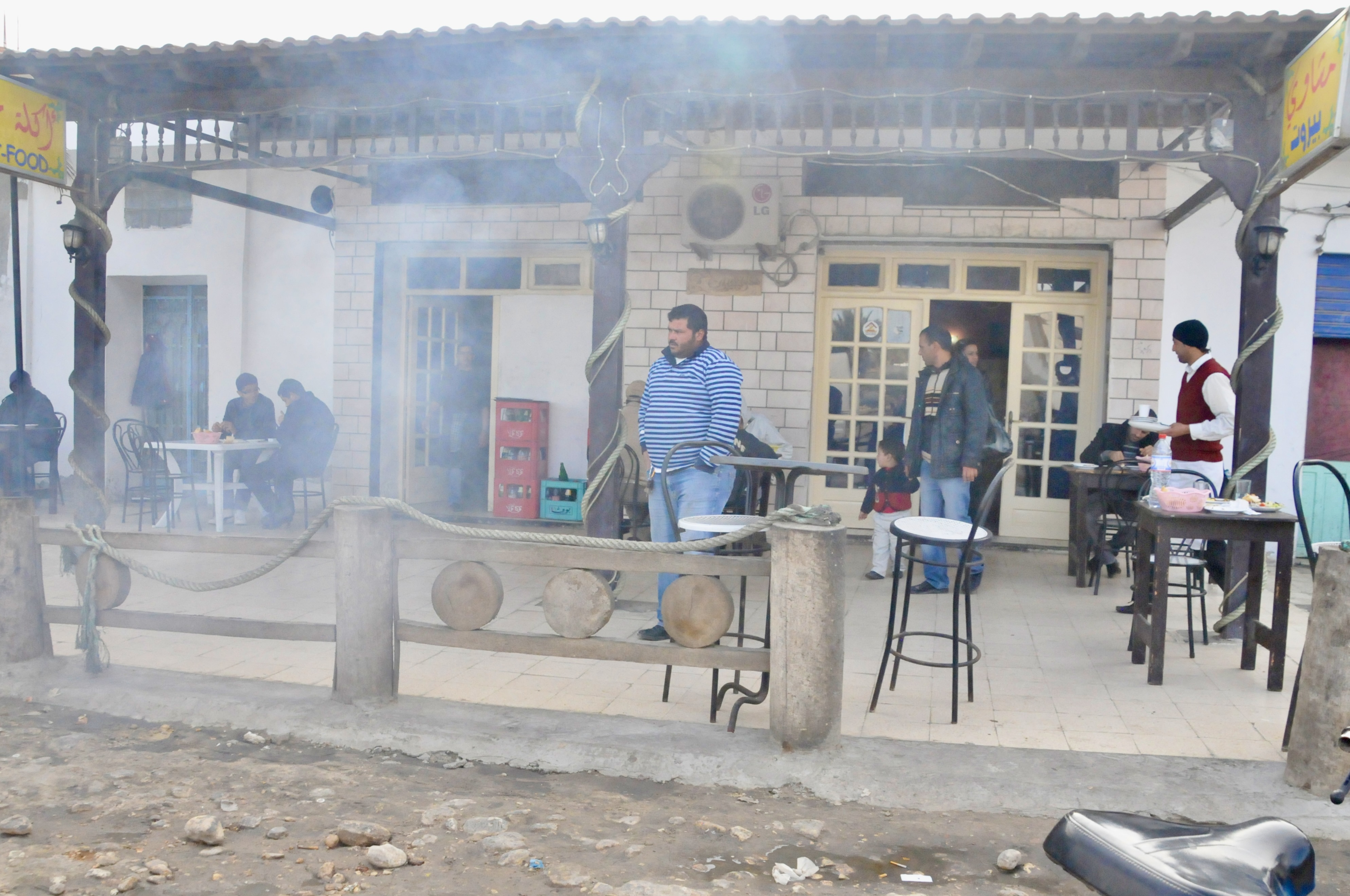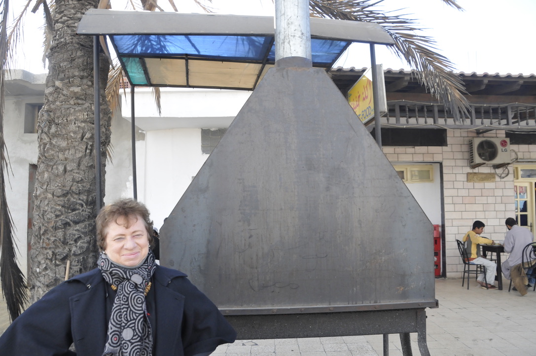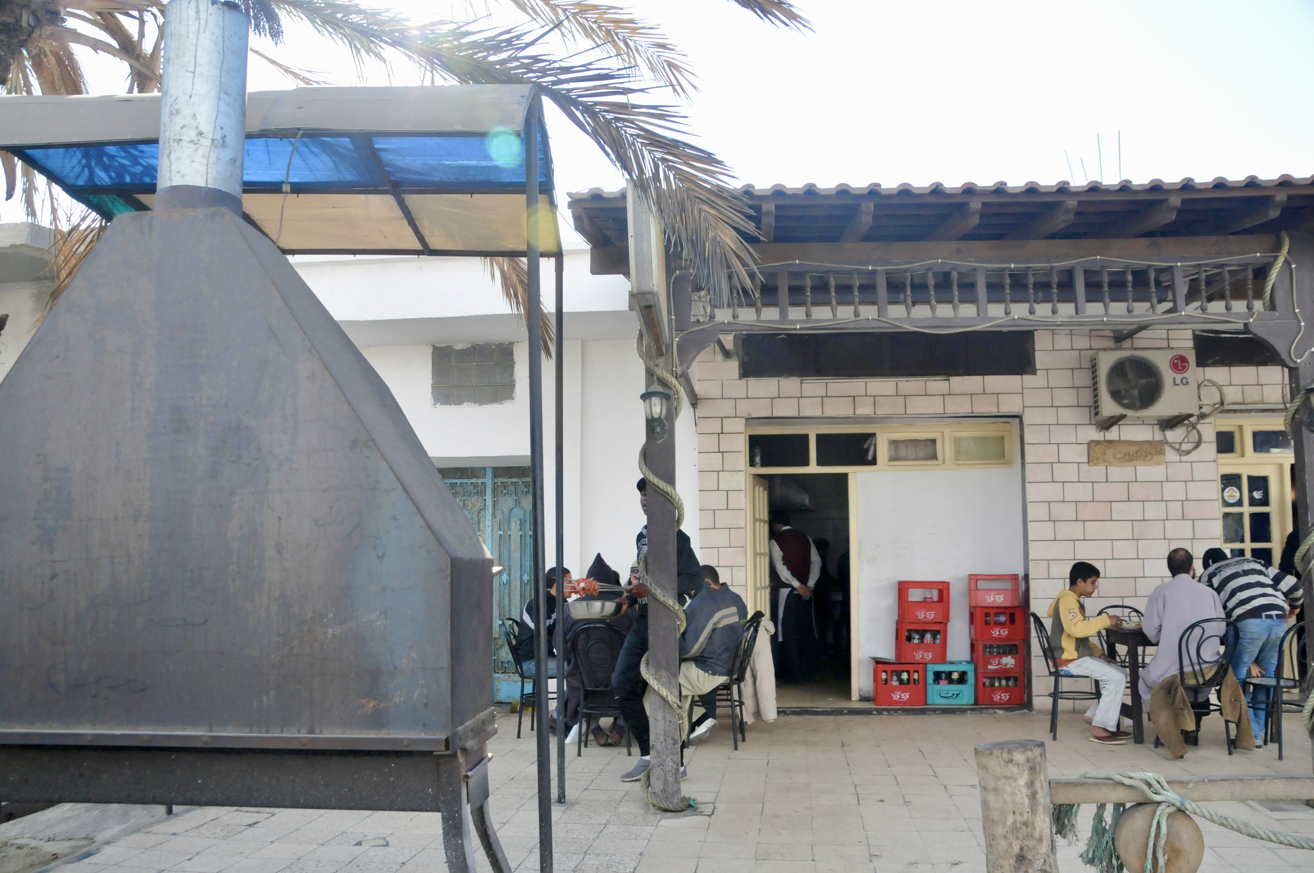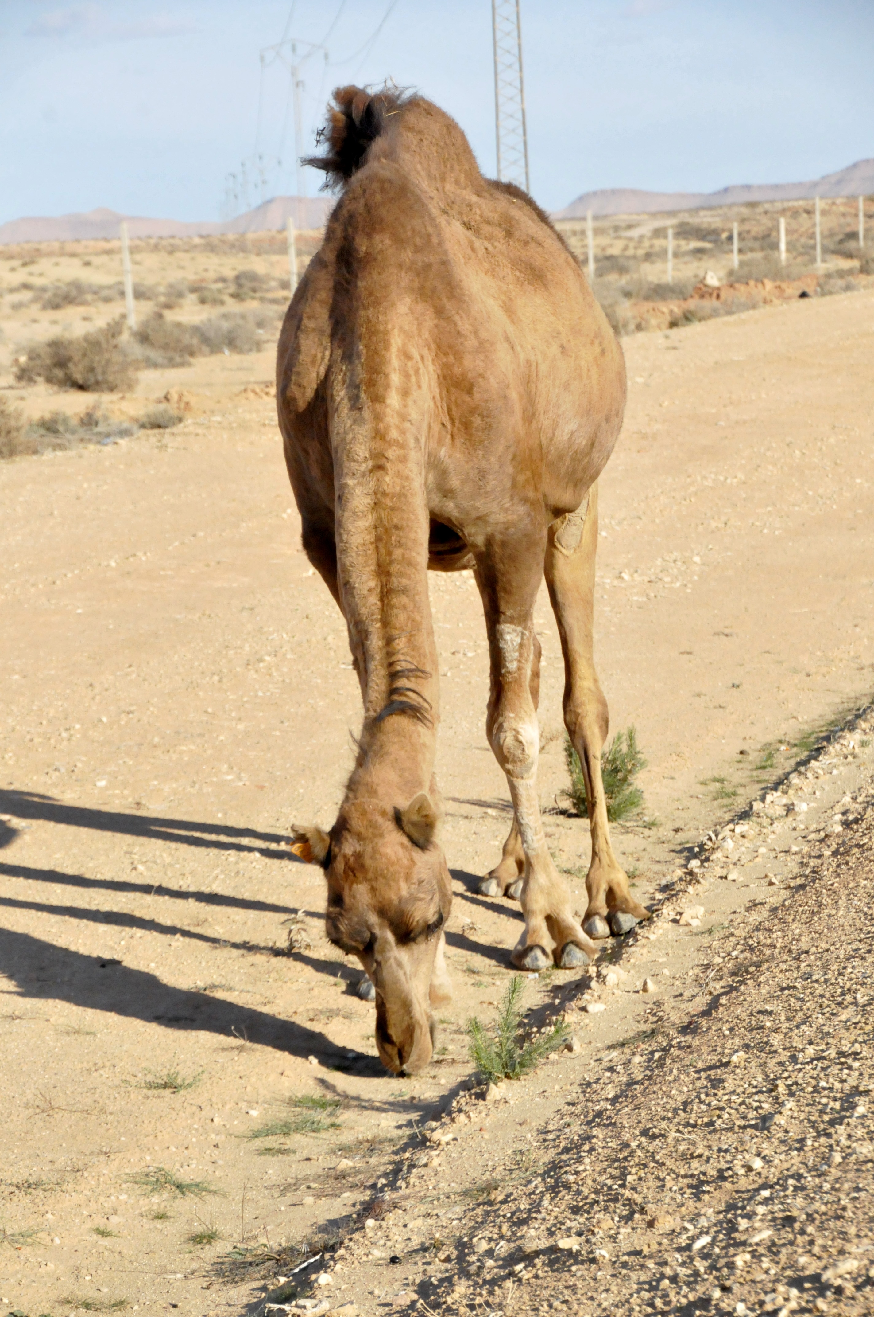 Initially, from the ferry we headed toward Mareth and then back toward (but not into) Gabes and then headed west (SW a bit) to Kbili and then south southwest to Tozeur. On the outskirts of Gabes, we stopped for lunch on the roadside. A typically Tunisian place — a guy grilling kebabs on the street, with the meat being tenderized with the pollution of cars and motorcycles whizzing by; a very small inside section (maybe 4 tables) and an exterior “porch-like” area behind the barbeque and in front of the inside area…with views of traffic. But we’ve gotten used to these little “restaurants”.. and can probably do a little Zagats guide on them. It was a busy place, and there really wasn’t a table, but the enterprising young guy found a table in a storage area and then dug up two chairs.. and we were set. Ordered one mixed kebab and one chicken.. and then waited. As we sat waiting for the food we glanced around and realized that two tables were occupied by about 4-5 Islamists (long black beards, long grey coat-like outfits)… at each of the tables. The guy making the kebabs wanted his photo taken (multiple times), but I decided to avoid photographing the Islamist guys at the tables. Anyway, we laughed because there was a sign saying that the restaurant was “fast food”… but I’d say more like “slow food”… Took more than 30 minutes to get our kebabs. They served a really good hummus with the kebab and also a tart yogurt with garlic. Yummy with the chicken. Total cost for lunch about $3 for the two of us.
