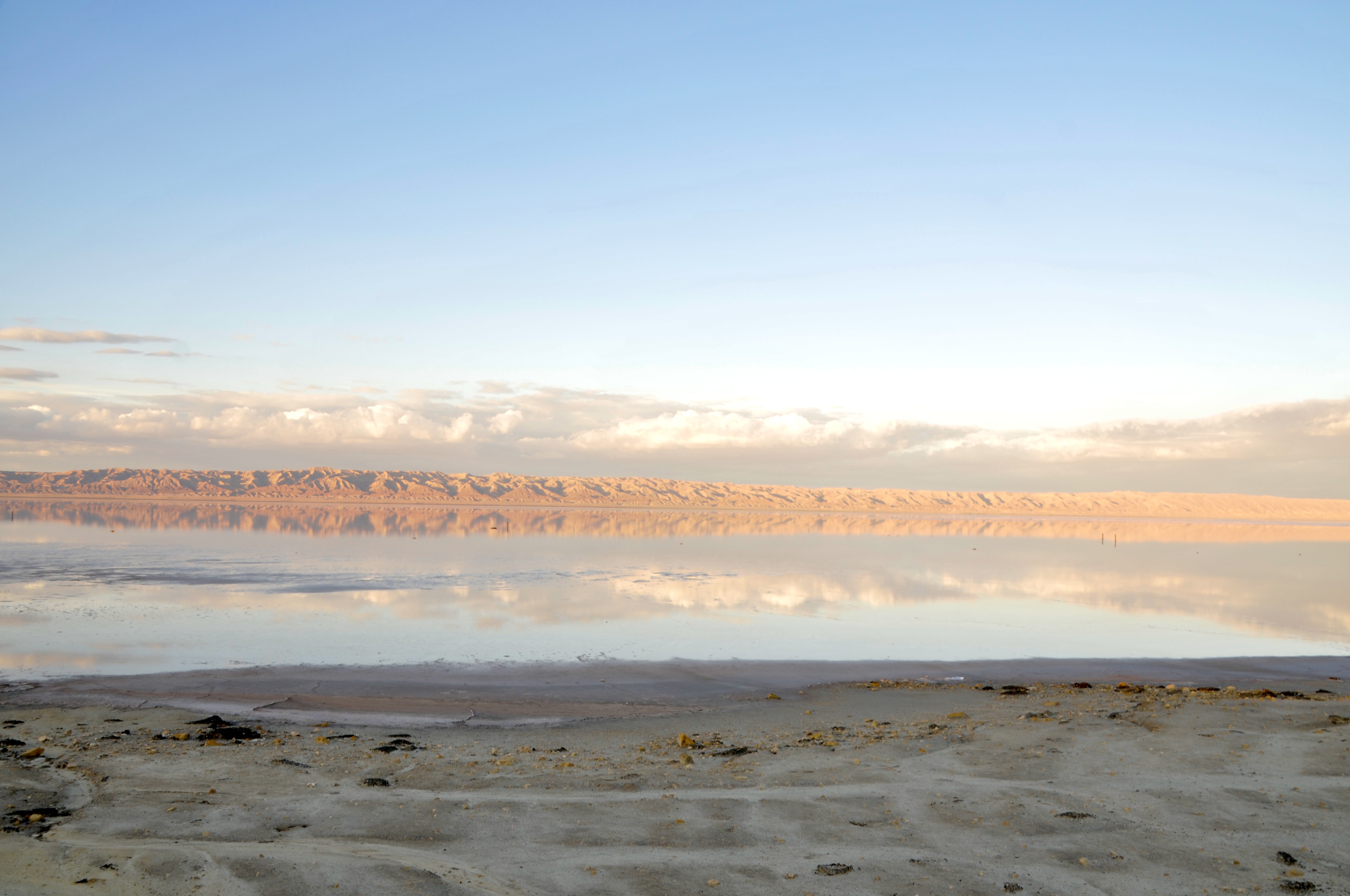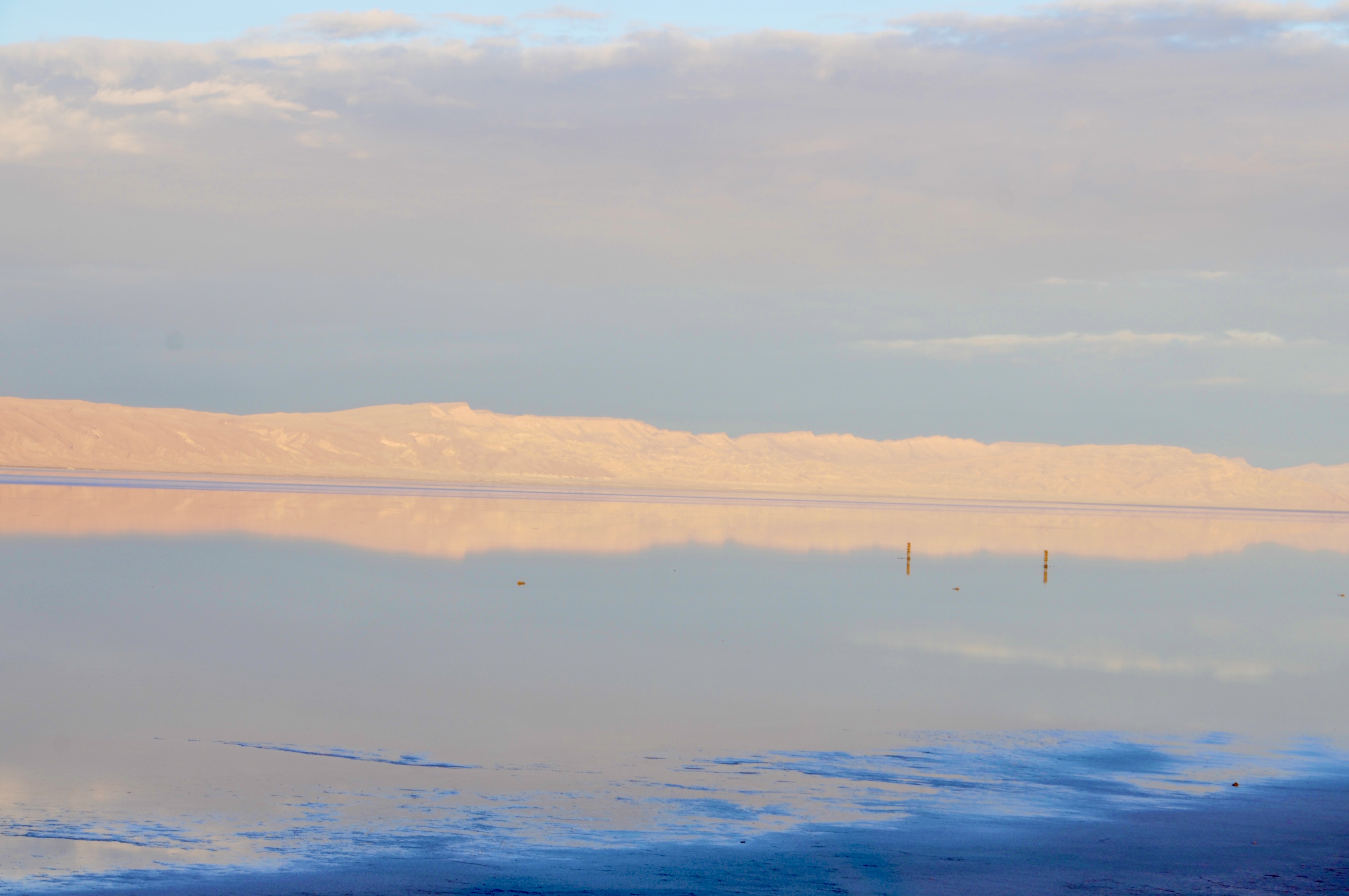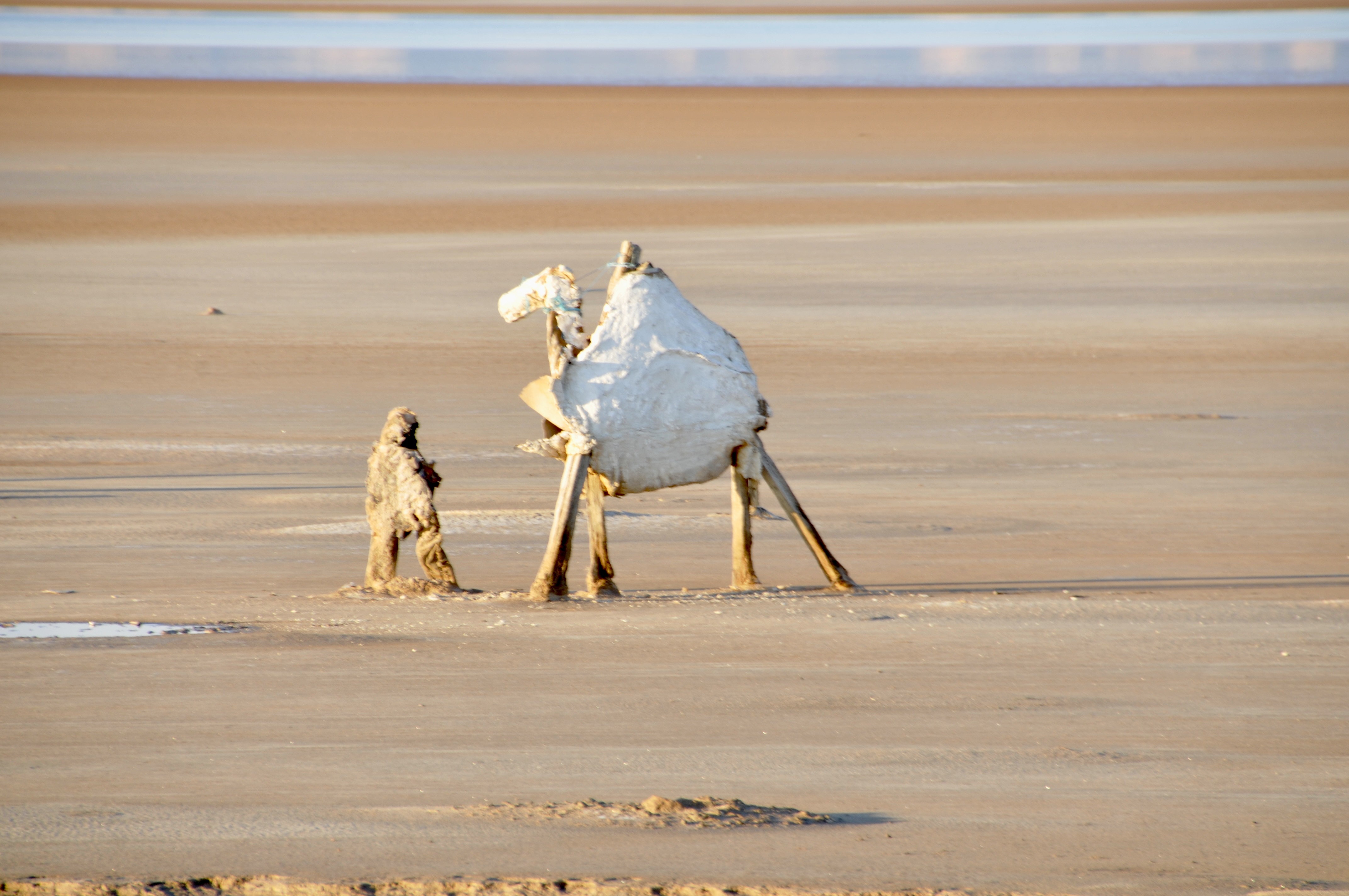 We approached the Chott el Jend at about 4 pm.. It’s an eery landscape… driving just a foot or two above the “lake” which is dry in many places but has water in other areas close to the road. In all directions you see a mirror-like reflection that seems to go on forever. The view was made more spectacular (and also a bit more difficult for driving) because the sun was setting quickly. Along the road there were little “hut – cafes” made of reeds… They sort of “announce” themselves by having “sculptures” made of the salt from the lake.. sitting behind or adjacent to their shops — but out in the dry lake bed.. It looks a lot like the kind of mudflat art that used to be out on the Bay by Emeryville and Berkeley. Many of these “sculptures” are camels.
