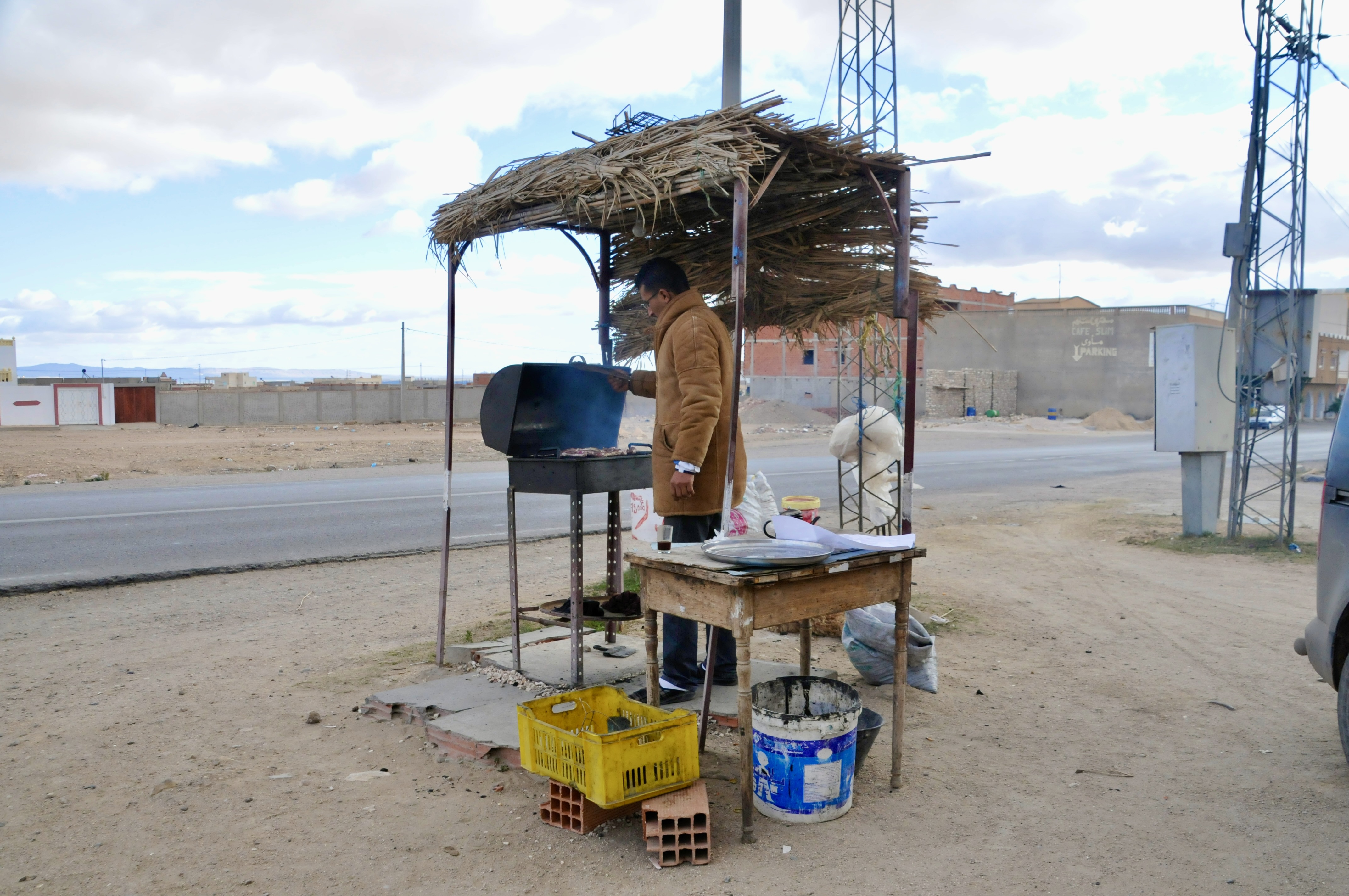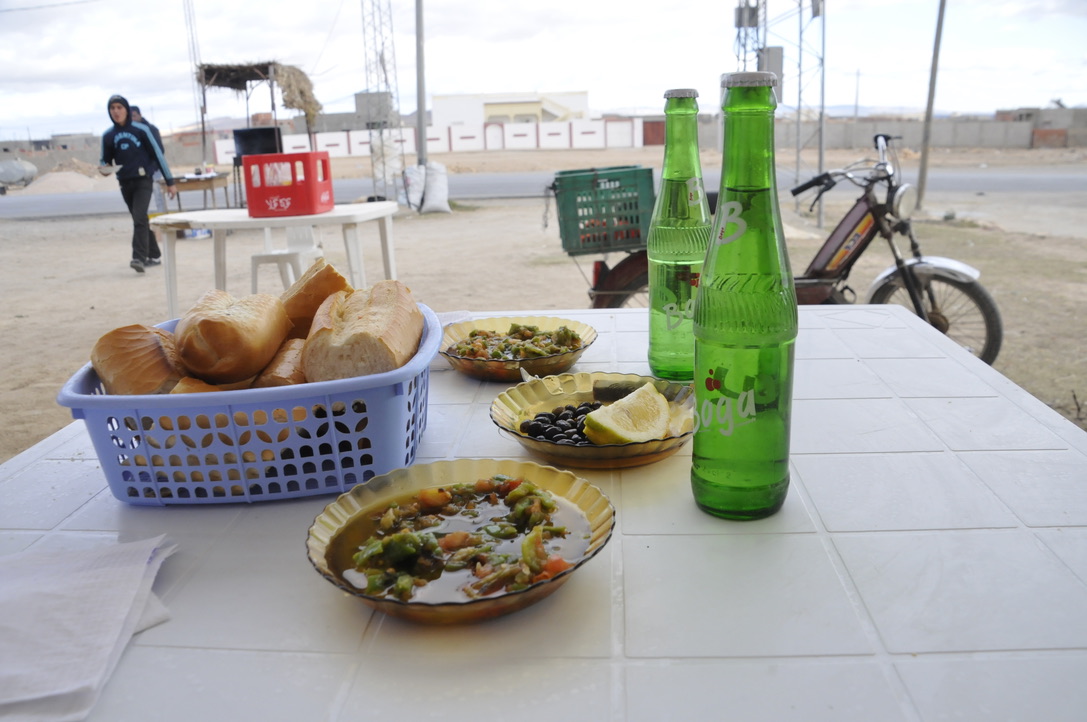 About halfway into the journey we decided we needed to eat (seems like my notes are really all about our eating patterns).. so we searched for one of those little barbecue places on the road.. But this journey was really through very desolate and rural places, so the pickings were few and far between. Stopped at one place, but they only had coffee. Spotted another place that we thought had food… and they did — sort of. They had apparently recently slaughtered a sheep (the skin and other remains were quite visible)… it was a little like going into a butcher shop.. but they had only one choice of meat (no chicken).. and they didn’t have much of it. But we were already out of the car, so we decided to give it a try. Not much French here either, so we winged it (with sign language).