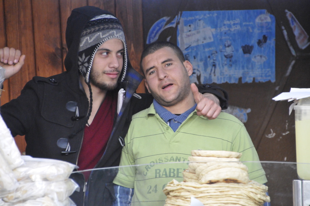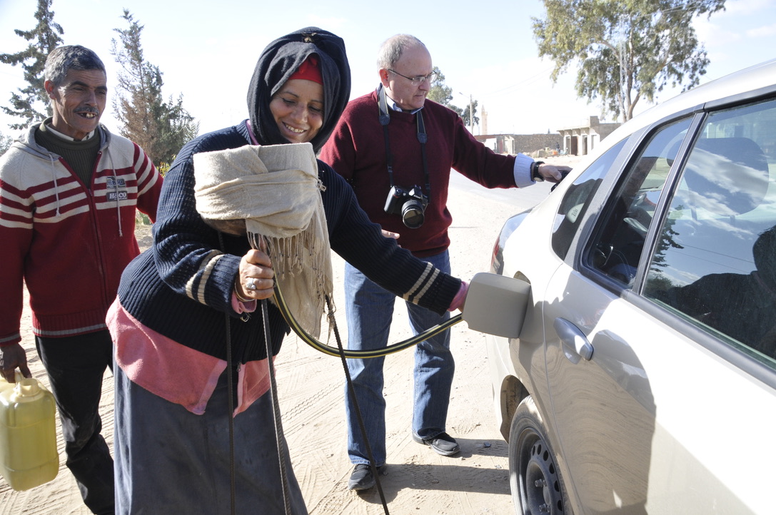 At this one, a man and his wife both operated the station. It took a while because the guy had to go into his storage area (dozens of plastic multi-gallon jugs filled with gasoline– scary) to see if he had the right kind of gas for our car. Once he determined he had it, the process began: filling the bucket which had a cloth on it (the filter) through a funnel and a hose.. The hose goes into the gas tank. At the end they lift the bucket high to get the last ounce of gas into the car. Even though you ask to have the tank filled up.. they can’t really do that since they don’t know how much gas you have in the tank at the start and the jugs are a bit rough in terms of the amount going into the tank. We documented the whole process; they thought it was all quite funny; all done in Arabic — no French, no English…. just Arabic here at the gas pump.
