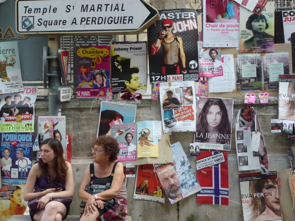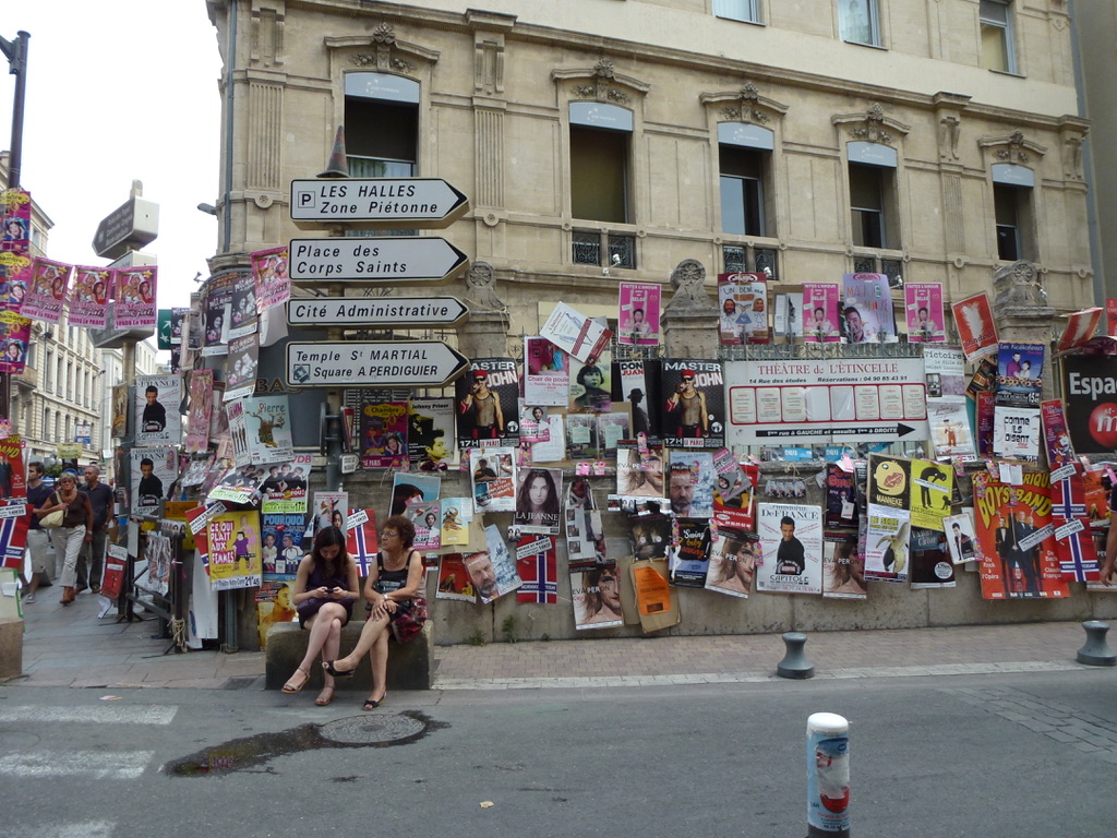 So Avignon looks totally different than it did in February. In February, with things covered with flecks of snow and the wind blowing and the skies extremely blue — Avignon was like a precious gem without much life, given that there were so few people around — no tourists, only actual Avignon residents at work inside buildings. It sparkled. Now it’s fun and lively, full of people, markets, and street vendors.. noisy, a bit gritty, but totally lovely. Lots of tourists (or so I suspect because you hear a lot of languages) and people are literally lining up to get tickets to one of the many, many performances that are happening in dozens of venues — inside and out.