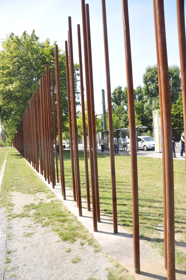 Eventually — through our very circuitous 8-mile route — (the hotel is actually just about a half mile stroll to the monument) — we reached the Holocaust Memorial. It’s located in the Mitte section of town… on a piece of land formerly known as the “death strip,” near the Brandenburg Gate — where the Wall once stood. Interestingly it is opposite the American Embassy (a new building). It’s a series of 2,711 rectangular solids, all somber gray .. The “pillars” or rectangular solids vary in height but are all the same width and depth and all are lined up in a grid like fashion that is slightly imperfect. The ground is also set at a mildly sloping up and down format.. and as you walk between the rows you are in a rather tight space.. probably about 3 ft apart. In some ways it’s a bit like a cemetery with monuments of varying sizes, all lined up, and based on the age of the monument some leaning. It was a contemplative way to end the day.
