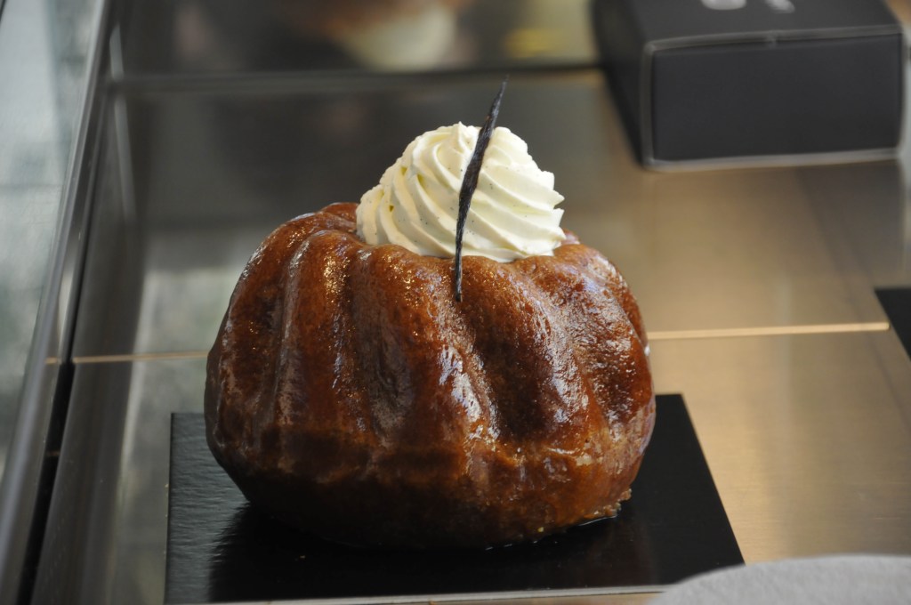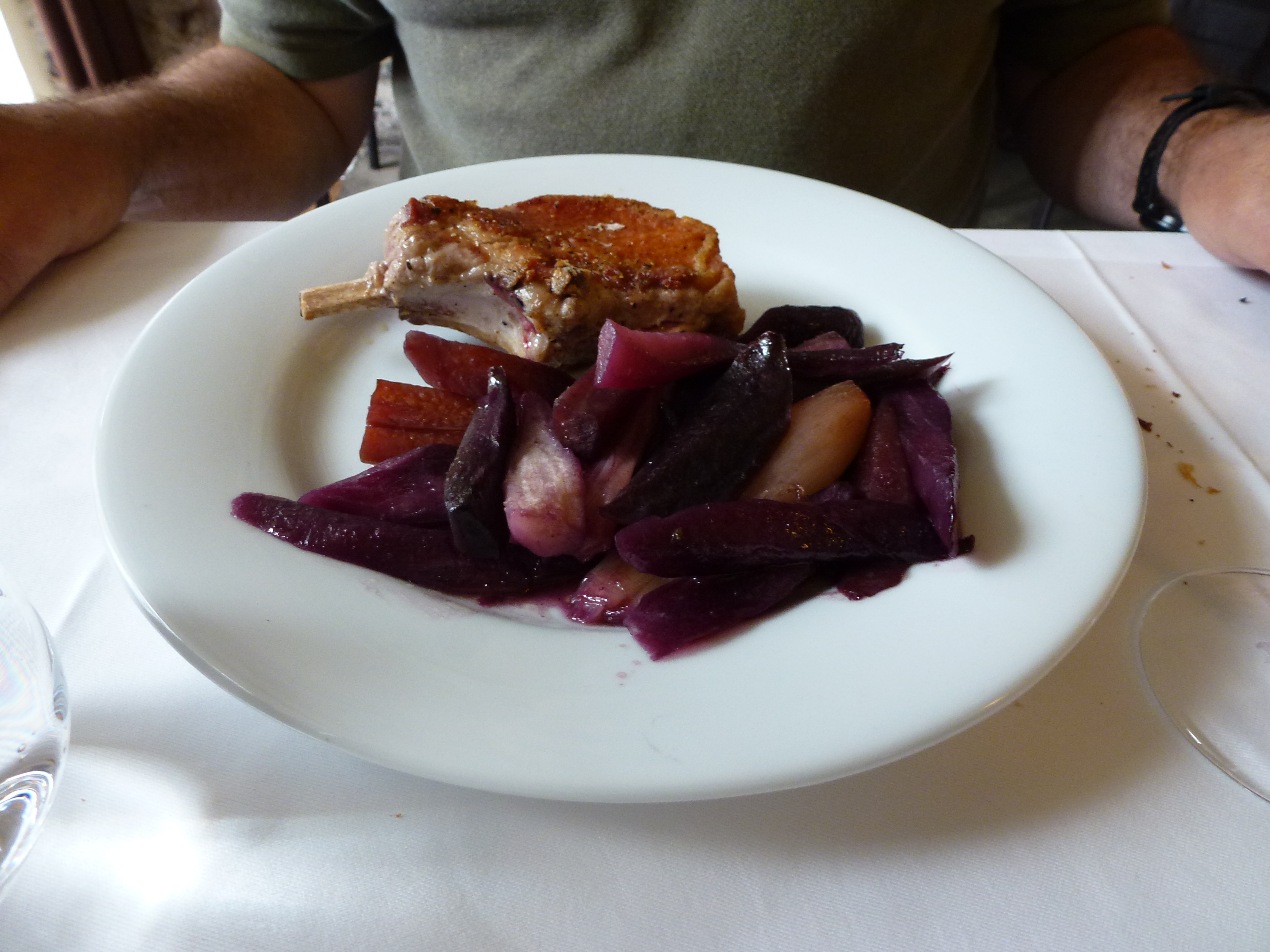 I started with the squid “salad” which was done with cannelloni beans and a hint of some kind of peppery spice.. and Mike had something called a “cauliflower cake” which was incredible — looked like two slices of pound cake and served with a red pepper jelly. For the main course, I had the sweetbreads and Mike had a pork dish that came with purple carrots — Both were fantastic. We ended with a tarte framboises avec pomme granny-smith et crème Chantilly — a raspberry tart. Definitely a recommended spot.