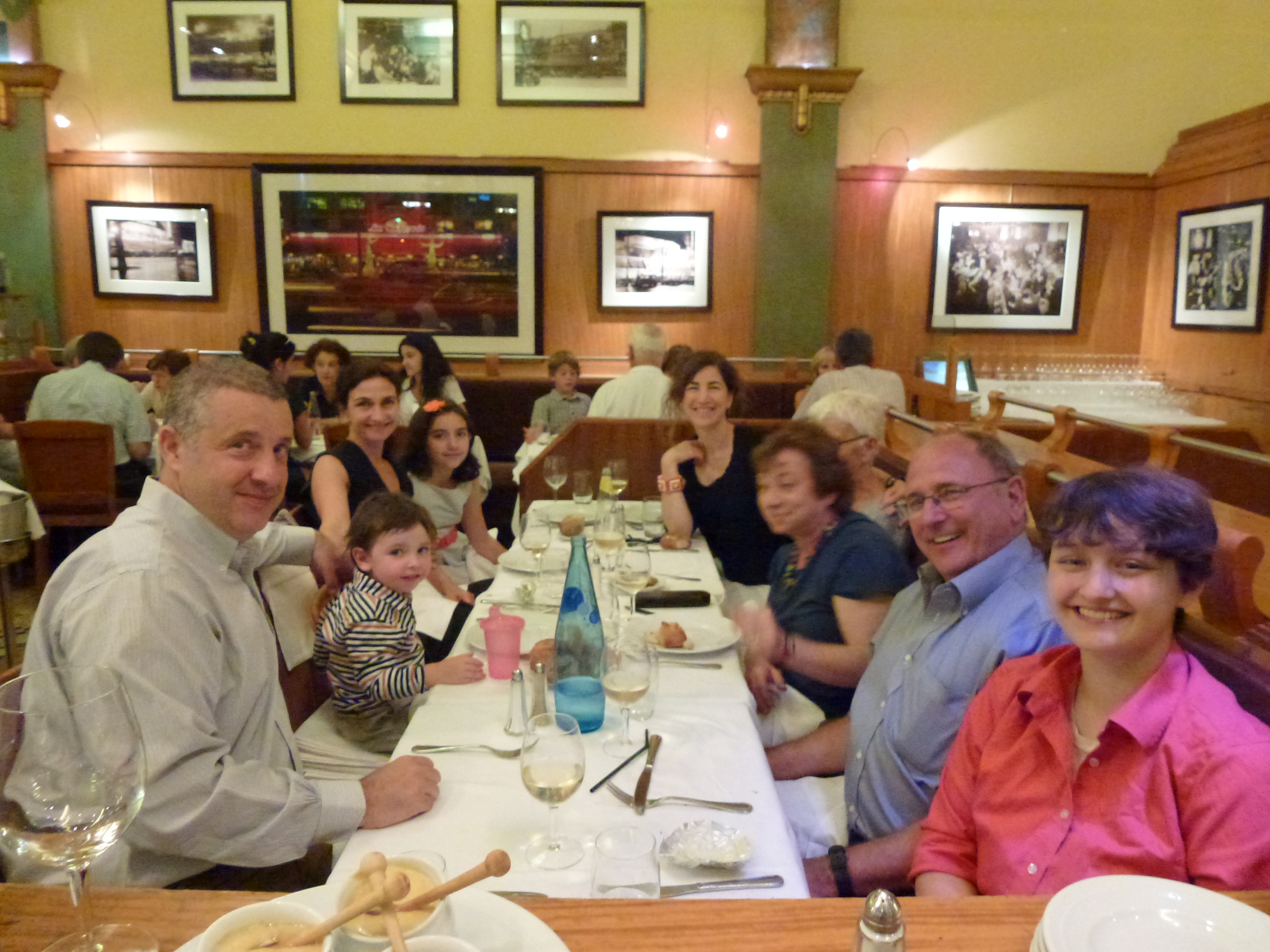 We were a group of nine, including one three year old (who seemed to be adapting well to late nights out, lots of travel, and hearing people speak another language. In any case, Harry seems to think Paris IS the Eiffel Tower, so whenever you say “Paris,” he says “Eiffel Tower.” La Coupole is accustomed to large groups so our table of nine was not unusual. Actually the food was better than I remembered (I ate there 11 years ago when I was in Paris with my mother, aunt, uncle, and cousins, and when serendipitously Mike’s brother, sister in law, daughter, and a friend were also in the city… so again we were a large group) and service was incredibly attentive. Naturally little Harry stole the show and the waiters showered him with all sorts of surprises. Started out with tuna carpaccio and then moved onto scallops; Mike had lobster and mango “salad”.. The kids had some unbelievable chocolate dessert.