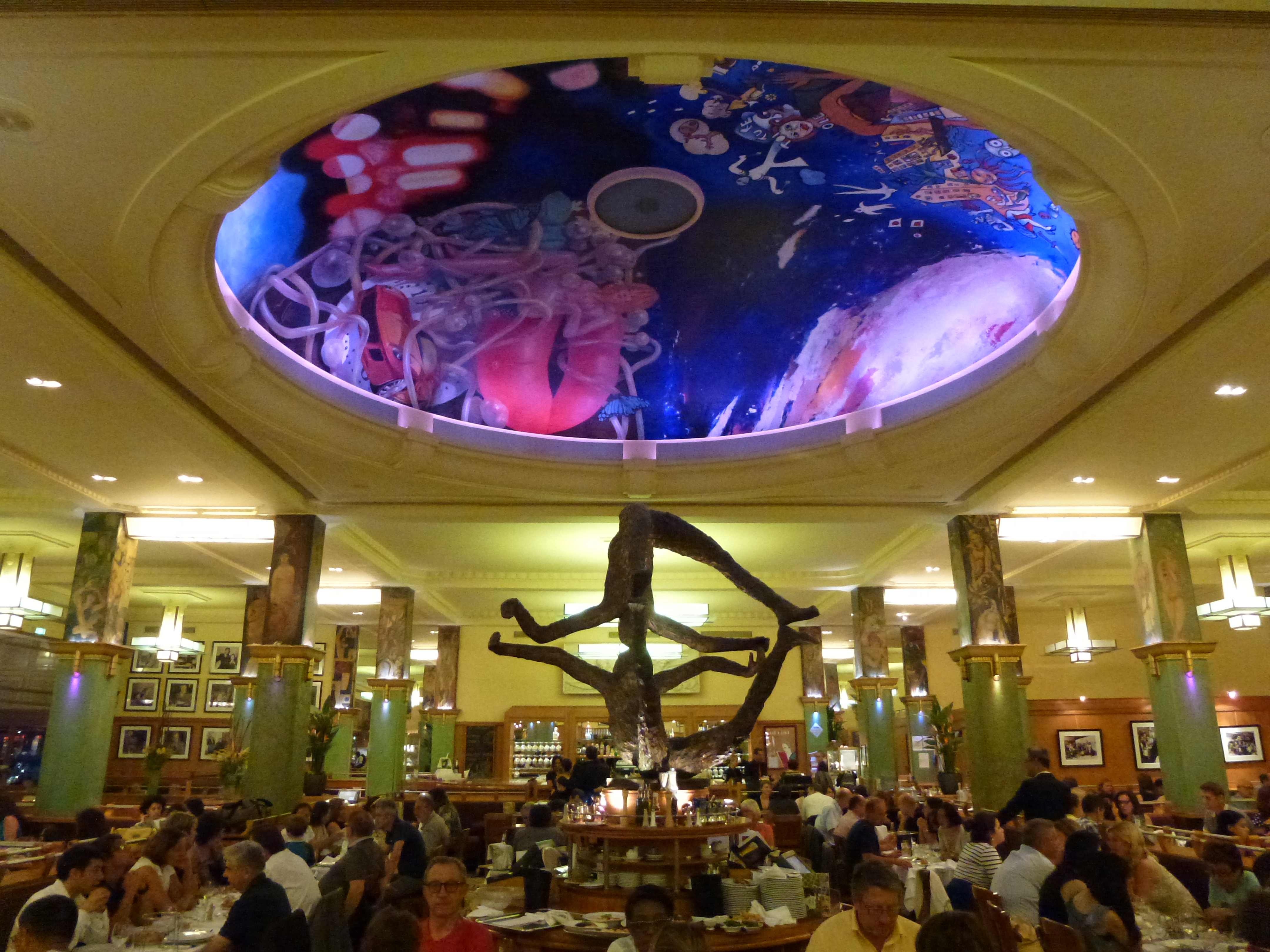 The legend is that painters such as Léger, Man Ray, and Picasso were frequent visitors… and where Simenon dined with Josephine Baker; Henry Miller ate breakfast at the bar; Joyce drank whiskeys. When France was liberated, the restaurant was rejuvenated… and work was displayed by artists from the School of Paris. Yves Klein painted the obelisk blue; they claim that Camus celebrated his Nobel prize and also that Sartre left big tips and had a regular table.. In more recent days… Chagall celebrated his birthday at the restaurant in 1984 and in 2008, the interior dome (which apparently gets repainted by famous artists every decade or so.. ) was painted by four artists “to reflect La Coupole’s original spirit – nature, women, celebration.”