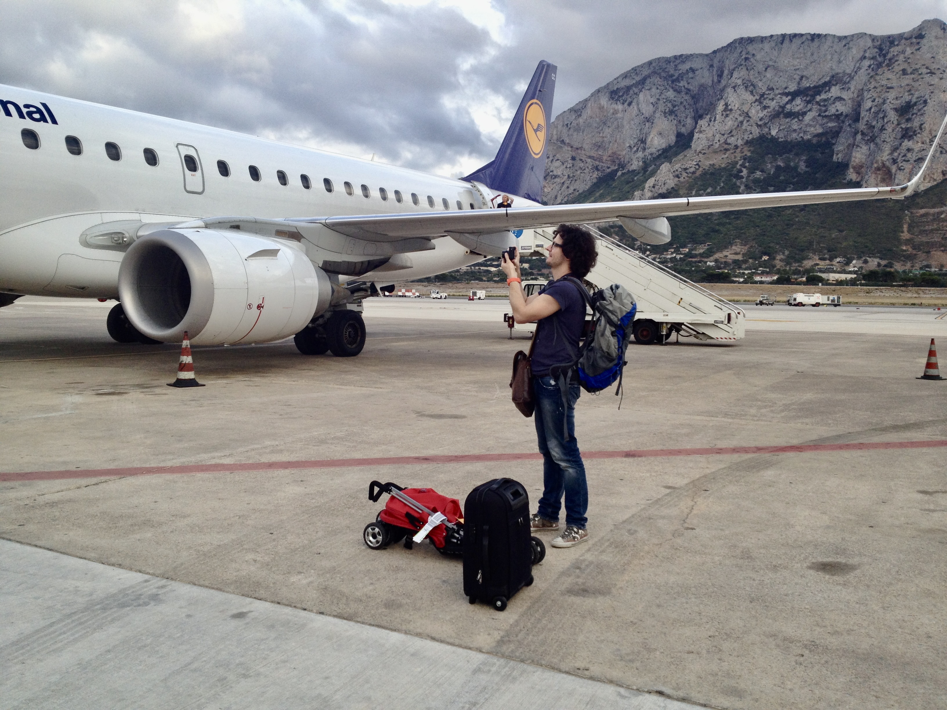 We lucked out at the very last minute and were upgraded to Business Class (which even with my two-million-miler status has not been a sure thing since United’s merger with Continental) — the flight was also uneventful (except that every single seat was taken). Arrived on time in Frankfurt, quickly changed planes to head to Palermo (which is where we will be for 5 days before we meet Mike’s brother in Rome). Naturally we couldn’t take our American-size carry-on rollies on the second flight so we checked them at the foot of the stairs to the plane… after carrying them down and up several flights to reach the plane (jetways in Europe are not all that common except for large planes). No matter how frequently we travel overseas, we always forget to check bags since we are so accustomed to carrying everything on and then being able to dash right out of the airport, bypassing the baggage section.