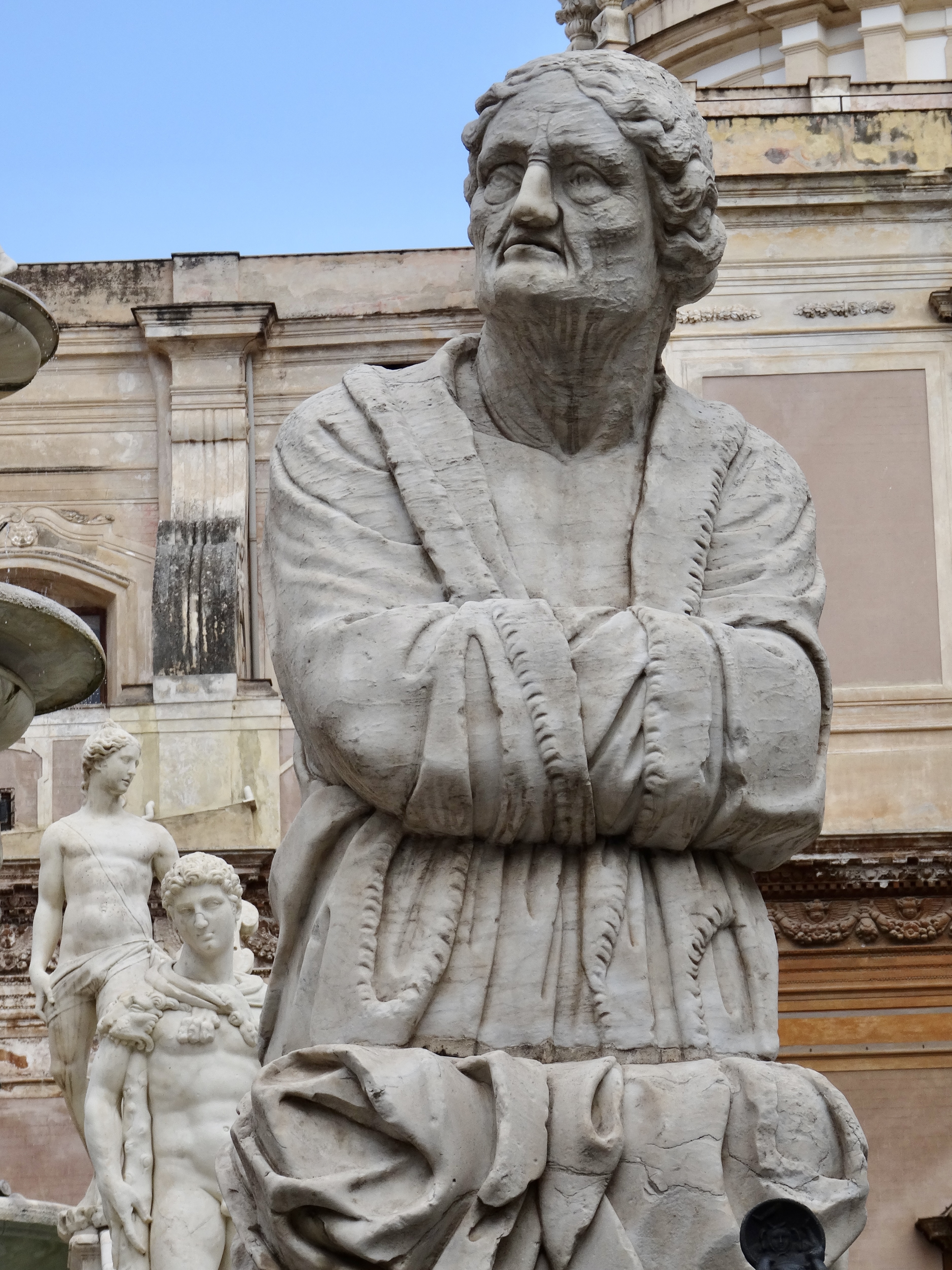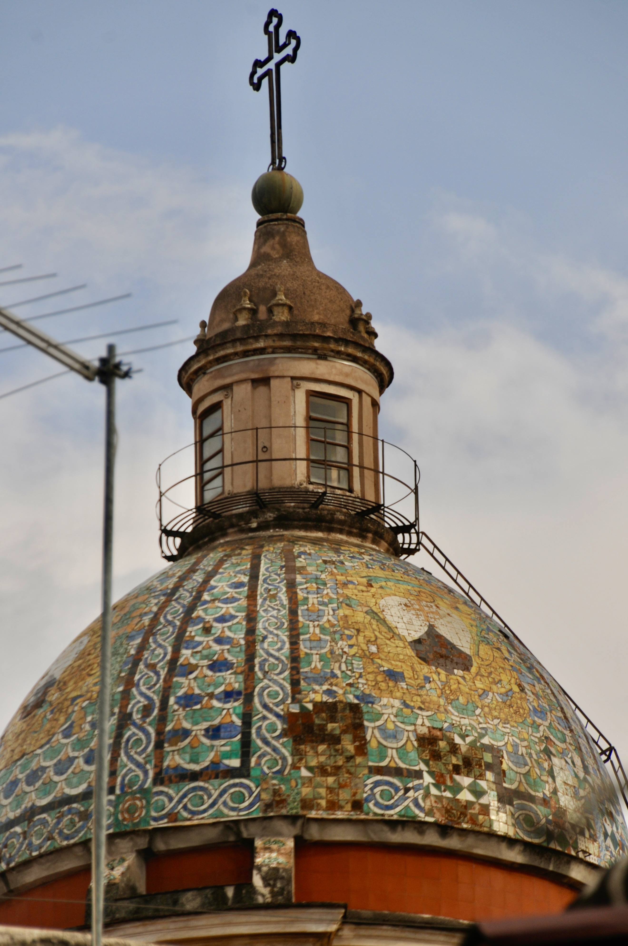 Along the way we stopped at a few churches — mostly Baroque — with fantastic murals, some with mosaics — all with weddings taking place… We stopped for paninis in a little terrace café and couldn’t resist (a bit later in the walk) some incredible gelato. The Sicilians get these “ice cream burgers”… two scoops of gelato inside a brioche roll! We did not partake in this, preferring to just have our gelato in a little cup. But everyone else was getting the burger version and we must definitely have seemed like foreigners. Stumbled on another wedding that had just taken place; church mid-block, with wedding party in the street causing a traffic jam because the sidewalk in front of the church was only about 3 feet deep. (The other church only had a sidewalk of about 18”.)