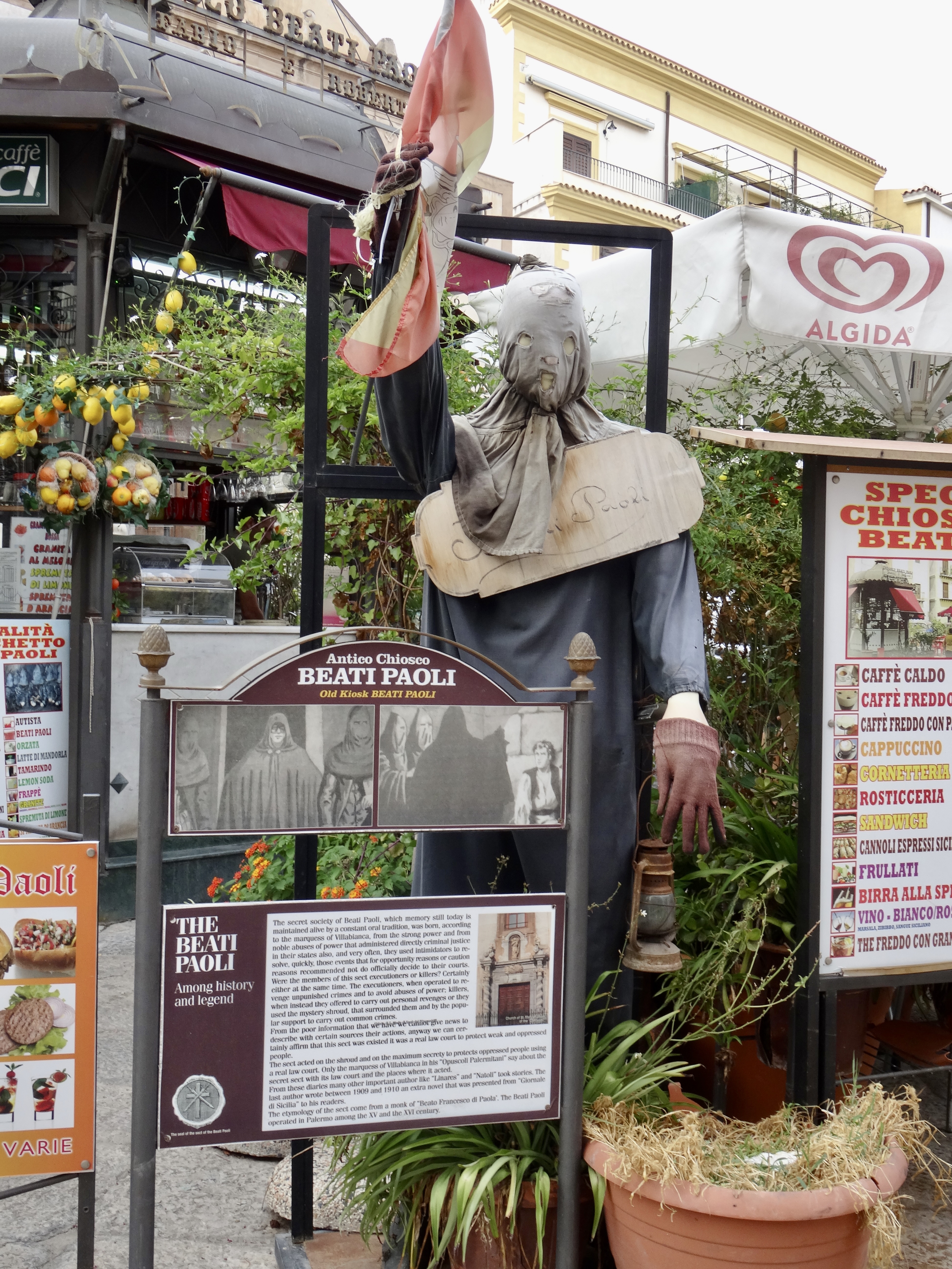 Began our day at around 9 am walking down the Via Marqueda (a broad street in the new section of Sicily), stopping at a small café where they are always dumbfounded that we don’t drink coffee and that Mike orders milk (which they then warm up as if they are going to add it to a latte.. and then they give him several packets of sugar for his non-coffee). Sat outside where we were quickly approached by a young family begging (there’s actually quite a bit of begging in the streets).