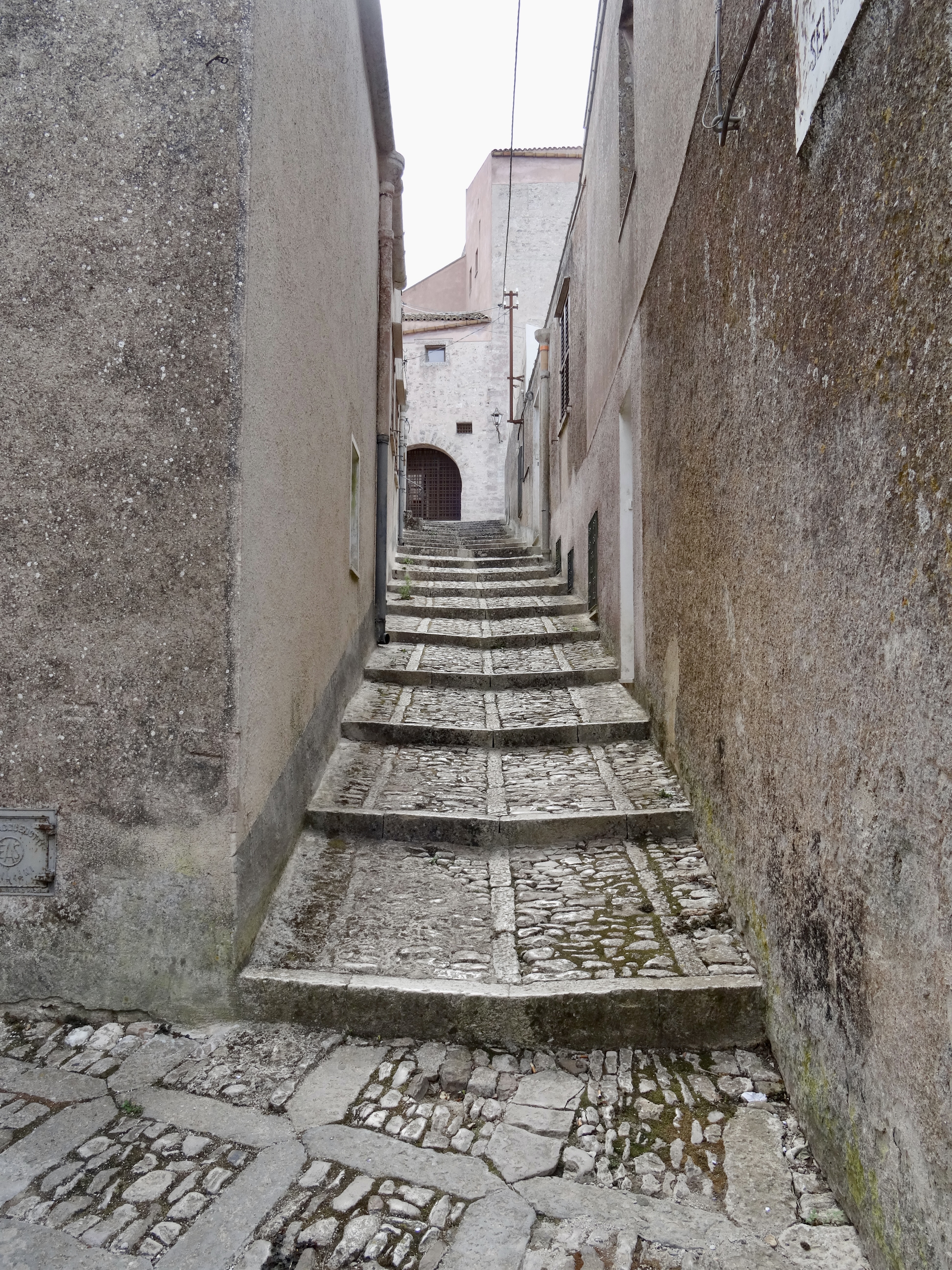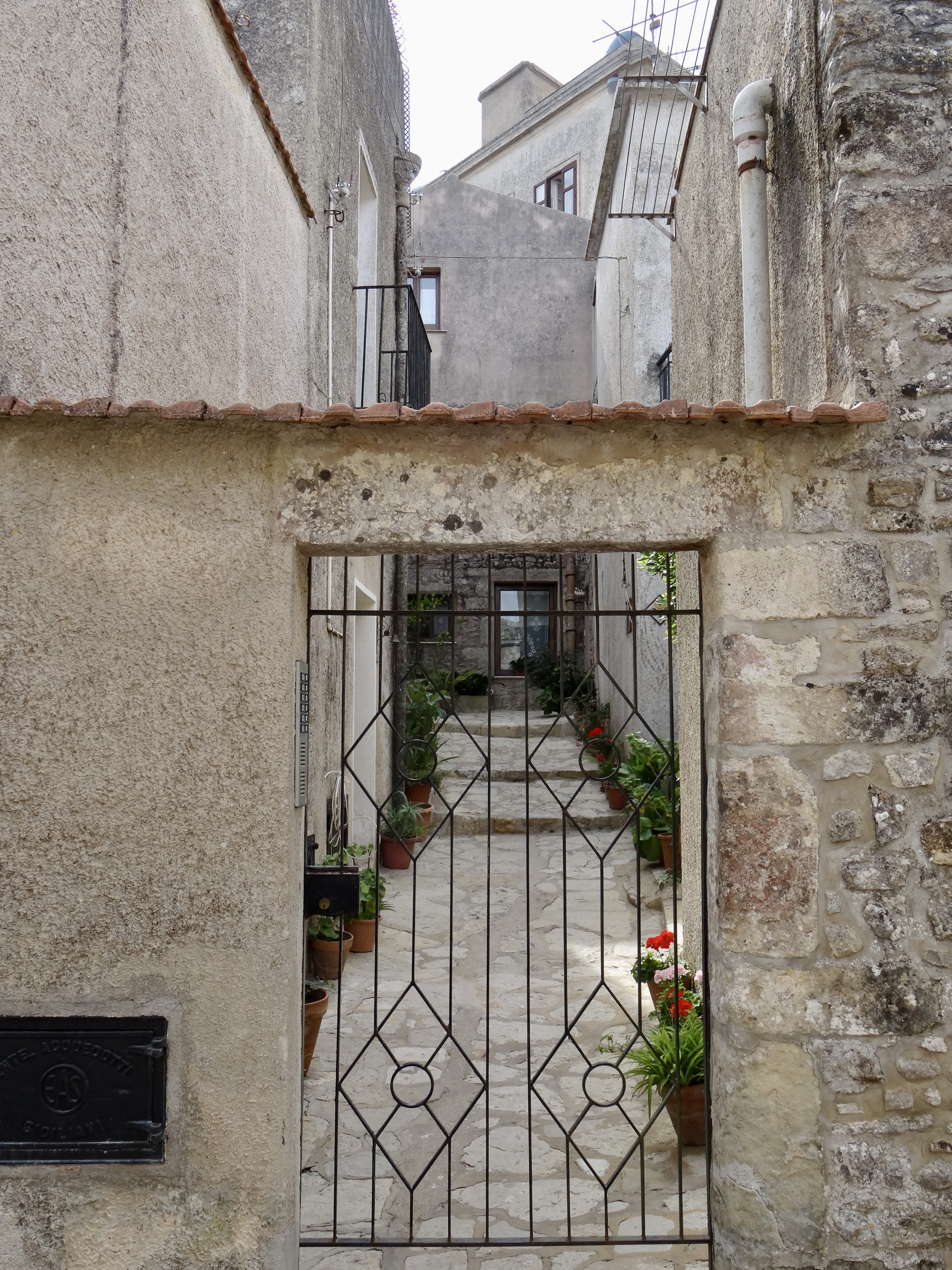 Erice is one of those delightful (if the tourists and the shops that they support selling lots of trinkets, disappear — yes, yes, I am aware that we are tourists, too) hilltop walled towns that are distinct from the surrounding countryside where the heat is strong and where olive groves and vineyards abound. Here you end your day in a cool, foggy mist. Erice is a totally stone town… with narrow, winding cobbled streets and alleys edging stone houses, stone churches, and stone courtyards .. with small stone piazzas popping up periodically. The streets are all paved with stones which have been smoothed and polished with centuries of feet walking over them… It’s totally clean — no litter that I could see.