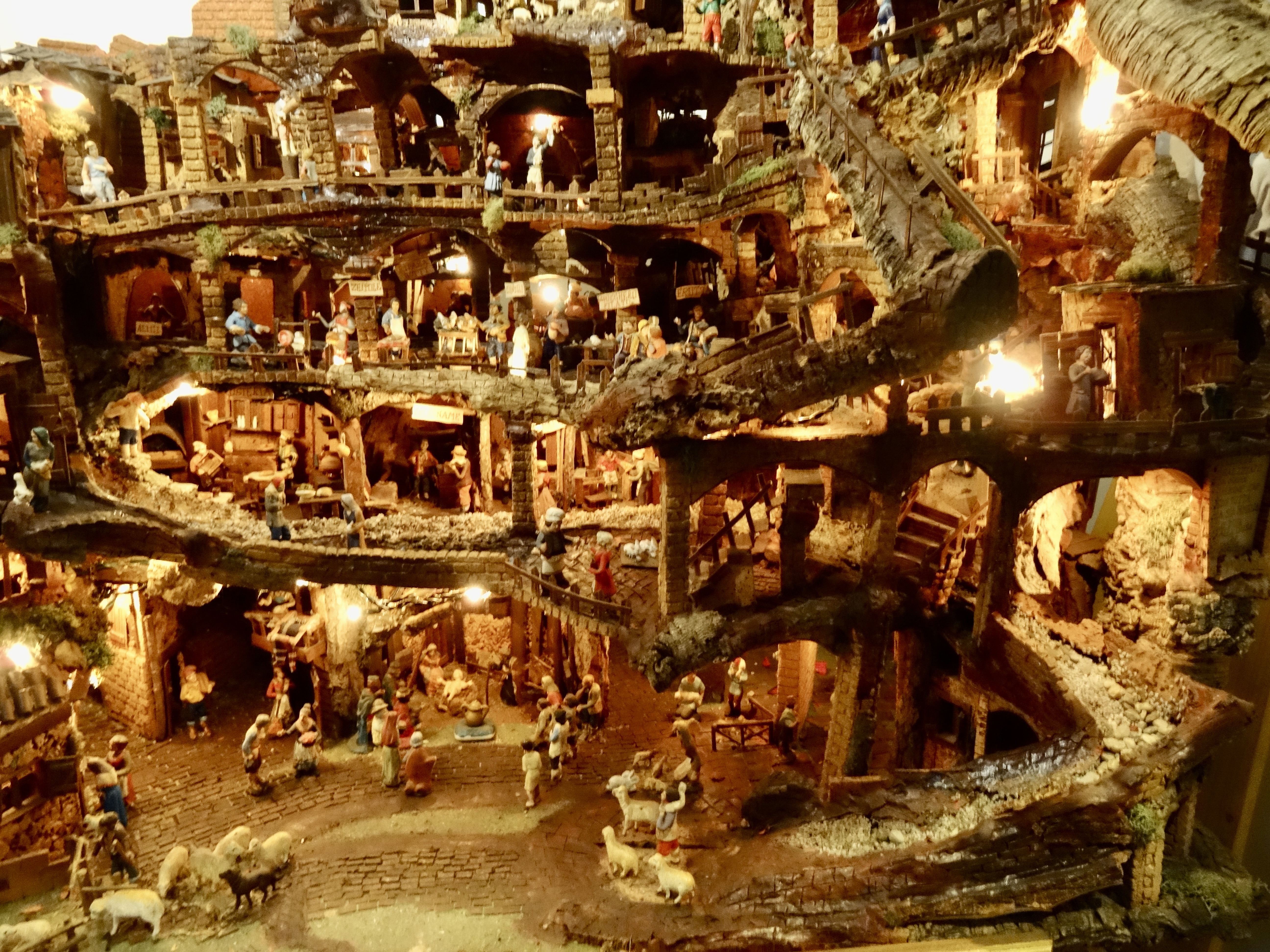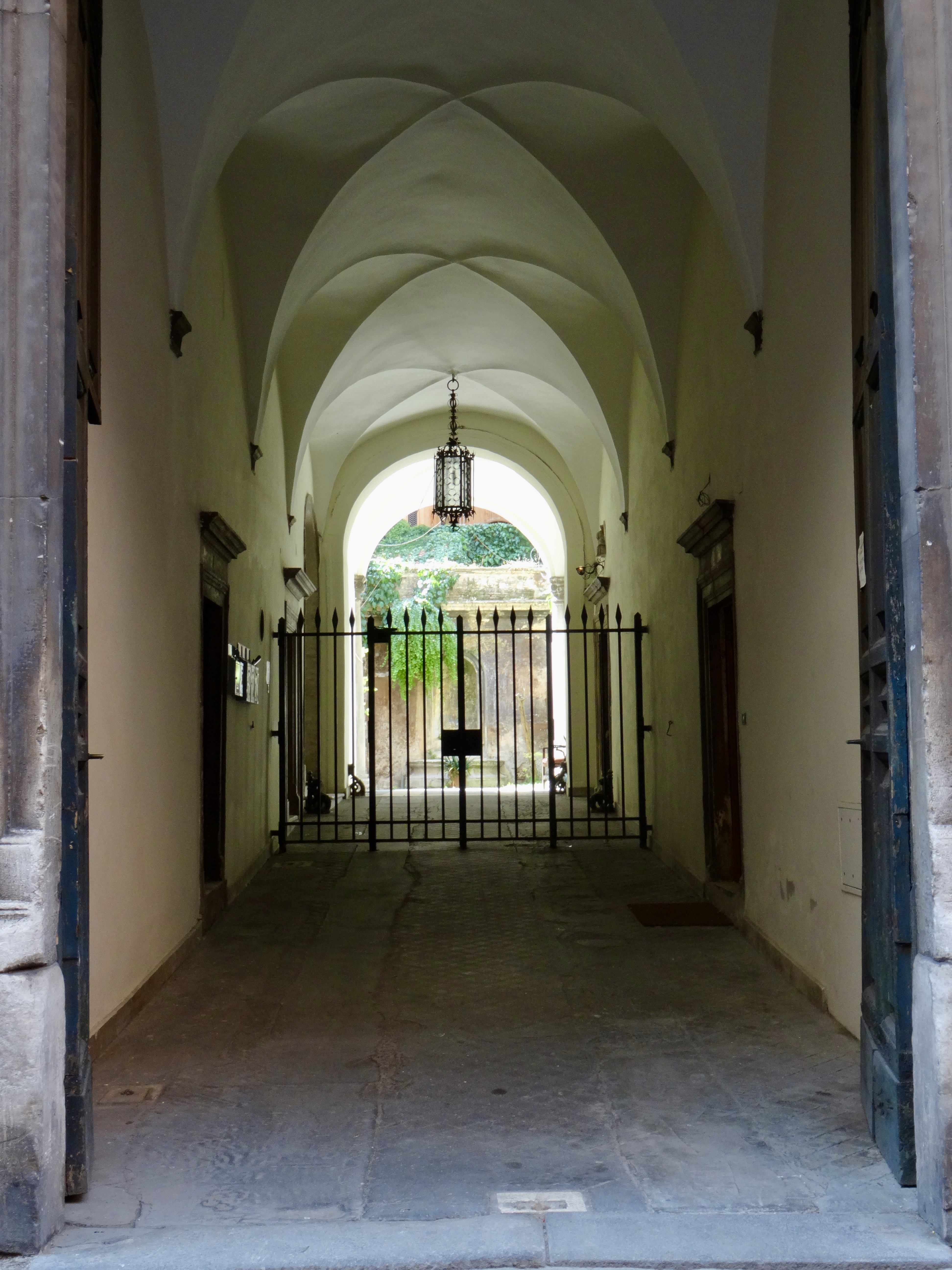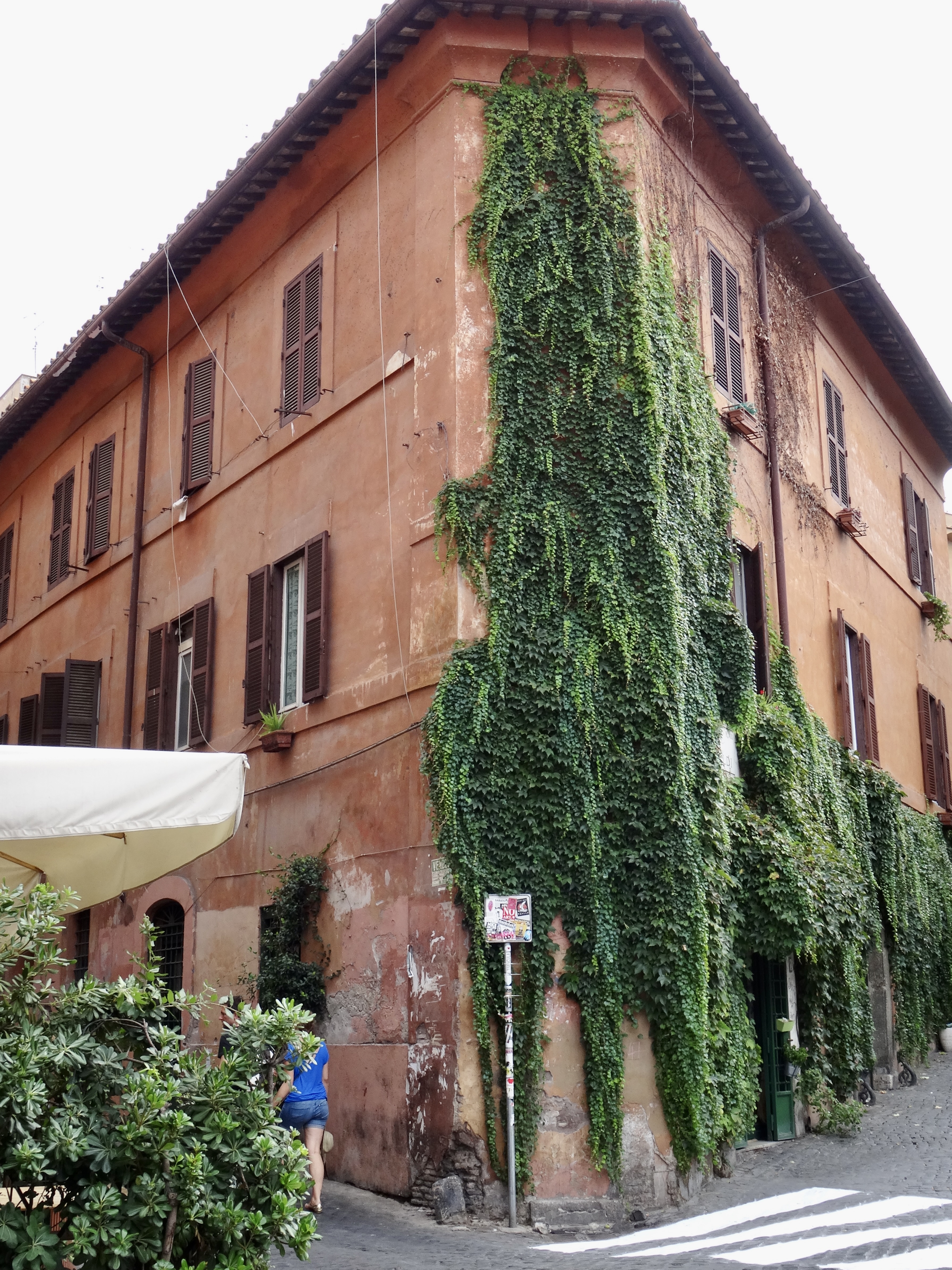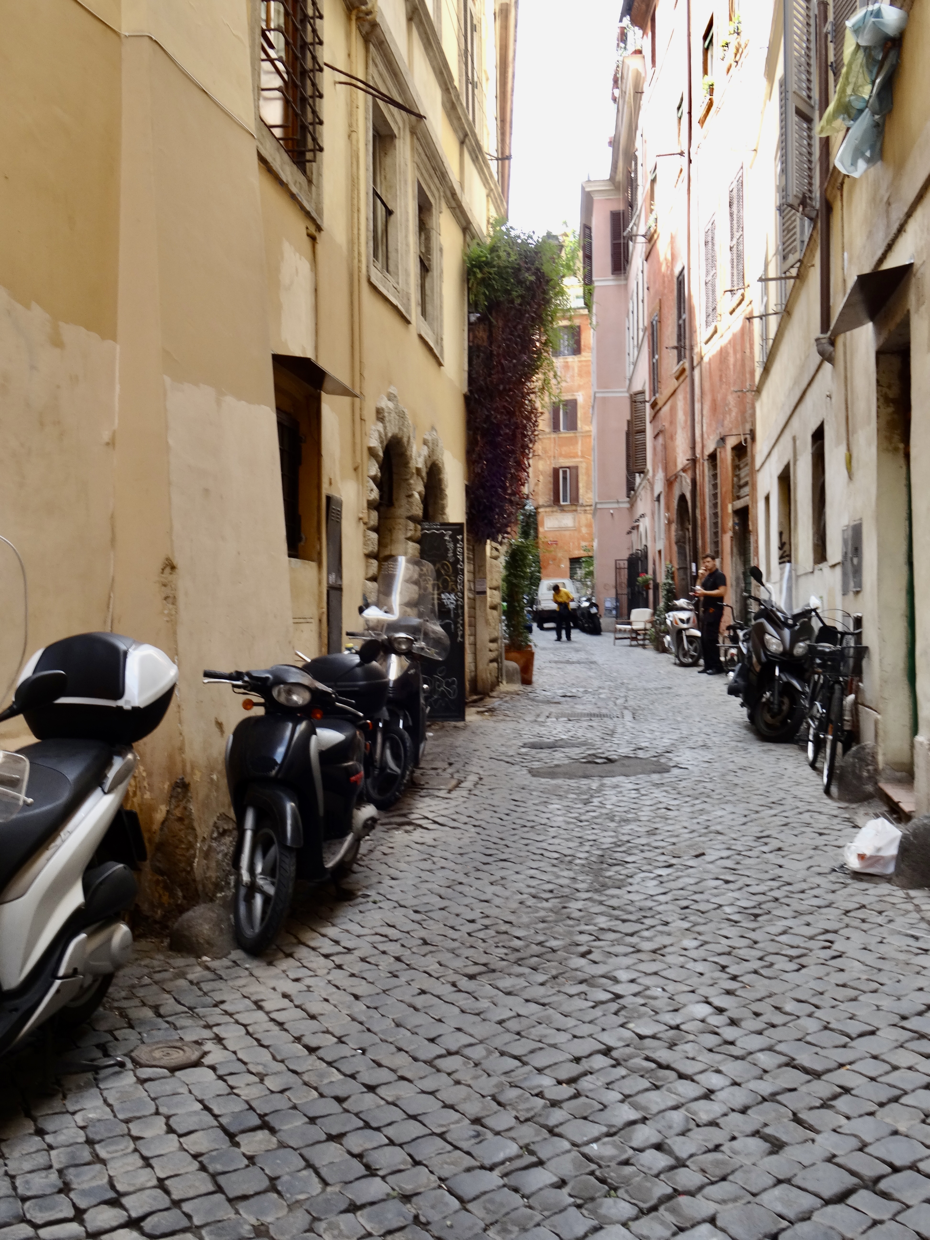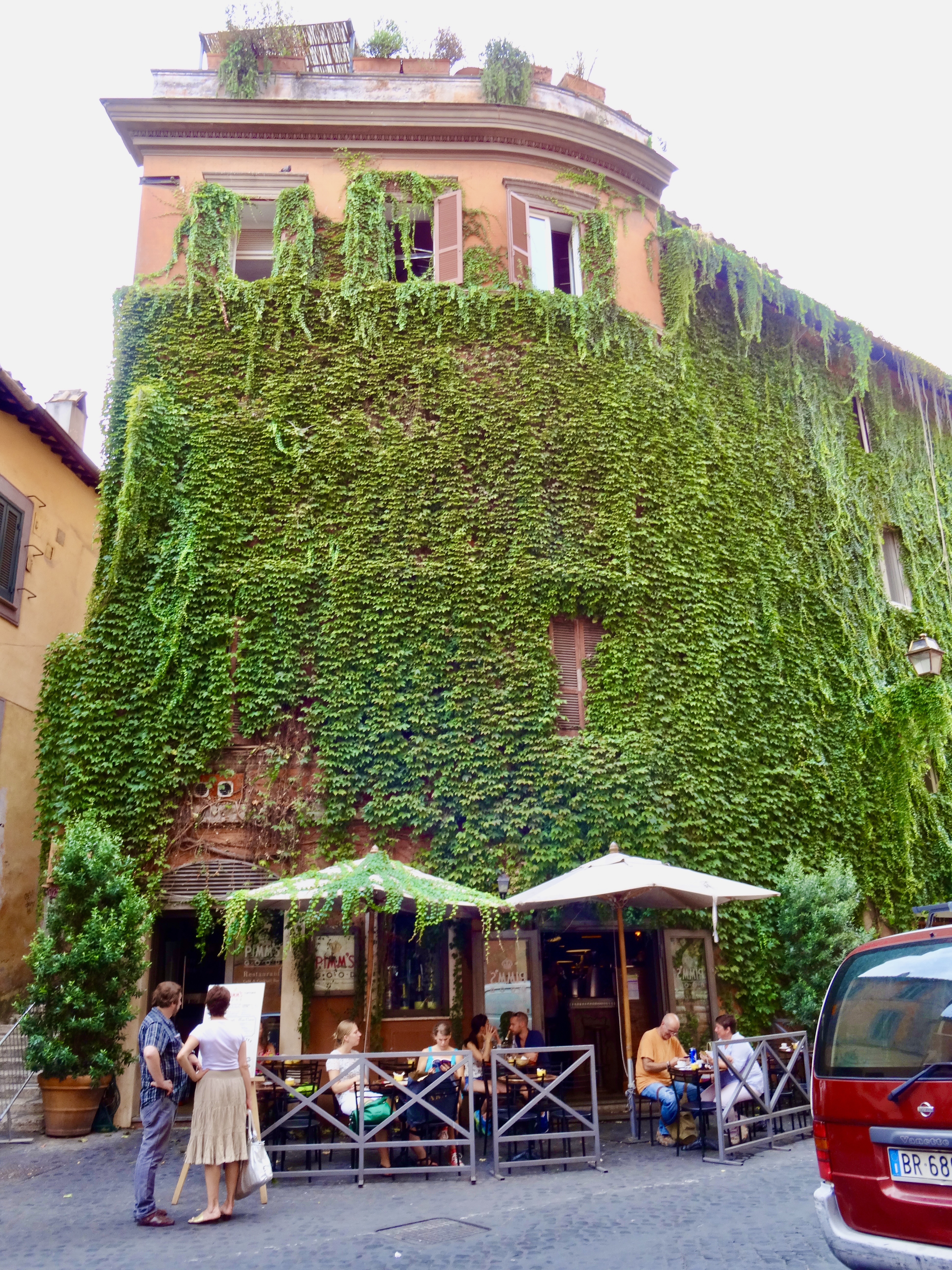 From San Lorenzo we headed to Trastavere and again all walked in our own directions and arranged to meet up a few hours later. Eventually we all met and Richard and Mike decided to head back to the hotel (it was about 5) and Elizabeth and I continued to stroll and chat — eventually winding up at a little café continuing our conversation with white wine. We headed back to the hotel at about 8 pm… just in time to change to go to dinner… We decided to eat at a place about a mile from the hotel. Turned out to be quite good… Mike and I shared a fantastic antipasti of fried baby squid with shredded squash… fantastic.. followed by buccatini all’ amatriciana.. followed by a really wonderful sea bass… Good white wine and then red wine. Skipped dessert and finished eating at about 11 pm. Mike and Richard opted for a taxi back to the hotel and Elizabeth and I decided to walk back — just one mile (I sort of forgot that I was wearing heels and also that it was an uphill walk). But we made it (although we got lost once or twice so I think the mile turned into at least a mile and a half. Needed to use iPhone for directions and also as a flashlight on the dark streets, many without sidewalks and a lot of uneven pavement. Probably not a super idea given my “golfers vasculitis” but I’m fine.. made it here safe and sound — just in time to pack up to leave in the morning.