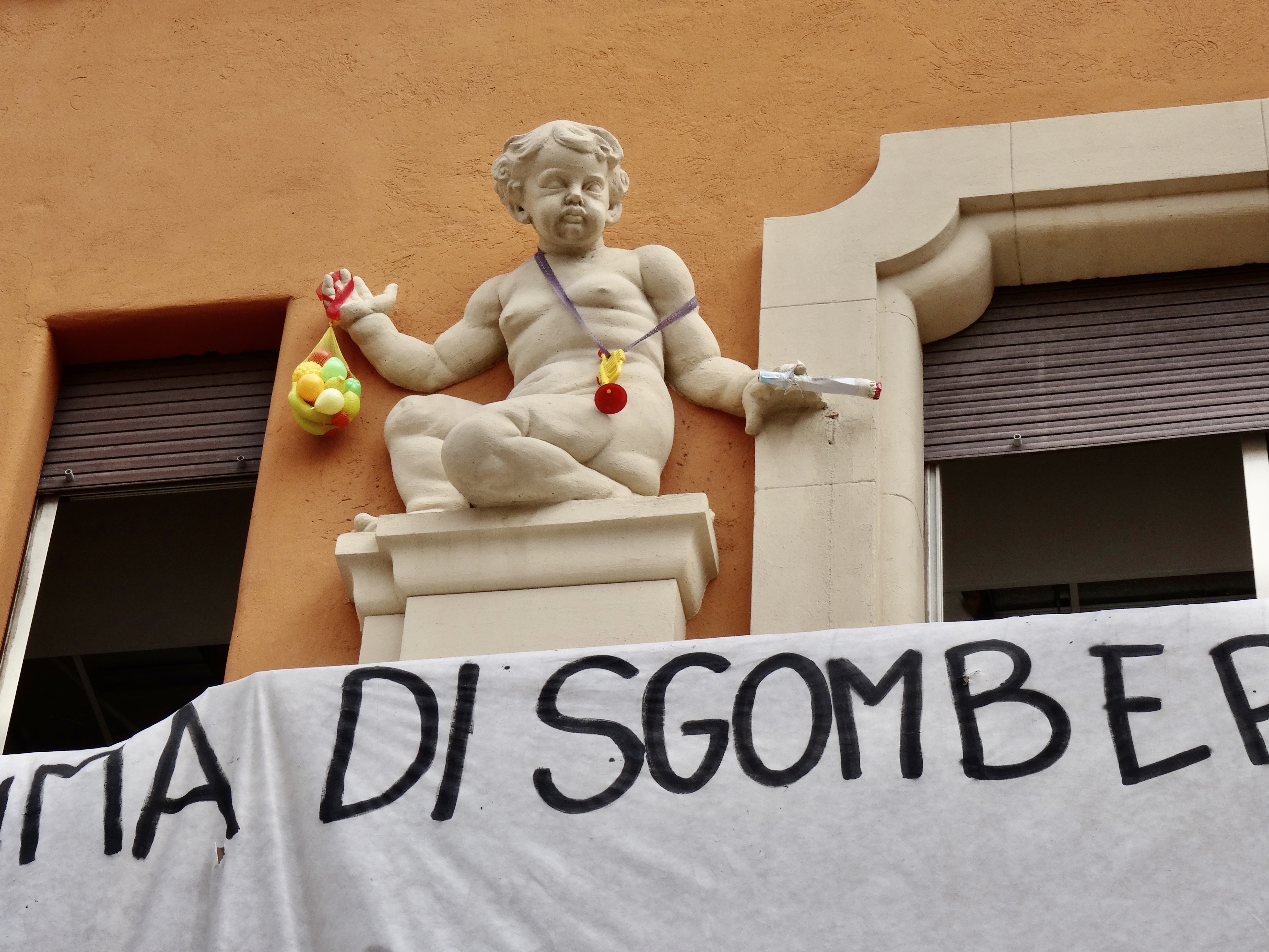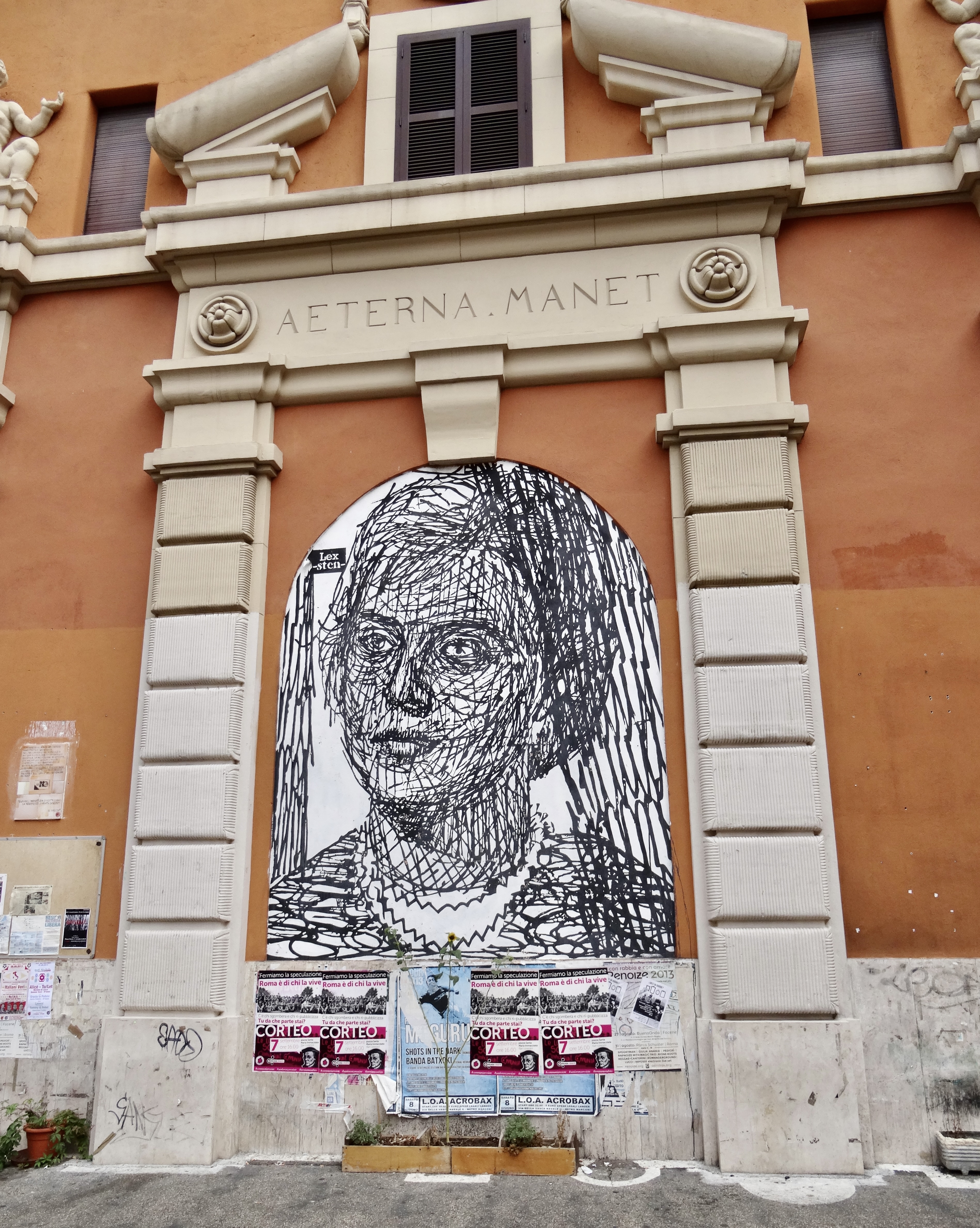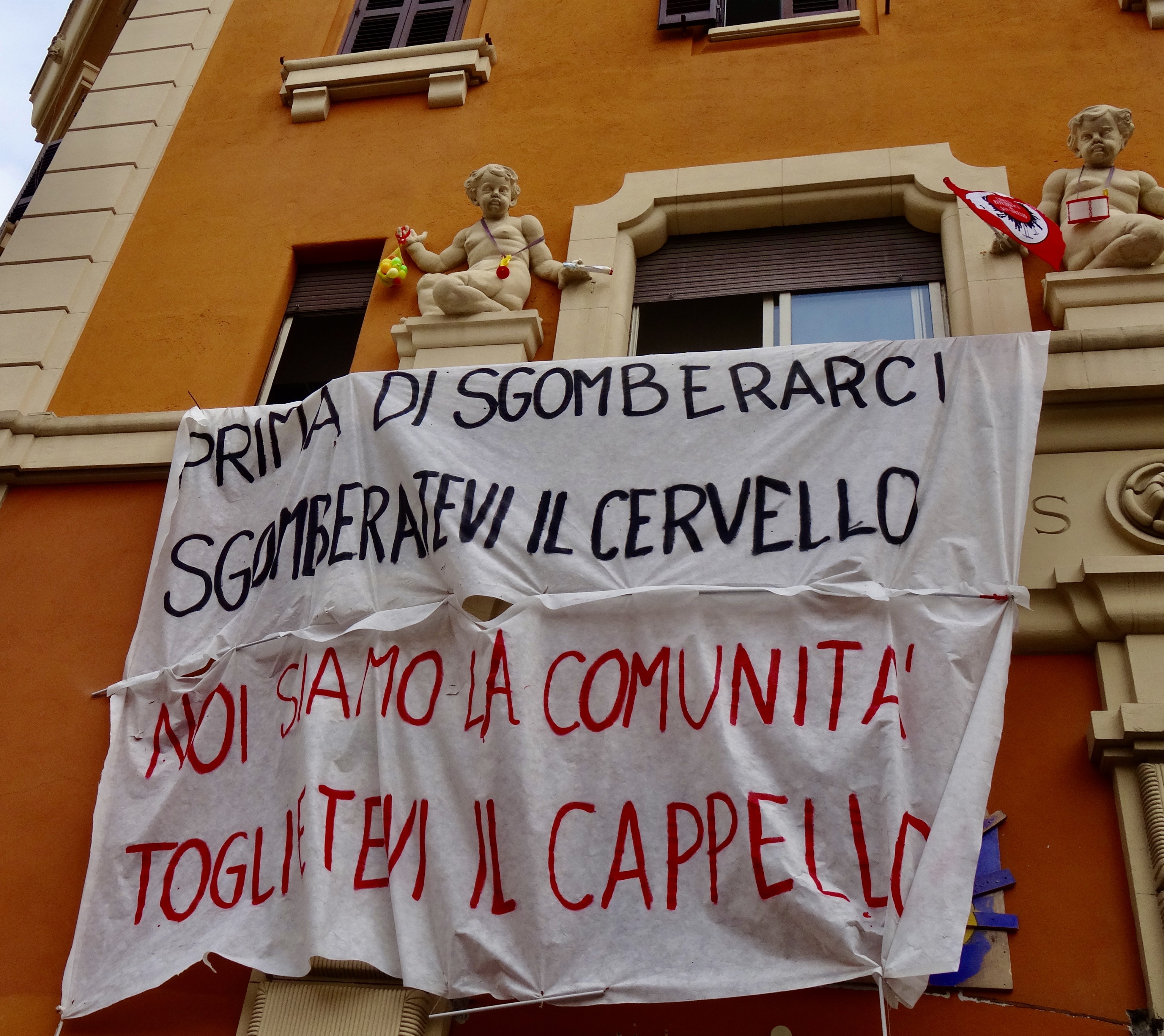 We all met up at the appointed time and then added another hour to our meet-up… and then decided to head to the San Lorenzo neighborhood which I had read about. San Lorenzo is actually adjacent to the Termini train station and is considered to be Rome’s new “Left Bank” — filled with students and artists and is close to La Sapienza University. Calling it the Left Bank is a bit of a stretch.. actually more than “a bit”… It’s pretty seedy and lacks any really “special places” — but you can see that gentrification is happening and the location — so close to the center — is an obvious draw as the center has no way to grow to accommodate new residents. Richard and Mike strolled in one direction and Elizabeth and I went in the opposite direction. As we walked, I was photographing many different things and we stumbled upon a building that had clearly been taken over by squatters — complete with banners, signs, etc. We could translate just enough to get the picture and understand that this was an anti-speculation protest. As I photographed a woman approached us asking if we were journalists. She proceeded to tell us the story of the building and what is happening in San Lorenzo. To make a very long story short (longer story since getting the information in half Italian/half English made it more complicated)… the protest involves the fact that a few years ago the city allowed artists to move into a dilapidated building — with a contractual agreement that they fix up the units and then vacate them in a given number of years following the renovation. Now, as the units have been renovated by the artists, the building has been purchased and the new owner does not want to keep to the contracted agreement and wants the tenants out. Turns out several members of the Rome City Council are developers and friends of developers…