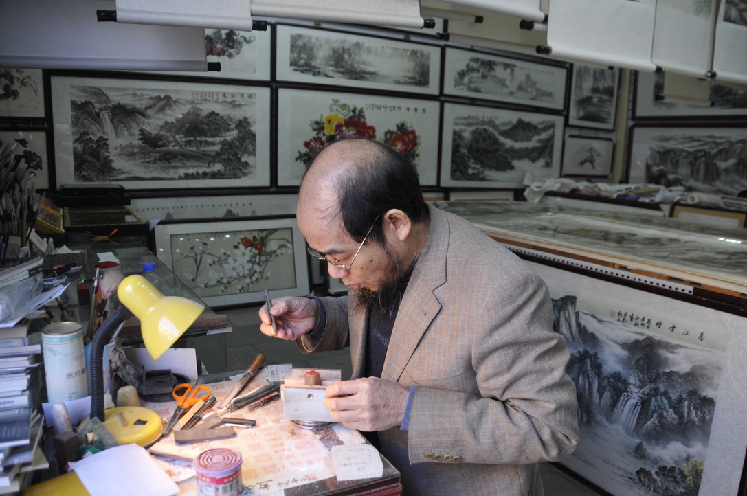 Through the years, the vendors started selling other goods and over time these commercial ventures replaced the tile factory. Calligraphy shops were added later and the area became known for selling paper, brushes, ink slabs, etc… and for its book stores.. From what we’ve read, it became a haven for scholars. But in more recent years it fell into disarray. In the 1980s it got a facelift (maybe payback for removing a good chunk of the neighborhood?).. and now there are about 100 small shops lining the little narrow streets selling books, stamps, art, etc. It’s quite delightful. We strolled around and eventually bought two stone “stamps.” We spent a lot of time in the shop looking around before we picked the ones we wanted.. I think you’re supposed to buy your “sign” but we just picked what we liked.