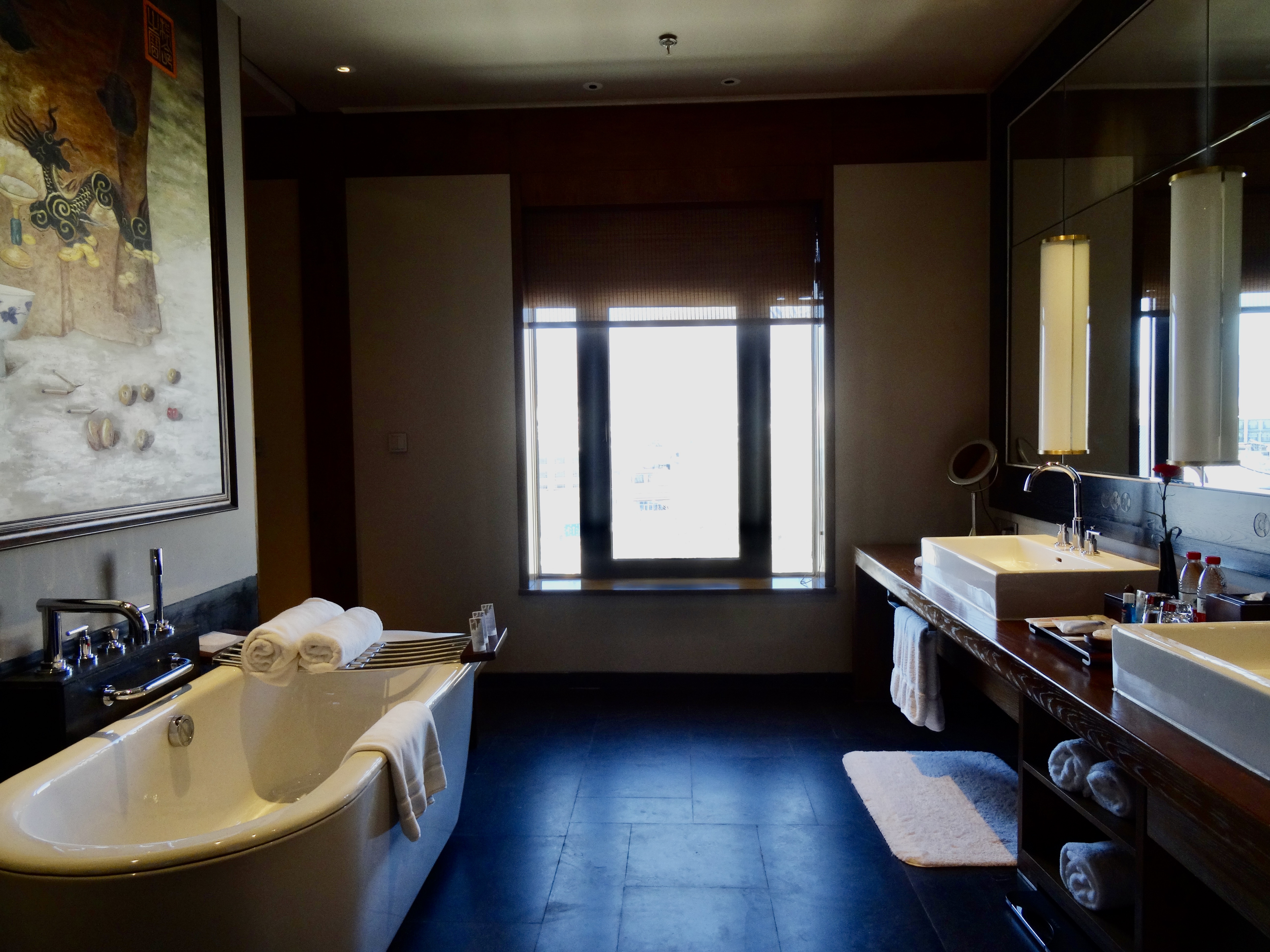 And here we are in a suite (they upgraded us because of my Starwood status and probably because the hotel is empty.) Our room overlooks the Portola Palace.. It’s about 1,200 sq. ft. which is about 20x as large as our train cabin… the bathroom suite alone is about 300 sq. ft.. Mike says he can house a family of about six in this room.