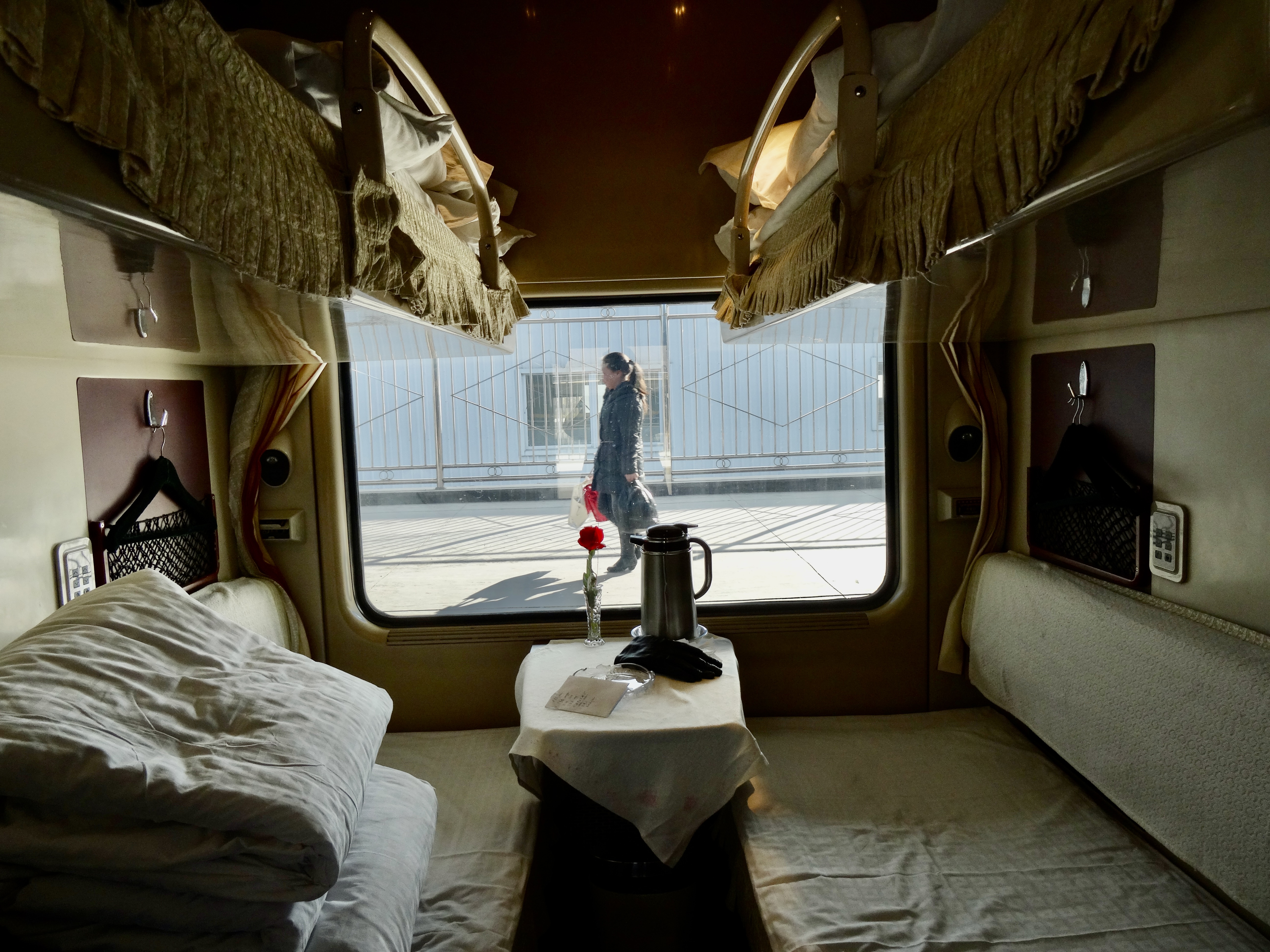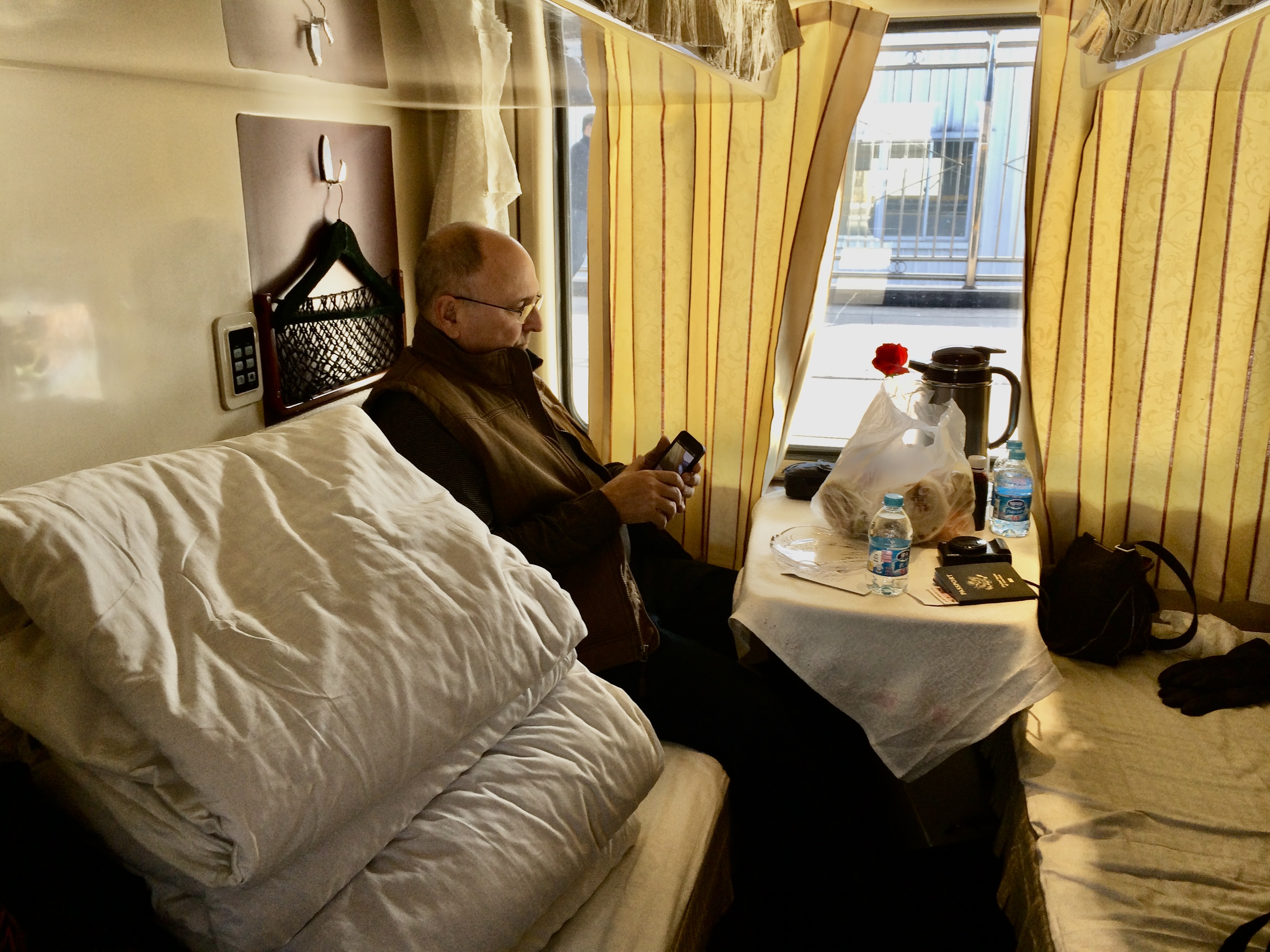 The system is a little strange. We got four tickets (one for each bed) although they only “checked” two of them because they count people not beds, I think. But we held tightly to all four tickets in case someone tried to come into the cabin and use one of the beds. Then once we were in the cabin (as described above) a woman in uniform (actually a lot of people in uniform on the train) came by with a leather book with slits and page She asked for the tickets and carefully placed the four tickets on one page in the slits and handed us plastic tickets sort of like credit cards. We didn’t really understand but in very few English words we think she said that at the end she gives us back the paper tickets and we give her the plastic ones. Seemed like a very unnecessary step, but a policing process. It was now about 3:30 pm.