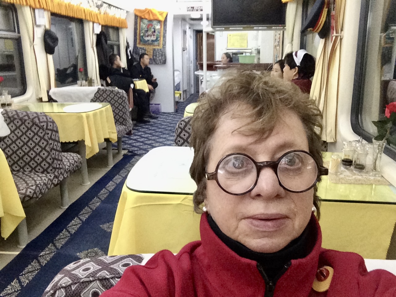 They said dinner was from 6 – 8 and we came at 7. At 7:30, we were shooed out of the dining car. Don’t know why, but we obeyed and went to our little cabin, where we stayed until morning. Never really slept soundly, but did nap on and off. Beds were hard, pillows hard and quilts very very heavy. We had both also developed little tingling feelings in our fingers which we attributed to the altitude pills, but after some research think it might be from the altitude itself. My cold continues but it’s less extreme… cough nearly gone; now just a little stuffed up and intermittent laryngitis. And Mike has a headache.