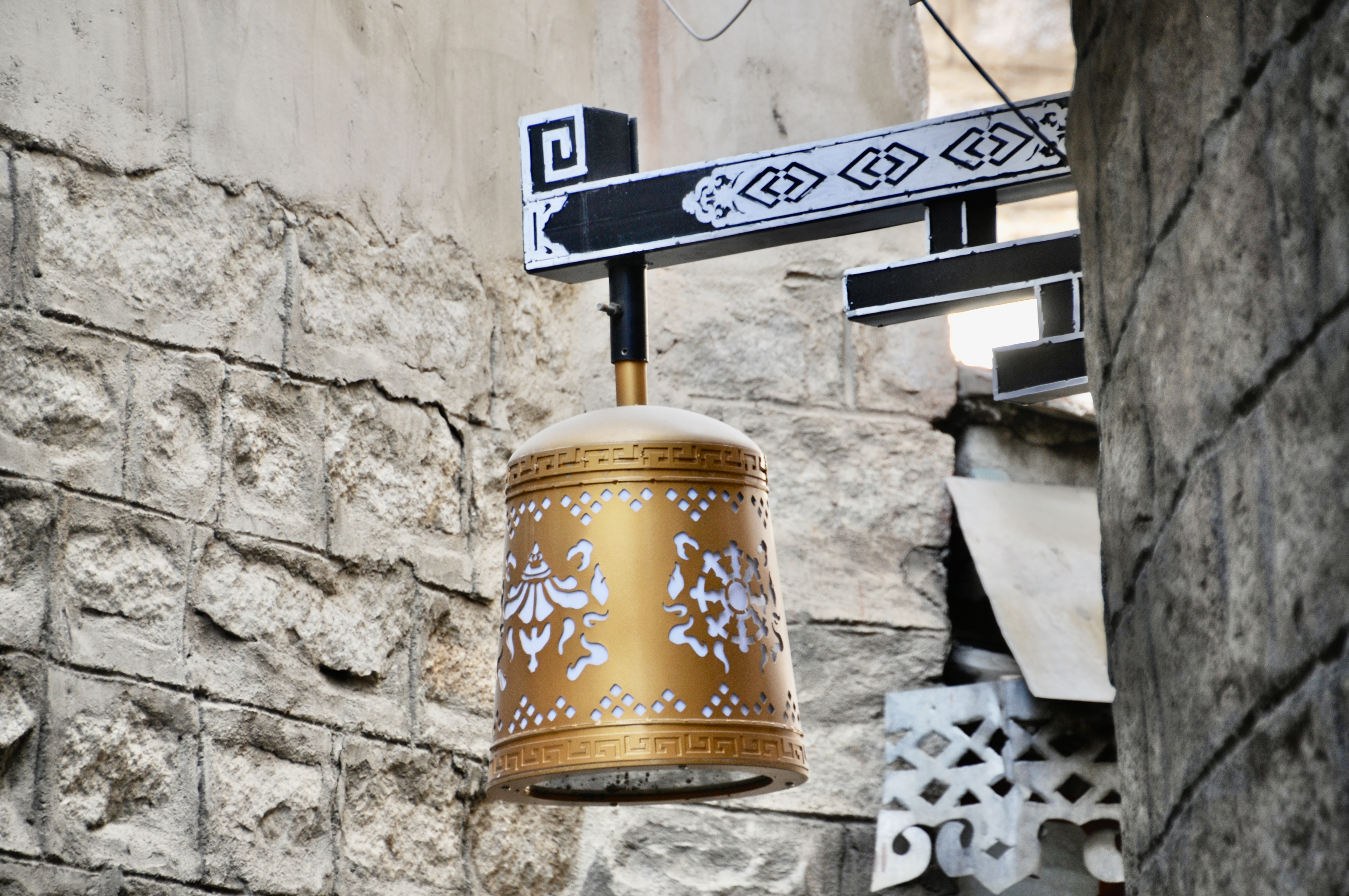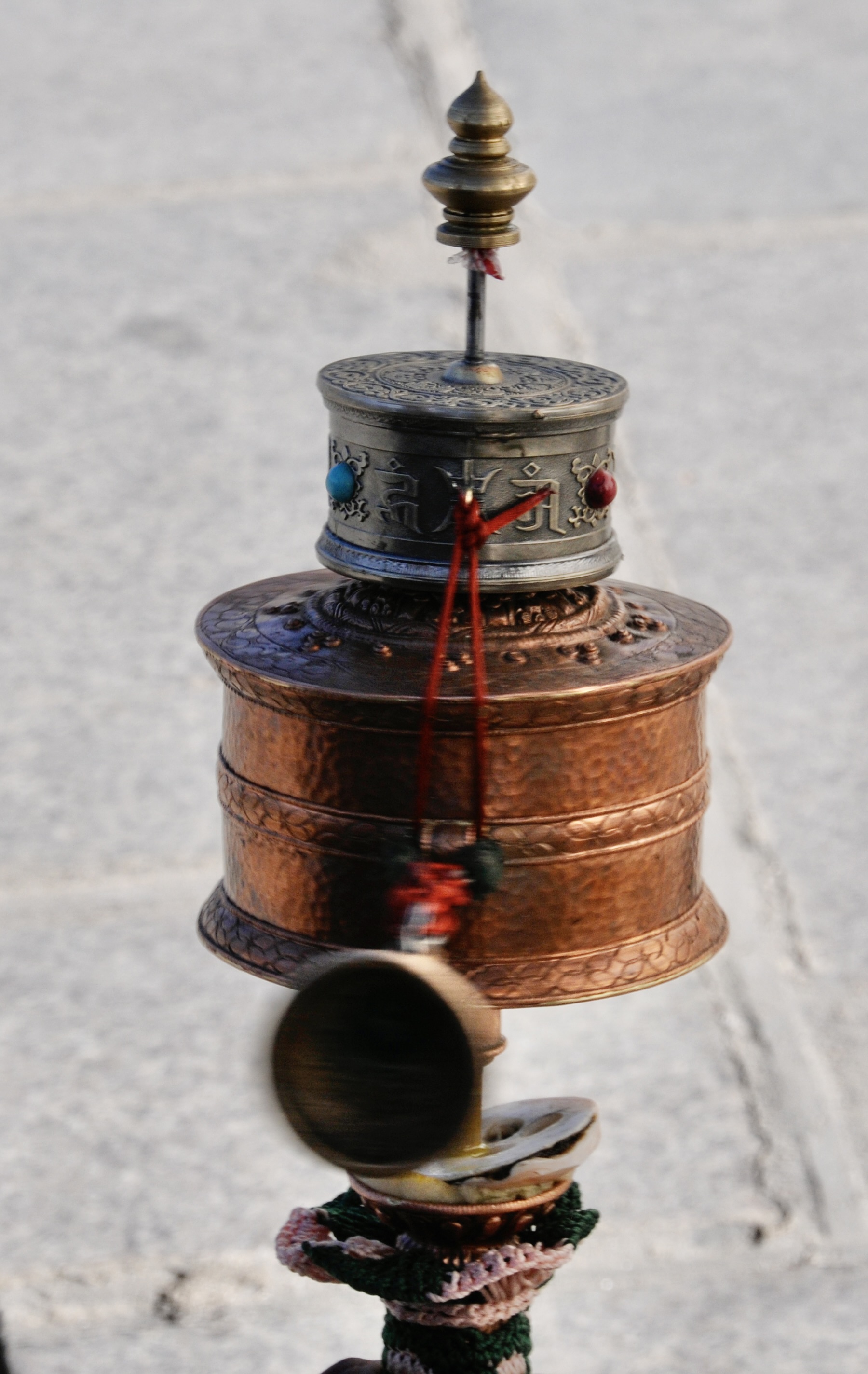 After this we went for lunch.. Mike had sizzling yak steak and I had momo stuffed with yak. And then we left Pemba (amid all of his warnings about our safety) and were off on our own (guide-less) to the old section of Lhasa.. and on a mission to find a shop called Dropenling that we had heard about where you can buy authentic Tibetan-made products and where the proceeds all go to support Tibetan village artisans. (We have researched these kinds of places in all of our travels to developing nations and it is always a big success.) No one at the hotel had ever heard of it, but they found it on the Internet (as had we) and explained (in general) where it was.. so off we went.. It was in the oldest section, close to the mosque and Muslim part of town. It took a while, but we did find the shop… It was closed.. But in that same area in a courtyard were lots of metal smiths hammering out parts to come together to make a statue of — what else — Buddha. We continued our walk and exploration down the narrow alleys.. and for a short time joined in with the pilgrims who walk around Barkor Street in the same direction circumnavigating Jokang Temple.. This happens daily at particular times of day..