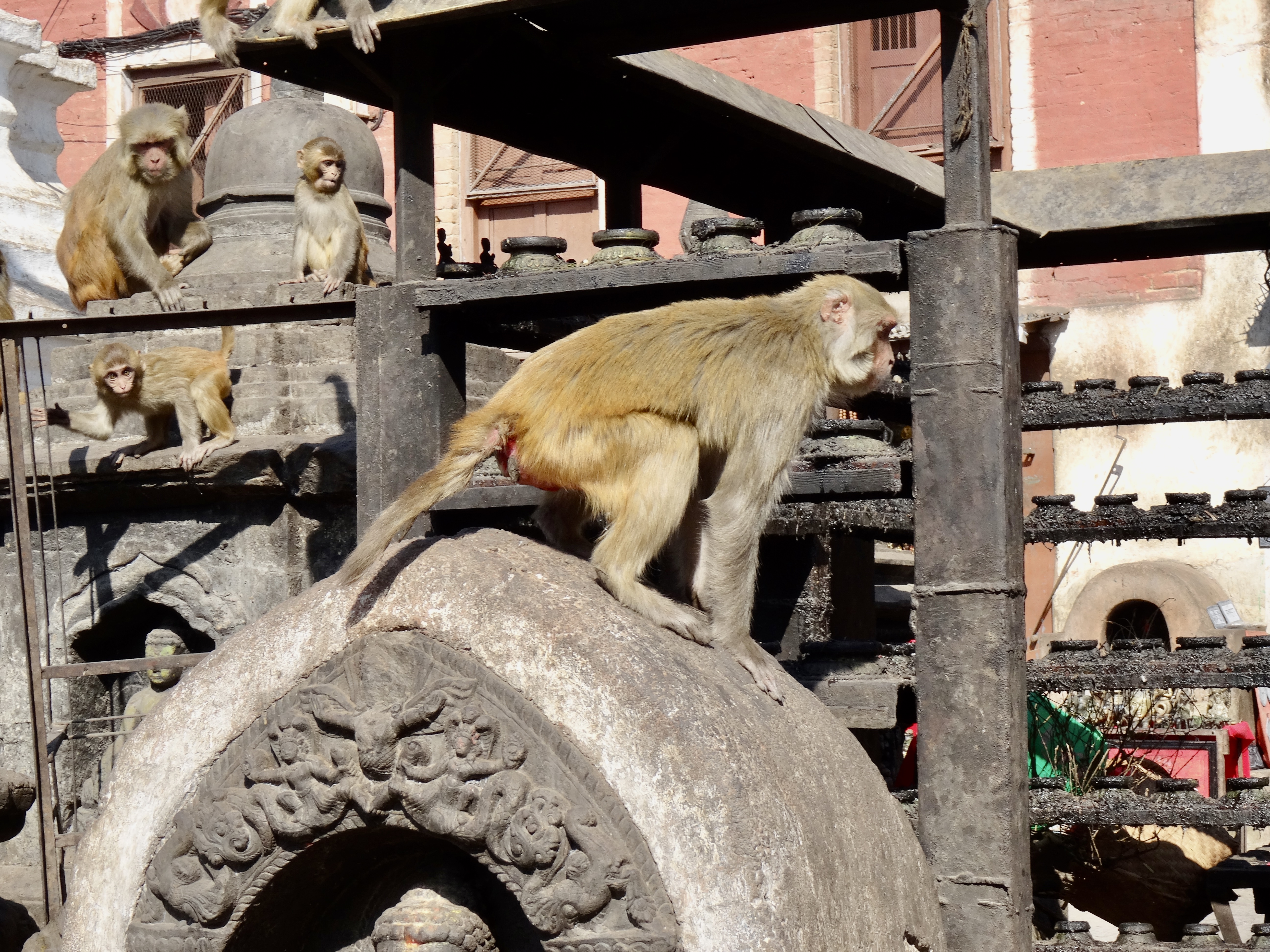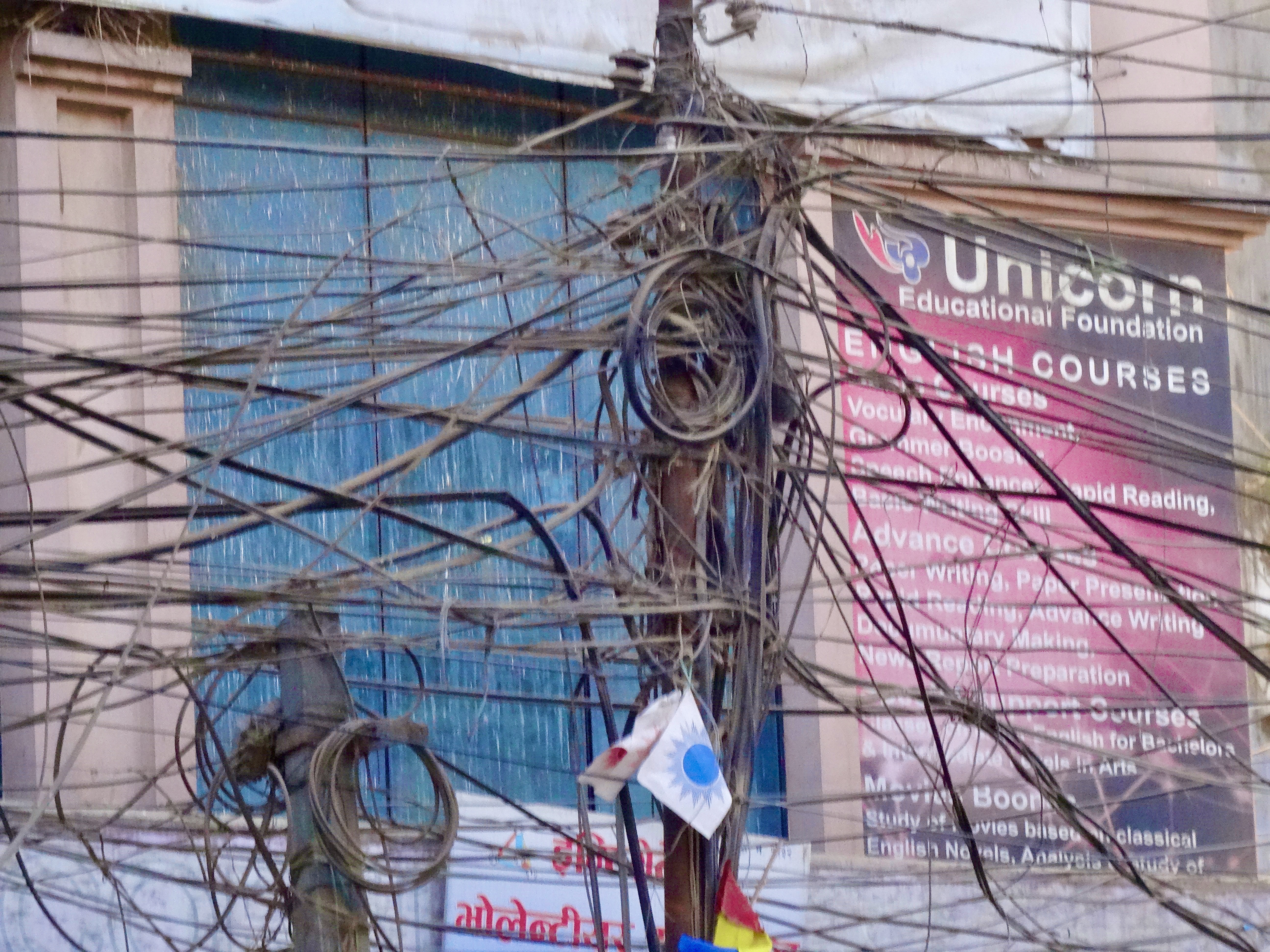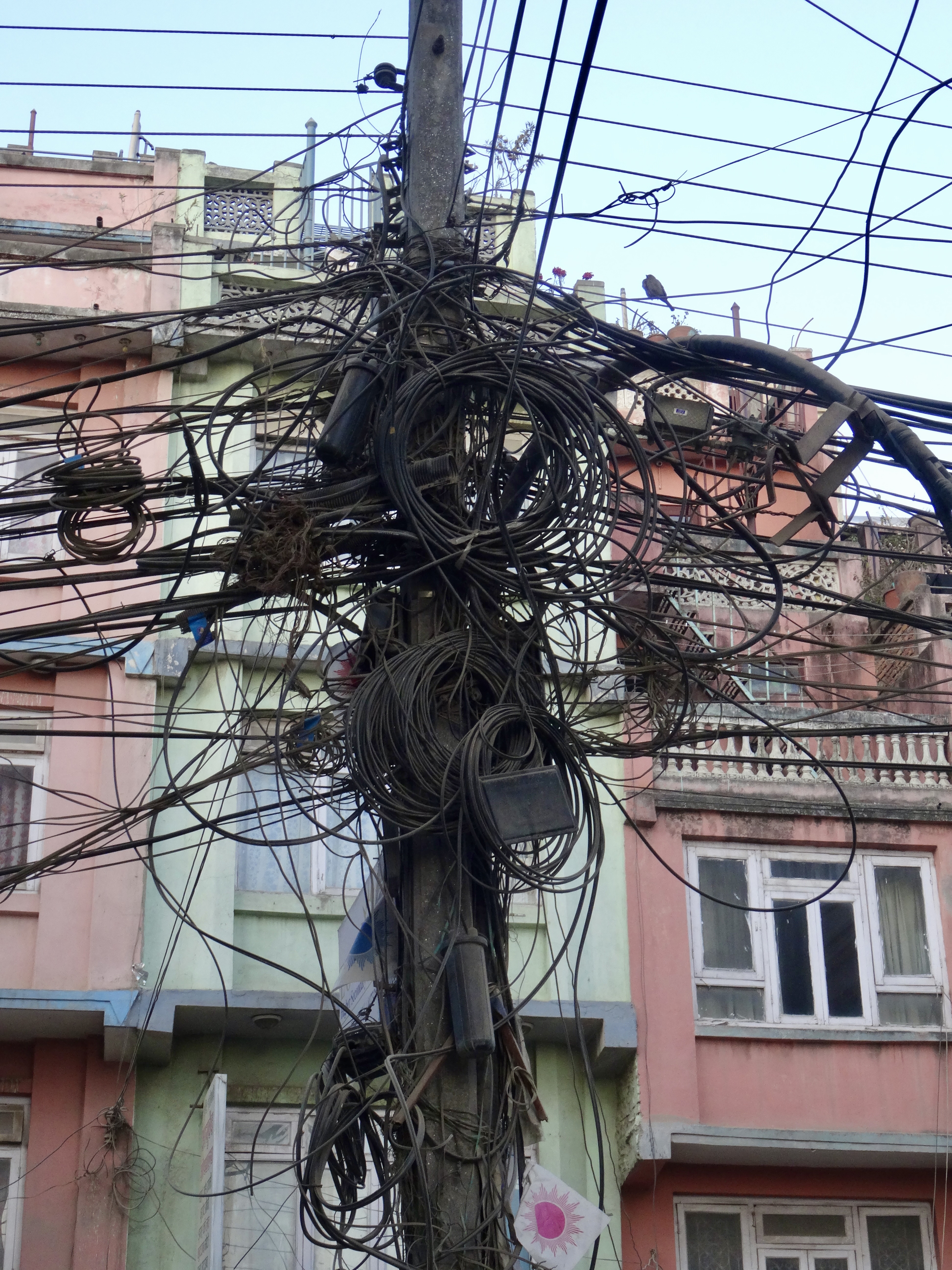 Had a light lunch at the hotel, outside in the sun (it was about 65 degrees!) and then set off to take a walk in the area near here, which is quite different from the hotel itself. Once you leave the nirvana of Dwarikas, it’s definitely a developing nation — a city with potholes that reach knee-deep on the sidewalks (?) without warning; buildings constructed ad hoc and torn down even more ad hoc; electric wires hanging down to my ankles and a cacophony of wires above — everywhere; piles of bricks just scattered about; motorcycles zipping down the streets making crossing from one side to the other a challenge. It’s a far cry from the orderliness and rules of Lhasa! From these first few hours another striking point is that we don’t see people on iPhones! We walked for about two hours and then settled into the hotel. Oh, and there are monkeys everywhere–on the wires, on buildings, walking about…everywhere.
