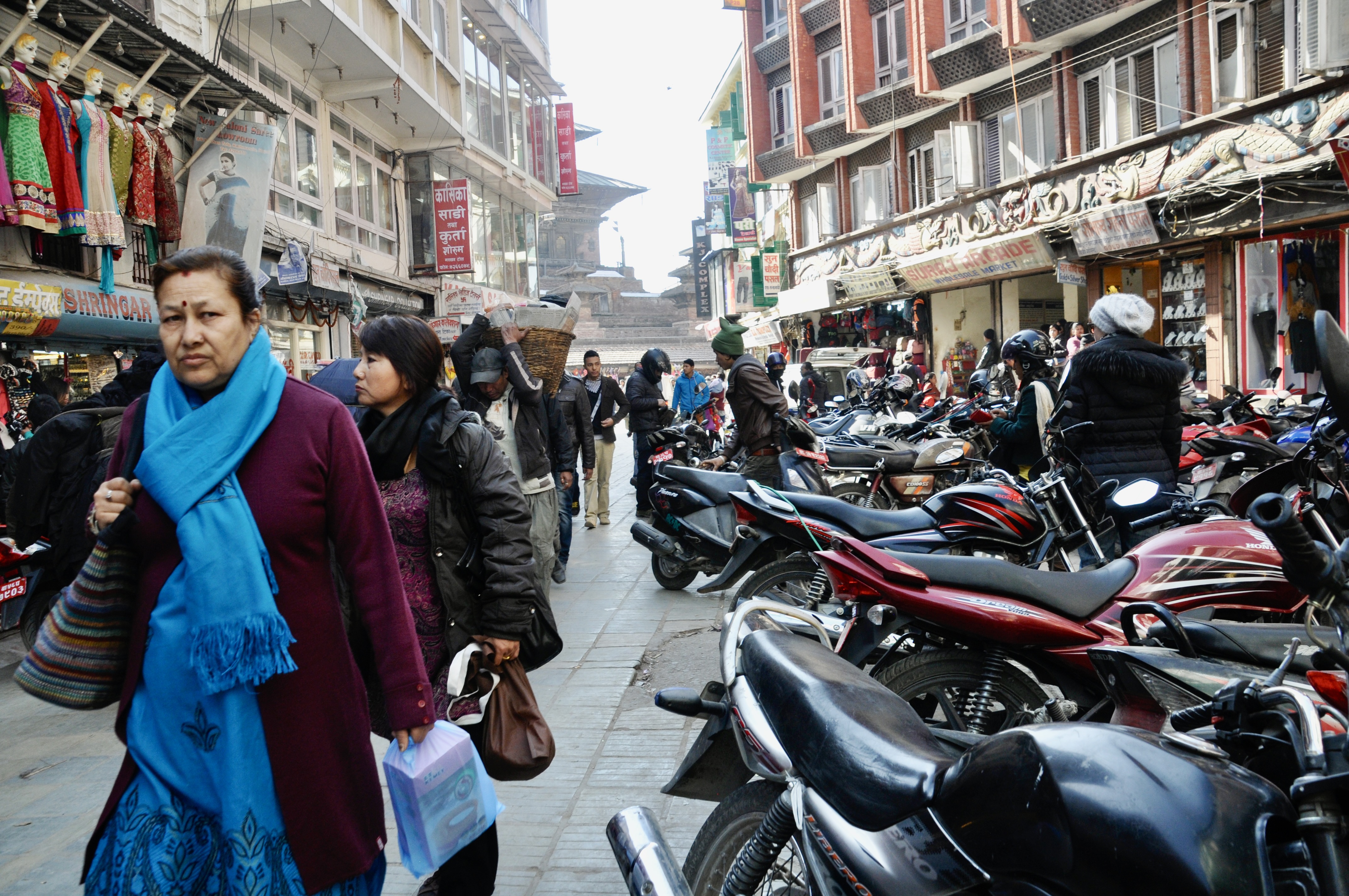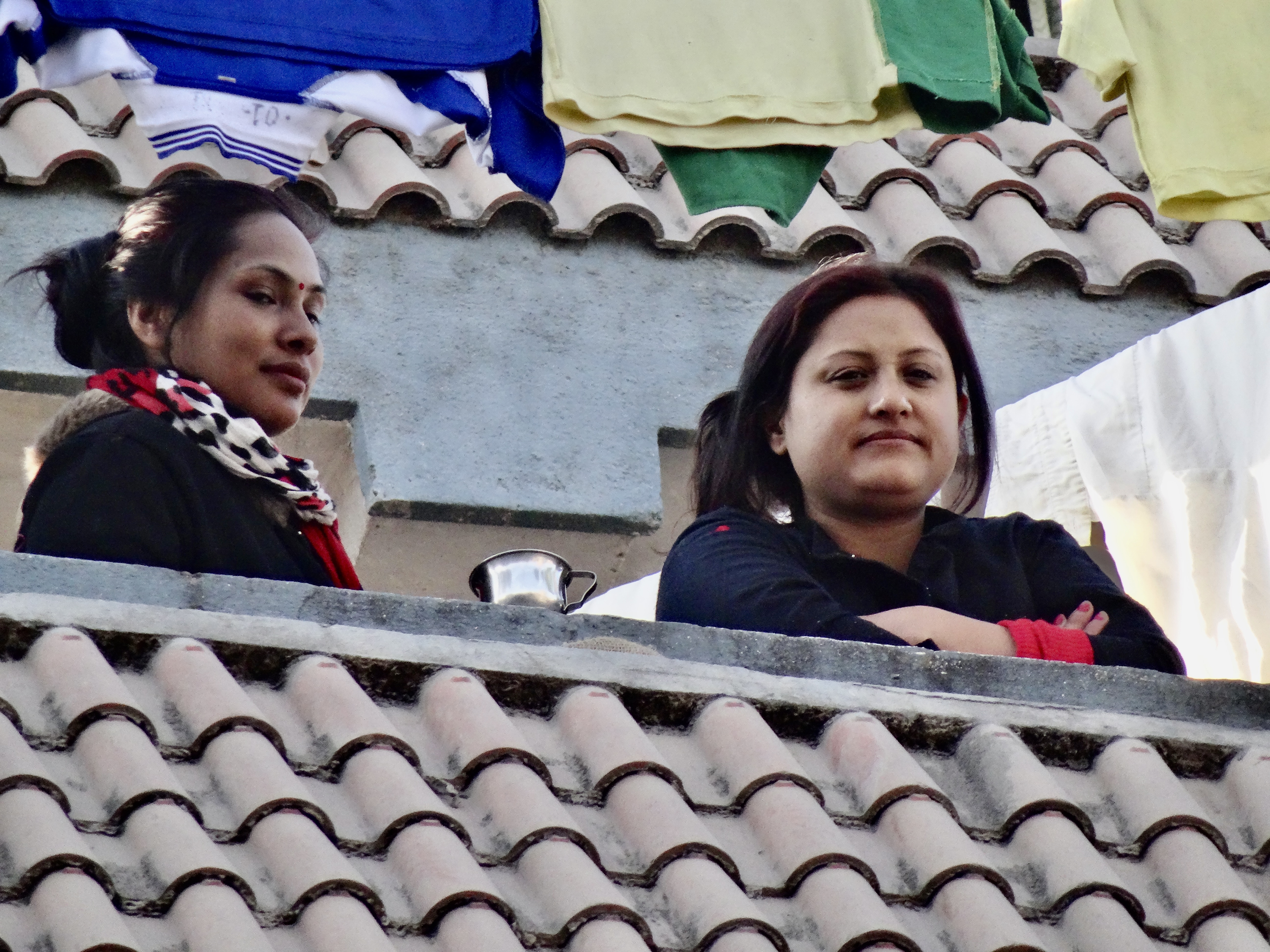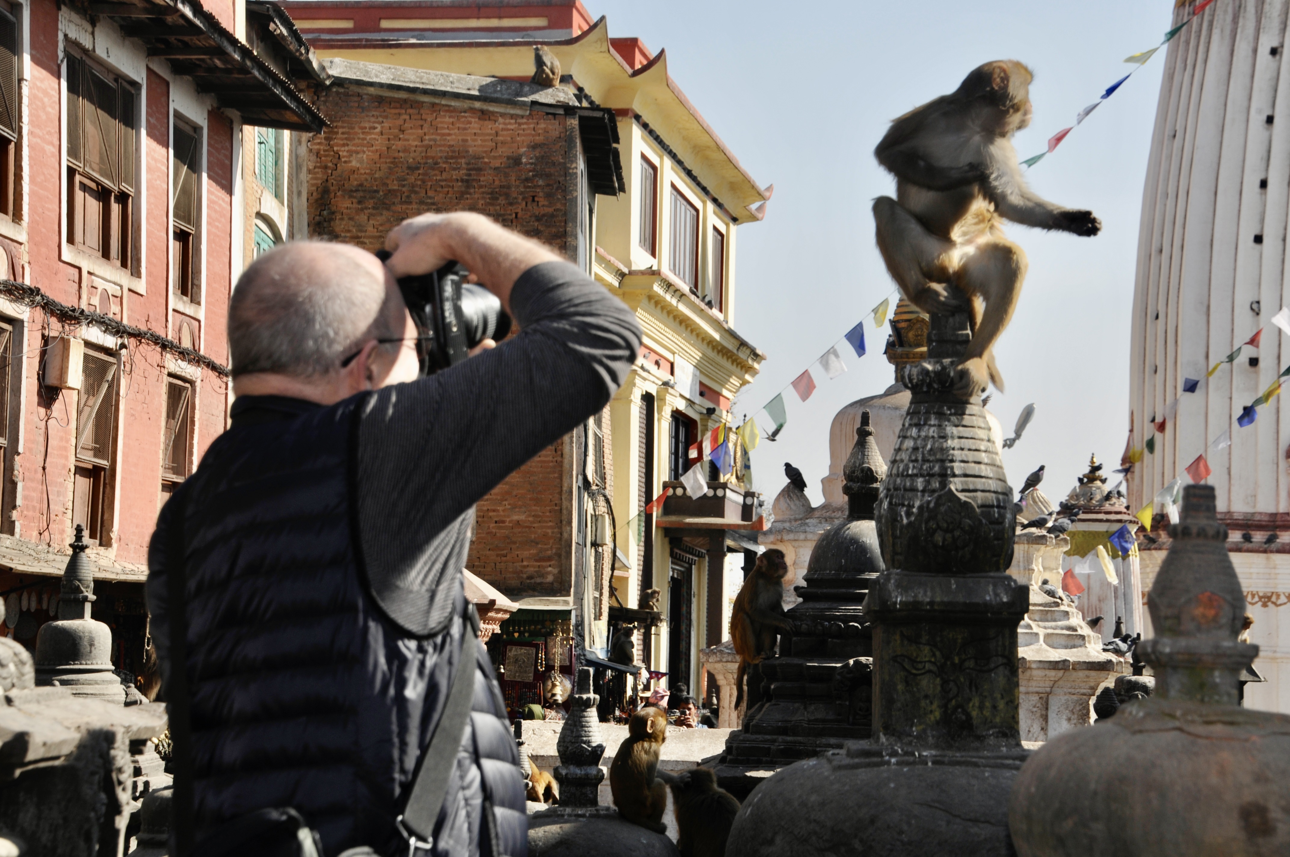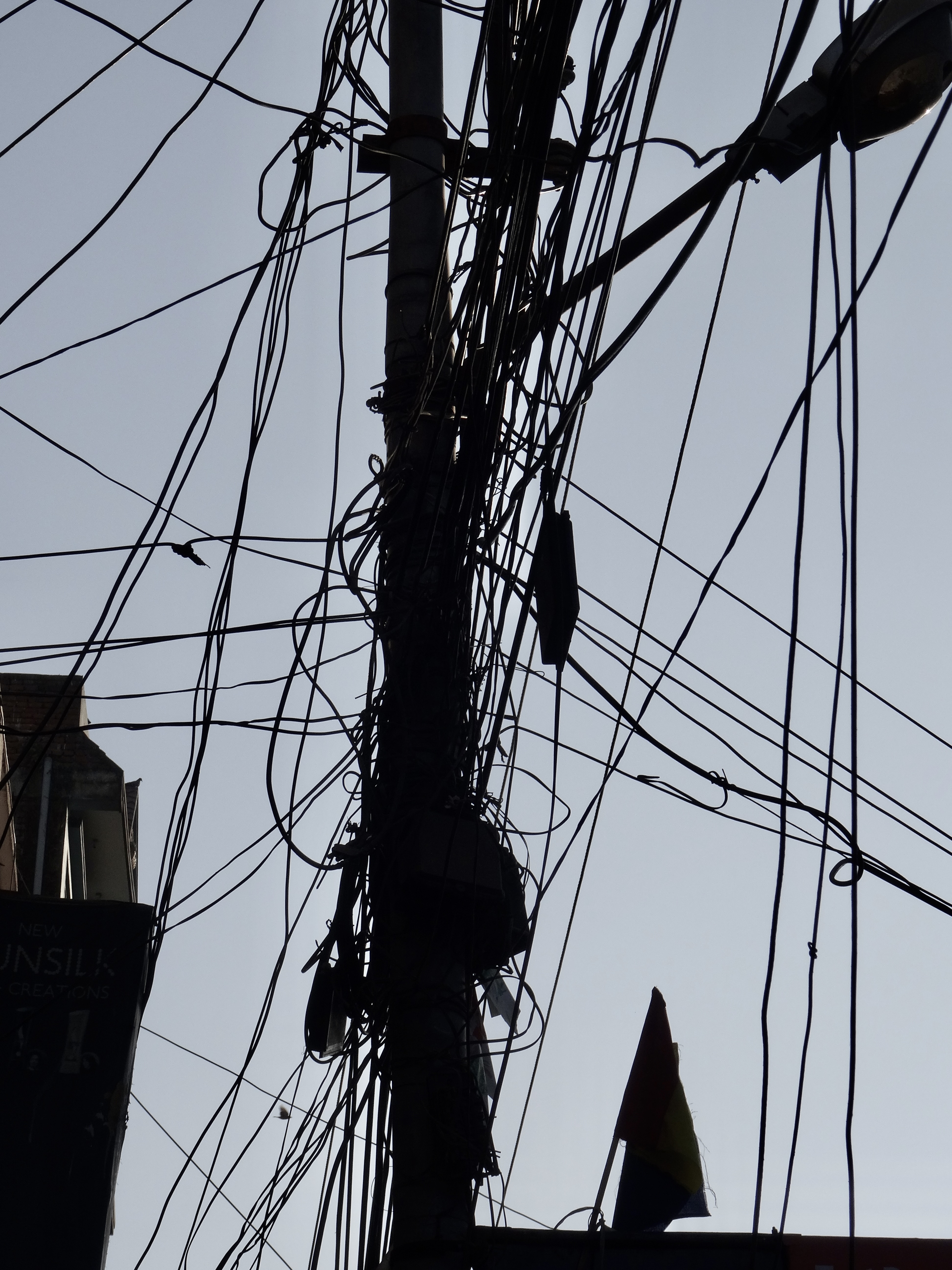 Had a light lunch at the hotel, outside in the sun (it was about 65 degrees!) and then set off to take a walk in the area near here, which is quite different from the hotel itself. Once you leave the nirvana of Dwarikas, it’s definitely a developing nation — a city with potholes that reach knee-deep on the sidewalks (?) without warning; buildings constructed ad hoc and torn down even more ad hoc; electric wires hanging down to my ankles and a cacophony of wires above — everywhere; piles of bricks just scattered about; motorcycles zipping down the streets making crossing from one side to the other a challenge. It’s a far cry from the orderliness and rules of Lhasa! From these first few hours another striking point is that we don’t see people on iPhones! We walked for about two hours and then settled into the hotel. Oh, and there are monkeys everywhere–on the wires, on buildings, walking about…everywhere.