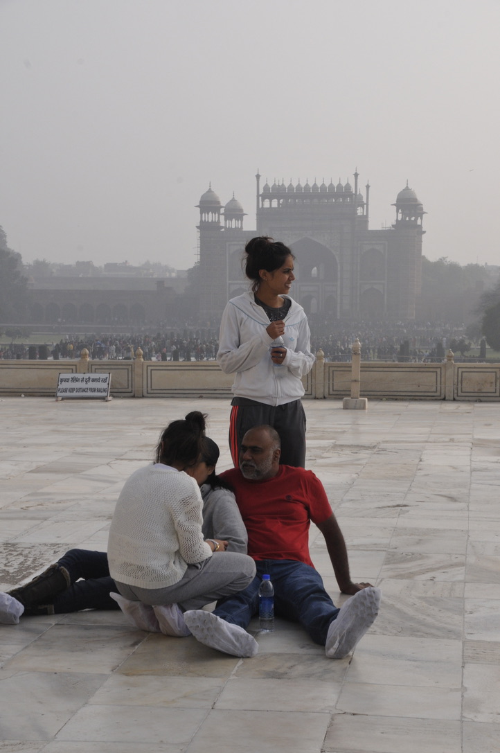 The weather was awful.. fog and some kind of inversion trapping all the pollution, making visibility near zero. It was actually pretty frightening at times with about 40 feet of visibility – max; couldn’t see anything in front of us or on either side for at least 45 minutes. We laughed saying that the title of today’s report might be “We went to see the Taj but it had disappeared.” It’s a five- or six-lane highway for most of the three-hour journey, and despite the unbelievable lack of visibility.. cars were honking and passing the whole way.