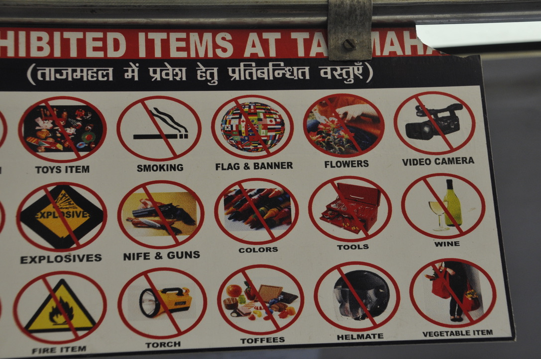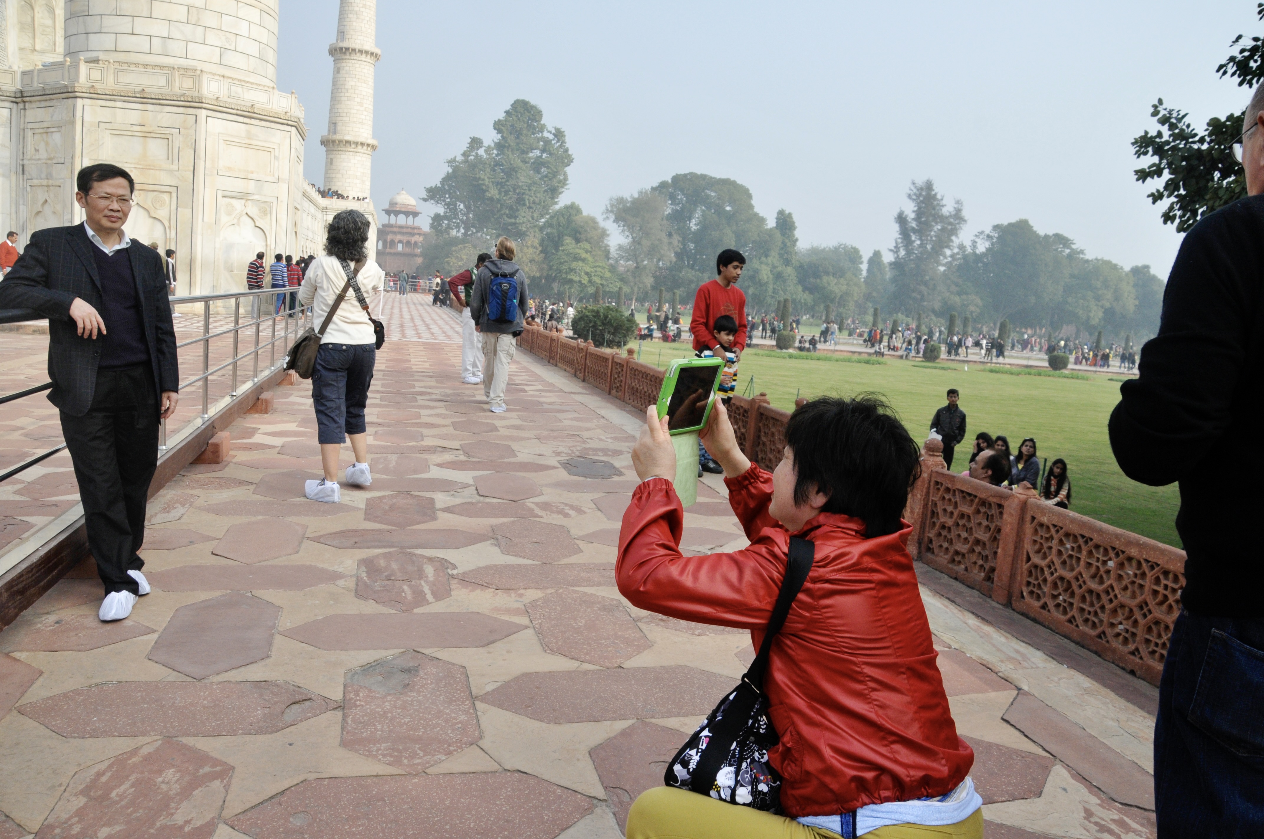 It took more than three hours given the fog— and we were beginning to worry whether or not we’d even see anything. Arrived in Agra and decided to have lunch before seeing the Taj. Went to a hotel and ate lunch.. and then took a pedal-powered rickshaw from the restaurant to the entrance of the Taj. India has an interesting approach to entry into its monuments. There’s a two-tiered fee structure: locals pay one rate and all foreigners pay a rate that is about 10 times greater. (Actually this part was the same in Nepal and Tibet, although not to such a great extent.) But once you get your “special” ticket, here in Delhi — you are referred to as a “high-value ticket holder” and you consistently go on different lines (actually adjacent lines) to the locals (who have the low-value tickets!).. So while the entry line snaked and snaked and probably would take about 30 minutes just to get to the front entry.. we were escorted right in.. no one on our lines. Again, though — a line for men and a line for women.. because of the security involved and the pat downs. So once again, I was in before Mike..