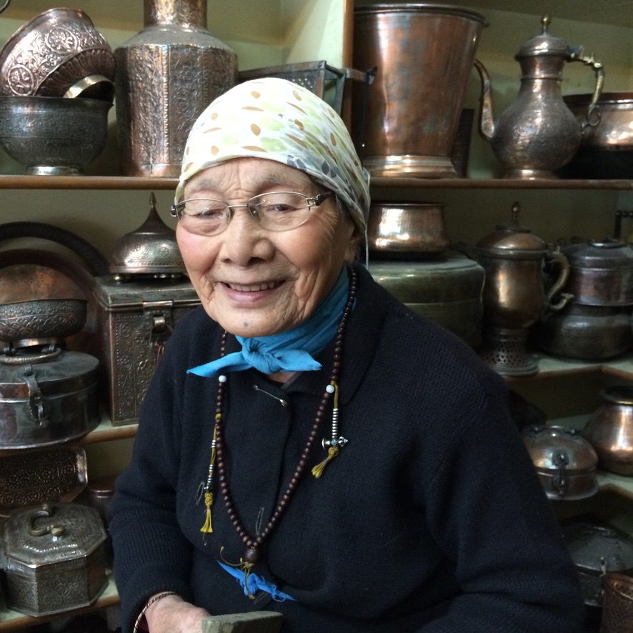 Then we strolled a bit, past little shops that are struggling because Delhi is building an extension to the Metro and many streets are blocked for the construction which has already lasted two years and will continue for another two.. We were taken by a little shop that sold copper goods and some wooden blocks used for stamping patterns on fabrics and walls. It appeared that no one was tending the shop, so we were about to leave when we heard a little voice say “I’m here!”… and lo and behold a woman about 4′ tall appeared. Turns out she’s Tibetan; came to Delhi 60 years ago — before the Chinese invaded Tibet. She was adorable. 88 years old; in seemingly good health; still working 7 days a week/10 hours each day in this little shop. Her English was remarkably good. She said she learned by working and talking to customers. She has one son who owns a little inn up north and she has three grandchildren — one of whom lives in Jersey City. He’s a dancer — not a good profession for a boy, she told us — it’s for girls. And she wrinkled her nose as she told us this information. She thinks he’s a little crazy.