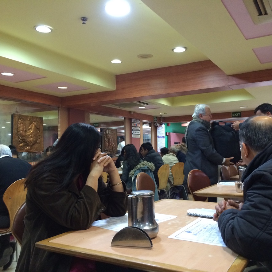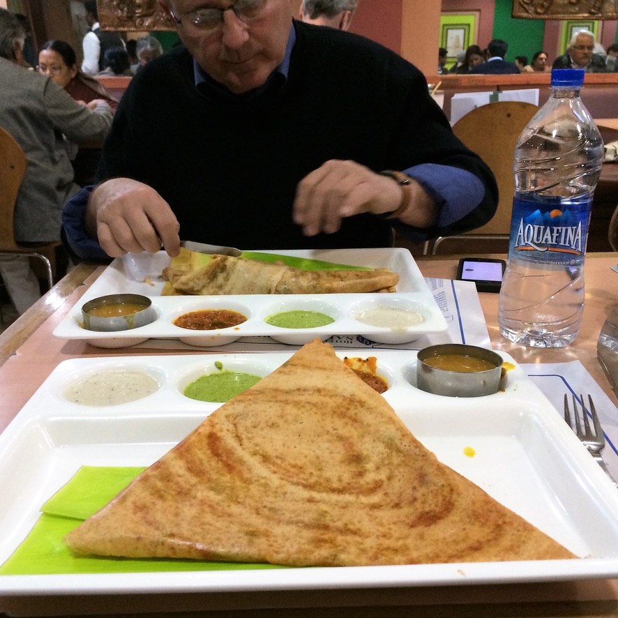 Decided to take it easy, given that it would be a very very long day and night and next day… So we slept in, had tea and muffins.. worked on our courses, to be prepared for classes later this week…. and then took a stroll down the street to eat at a little local joint called Servana Bhavan; they specialize in dosas. Ordered two different kinds (not really knowing what we were ordering). Everyone was Indian except us. Food was fine. Came on plastic platters.. and we drank (with some fear and trepidation about getting sick on the last day) water in tin cups washed with tap water. Oh well. Total cost for the lunch was about $3.