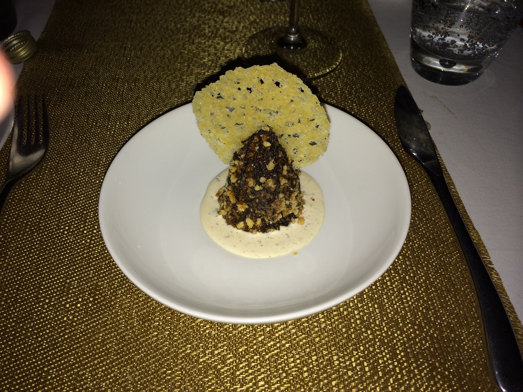 - Veggie – morel mushroom pinwheel with crushed walnut and parmesan papad; Non-Veggie – Chilean spare ribs coated in sun dried mango and toasted pumpkin seed (I think) (with shiraz)