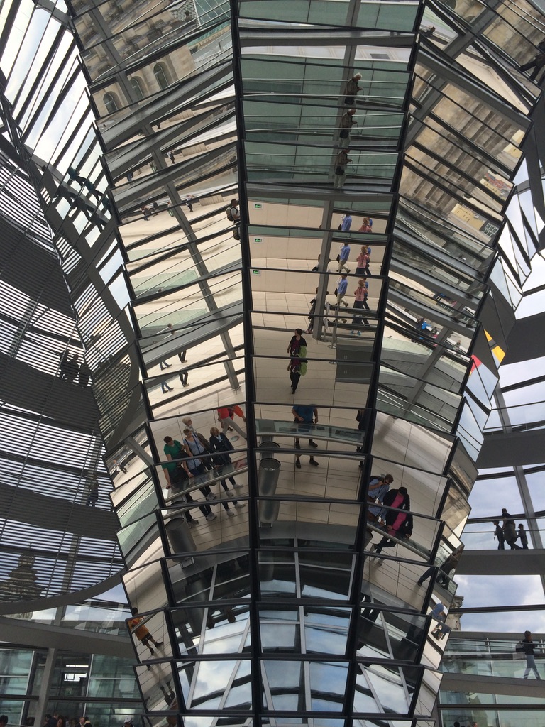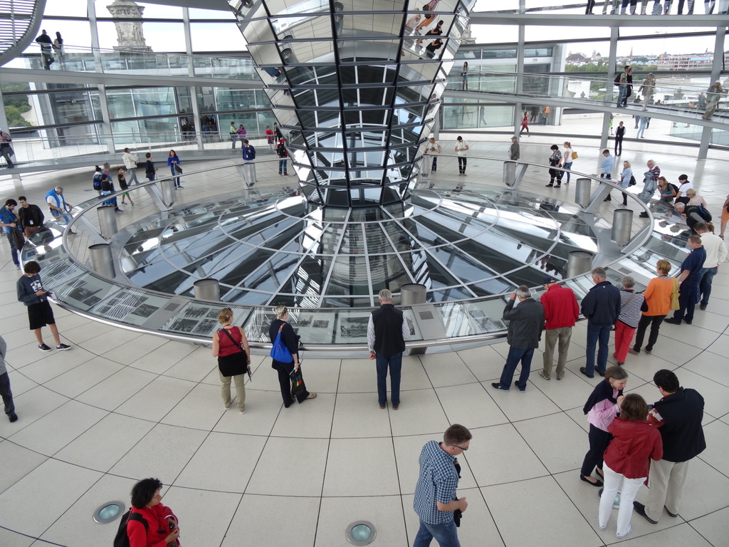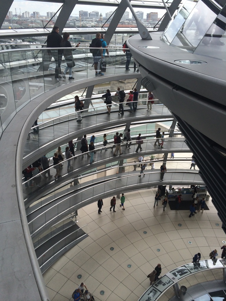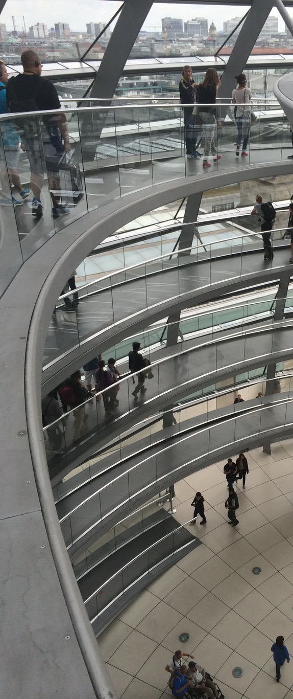 Fortunately, we were warned (advised) that we should make lunch reservations (The Reichstag is the only parliament building in the world with a public restaurant!).. because then you can breeze past the long lines of tourists trying to get in to see the building. And that we did! You take an elevator up about 7 or 8 stories to the base of the dome.. Underneath are offices (I presume). There’s a bit of security coming in and out with double doors capturing you in between the entry areas.. So once you get to the dome you already have a great view of the entire city — 360 degrees.. The Reichstag dome is glass, and is constructed on top of the building which was rebuilt after the war (and once it was decided to move the German capital back to Berlin from Bonn… According to the writings it was meant to symbolize the reunification of Germany. The debating chamber of the German Parliament is just below the dome. Inside, the center of the dome is dominated by a mirrored conical shape which (while they say brings sunlight into the chambers of the Parliament below) is actually a real fun space because you can see yourself and others reflected and fractured numerous times as you look up… I think the floor to ceiling height of the space is probably about 80 feet tall… Once inside you walk the edges of the space through two spiraling ramps… They say that this dome symbolizes that the people are above the government, a statement that things are different from the days of National Socialism. Mmmmm people “above” the government — or government by the people.. I suppose the dome is also a statement that symbolizes the future..