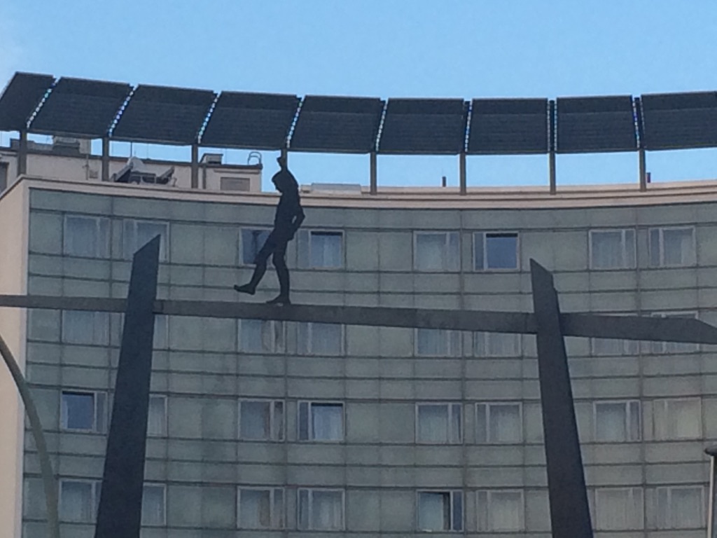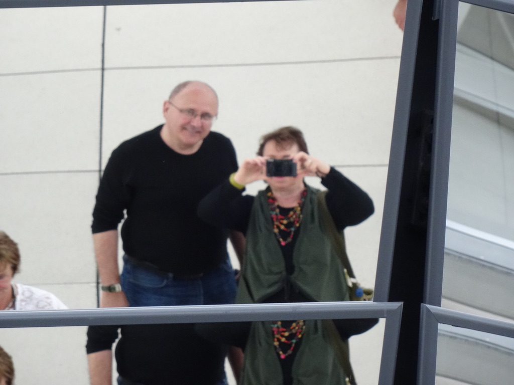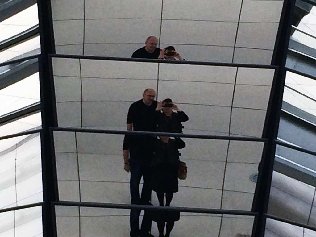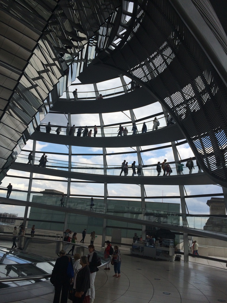 Fortunately, we were warned (advised) that we should make lunch reservations (The Reichstag is the only parliament building in the world with a public restaurant!).. because then you can breeze past the long lines of tourists trying to get in to see the building. And that we did! You take an elevator up about 7 or 8 stories to the base of the dome.. Underneath are offices (I presume). There’s a bit of security coming in and out with double doors capturing you in between the entry areas.. So once you get to the dome you already have a great view of the entire city — 360 degrees.. The Reichstag dome is glass, and is constructed on top of the building which was rebuilt after the war (and once it was decided to move the German capital back to Berlin from Bonn… According to the writings it was meant to symbolize the reunification of Germany. The debating chamber of the German Parliament is just below the dome. Inside, the center of the dome is dominated by a mirrored conical shape which (while they say brings sunlight into the chambers of the Parliament below) is actually a real fun space because you can see yourself and others reflected and fractured numerous times as you look up… I think the floor to ceiling height of the space is probably about 80 feet tall… Once inside you walk the edges of the space through two spiraling ramps… They say that this dome symbolizes that the people are above the government, a statement that things are different from the days of National Socialism. Mmmmm people “above” the government — or government by the people.. I suppose the dome is also a statement that symbolizes the future..