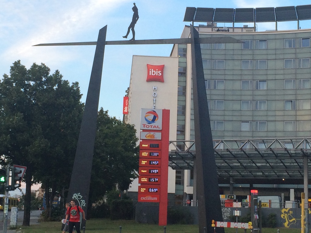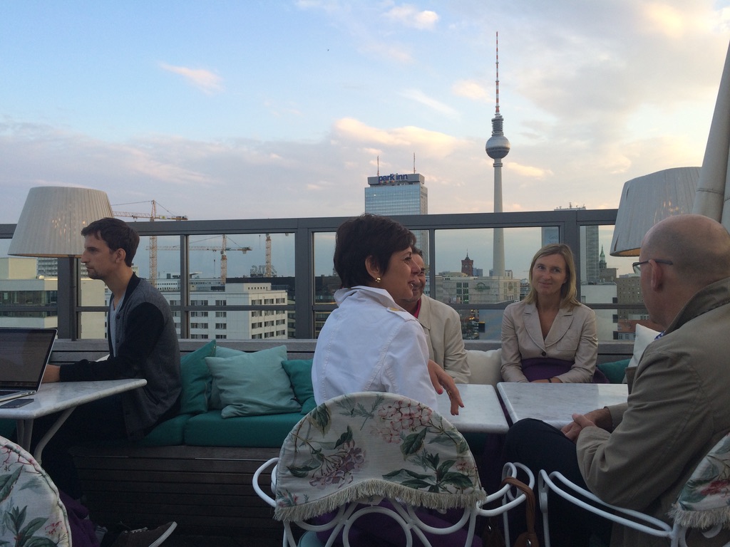 OK.. made it and off to Berlin we went. Decided to hop a taxi after arriving in Berlin.. tired, luggage, etc. Taxi dropped us off at a corner and said we were “there.” But the hotel building is so nondescript and absolutely no signage and no lit signs — totally understated from outside — that we actually walked around the corner before realizing the corner building was actually the hotel: Soho House Berlin. Soho House hotels is a company founded in London, in the mid-90s.. originally as a private members’ club for professionals in film, media and creative industries, but it has expanded to include hotel rooms. Thus the “hotel” is actually in two parts with some floors requiring key-access (for members) and others being more public floors. The building and the rooms are a strange cross between chintz and hip.. or maybe chintz is now hip– with exposed concrete beams and columns accompanied by rich floral patterns in the carpets! Rooms are large but somehow no desks… making it difficult to take care of the various projects I brought with me to do for the office. Top two floors have very casual but good restaurant, bar and roof bar with great views of the city. Since it’s a “club” — no photos or cell phones in any public spaces… and believe it or not, the rule is followed.