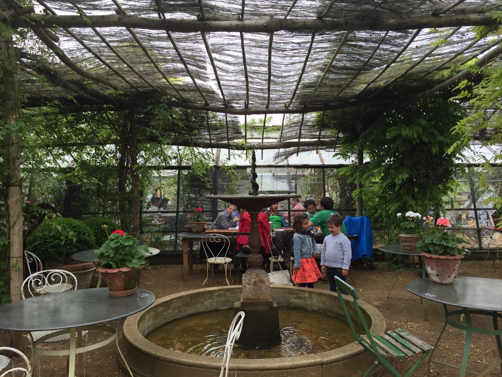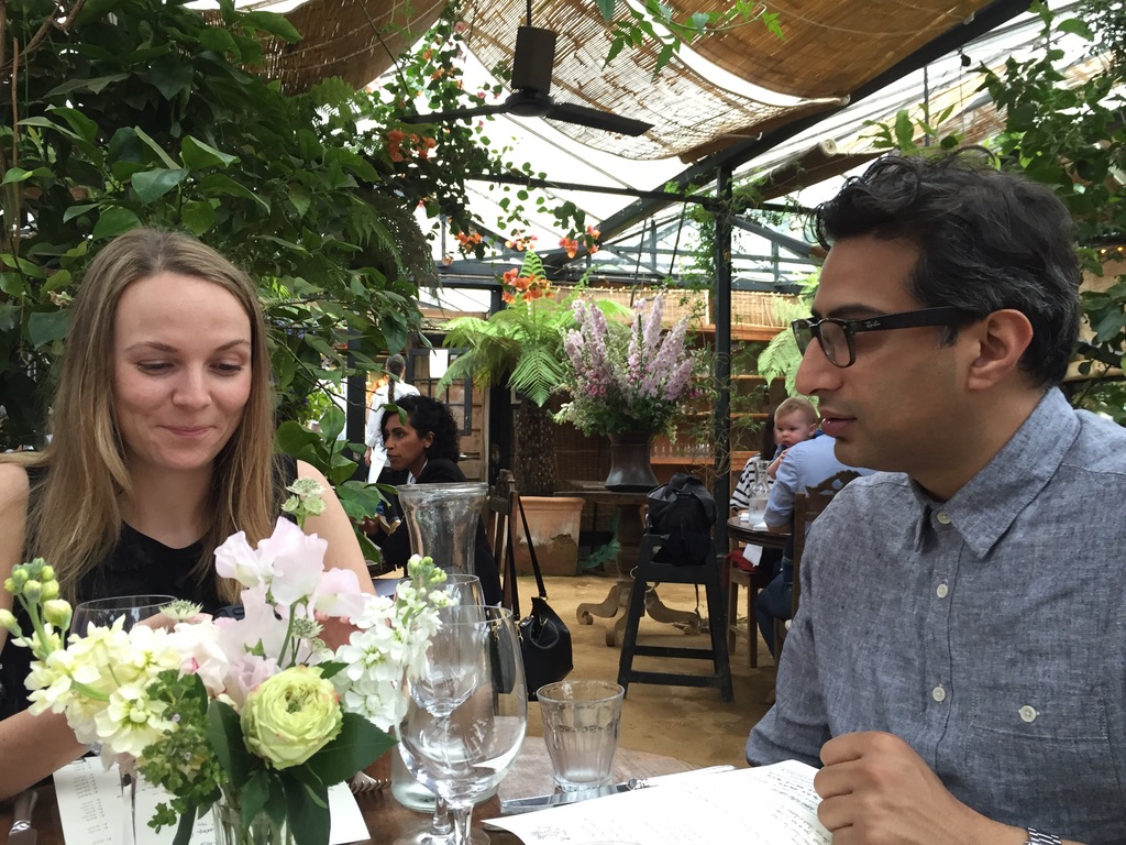 Woke up this morning and headed to meet Emma and Hem (the fiancé) at the Bank Street Tube Station — hopped on the Waterloo line and then on the train to Richmond where we headed to Petersham Nursery, in Richmond on Thames– A restaurant set inside a greenhouse amid a few acres of greenery and plantings. It’s a Michelin star restaurant.. and you are literally sitting among the plantings.. It was a bit overcast, so it must be delightful when the sun is out. Today was Emma’s birthday, so it was a bit of a birthday lunch. We had several wonderful appetizers including fried borage with chickpeas (squash blossoms); lasagnette with green beans and pesto; john dory; speckled hen cooked with mascarpone, prosciutto, romesco, and a few other things; and a great salad; and green bean side dish.. and for dessert which came adorned with the obligatory birthday candle: a lemon tart and also a cake with elderberry ice cream.. By the way, they were very big on using lemons.. Amalfi lemons.. I assume flown in from the Amalfi coast, but couldn’t really discern any particular taste.