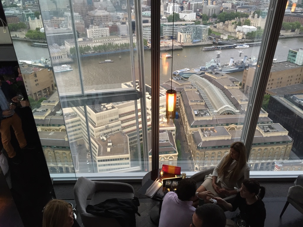 Dashed inside the hotel at about 4:30 — just enough time to shower and head to Borough Market to meet for two hours with a professor from Coventry University (who I met when I spoke at a symposium there in November). We met at Arabica, a bar and restaurant (where I was scheduled to have dinner at 8:30 with Mike’s niece and also my god-daughter). So off I went. Good conversation and then between drinks and dinner Emma (Mike’s niece) and I took a stroll to the Shard. It’s a 95-story skyscraper designed, I believe, by Renzo Piano. It’s part of the London Bridge area development. It’s more than 1,000 ft. high — tallest building in the EU — and includes restaurants, apartments, viewing floors, offices, shops.. their idea of a vertical city. It’s sort of a glass pyramid. I believe that it is owned by the government of Qatar! We went up to the 32nd floor where one of the bars is located and where we could take in a really great 360-degree view.. Then we walked back to the restaurant.