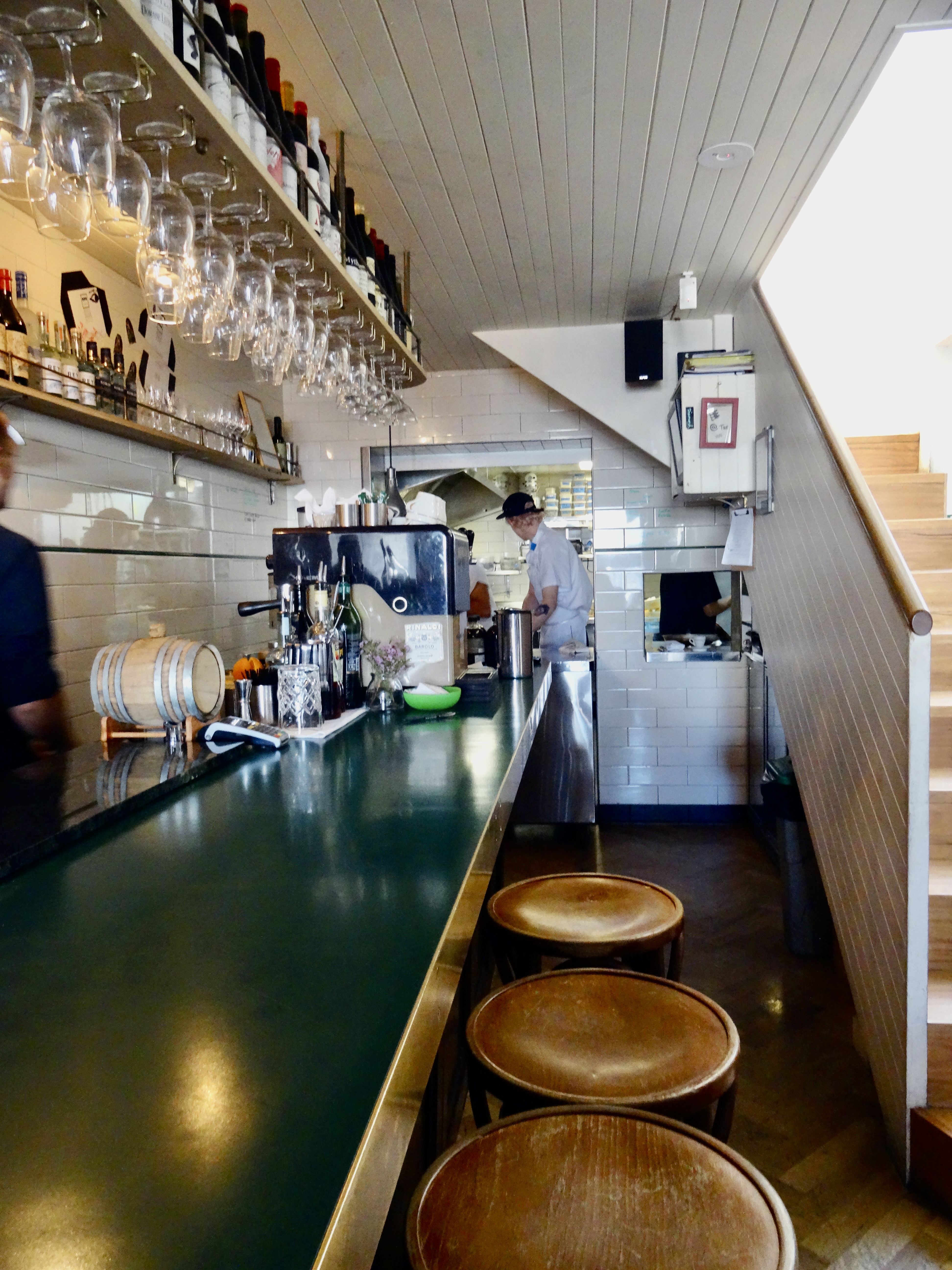I decided to take a ferry to the Opera House.. seemed like a good idea. But the walk to the ferry from the hotel is about 25 minutes and it was about 45 degrees. So I took a taxi to the ferry and then arrived by boat which was fun and gave a great series of views of the Opera House along the way. Once you emerge from the ferry at Circular Quay the walk is only about 4 minutes.. .and then you take an escalator to the lower level which is packed with upscale restaurants (the famed Bennelong Restaurant is on an upper level — I didn’t venture there because the prix fixe menu is $175 without any wine. So I decided to eat at the Opera Bar — food was good and atmosphere good with great water views if you chose an outdoor table! I ate inside since all the outside tables that had heaters were taken.